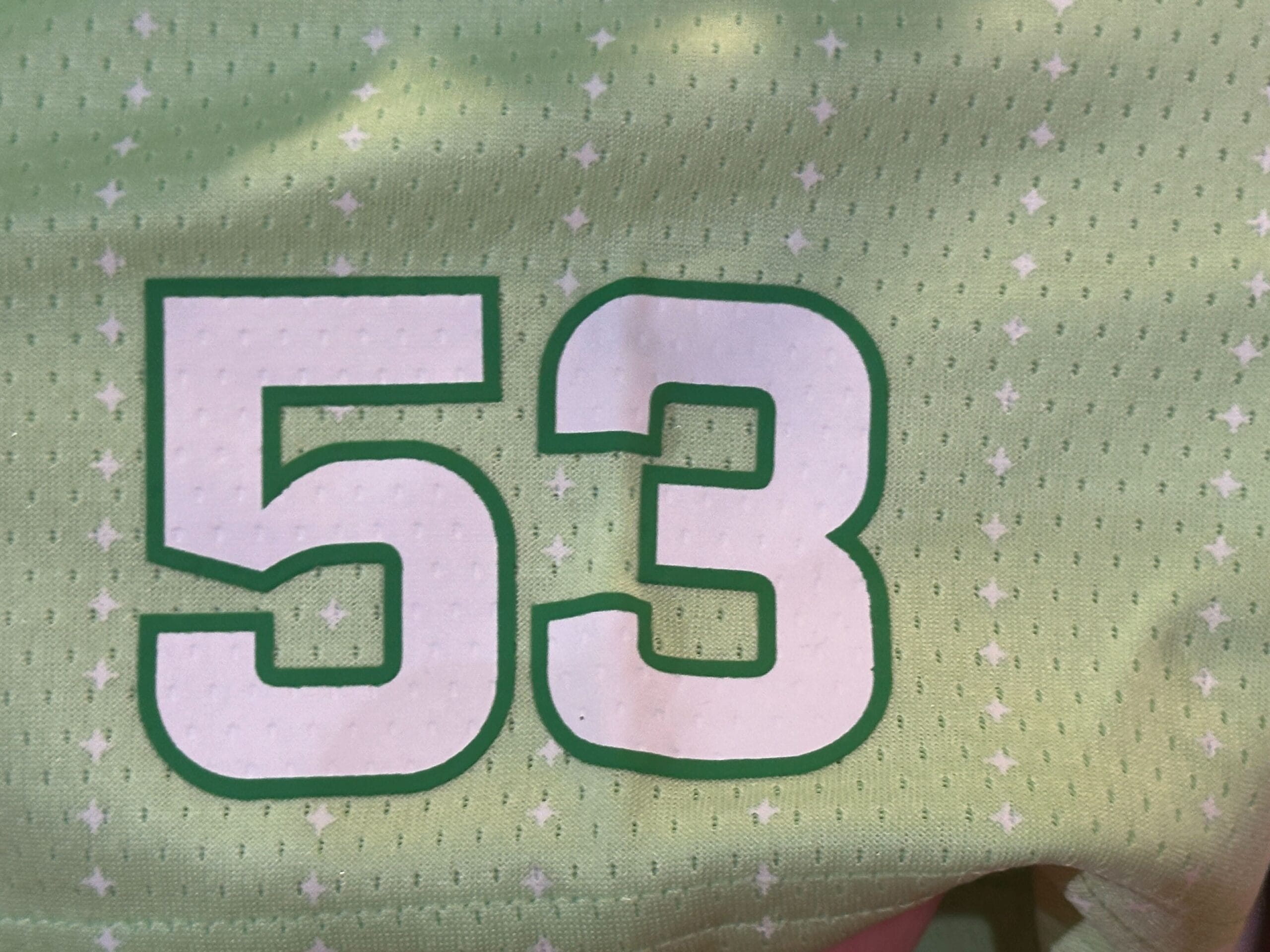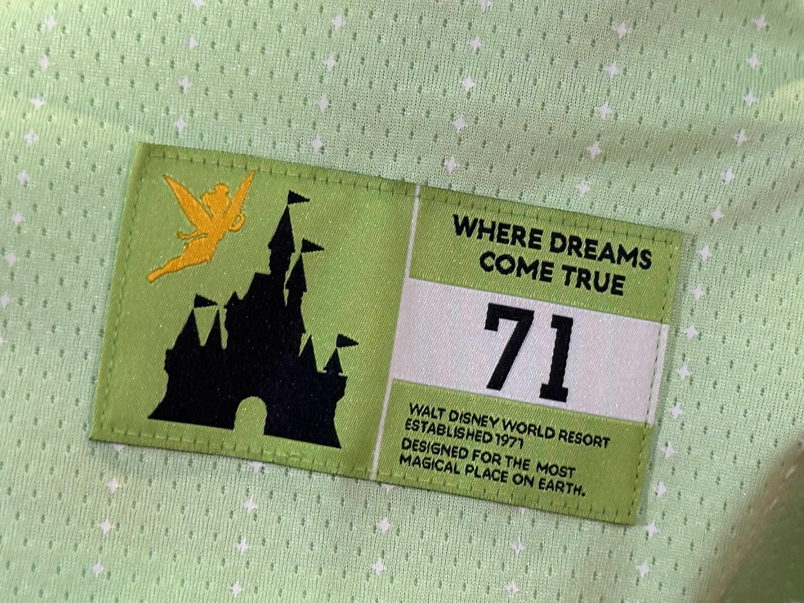 Tinker Bell is pictured on the back of the jersey with her nickname, “Tink.” It’s across the shoulders, above a large “53” appliqués.”
