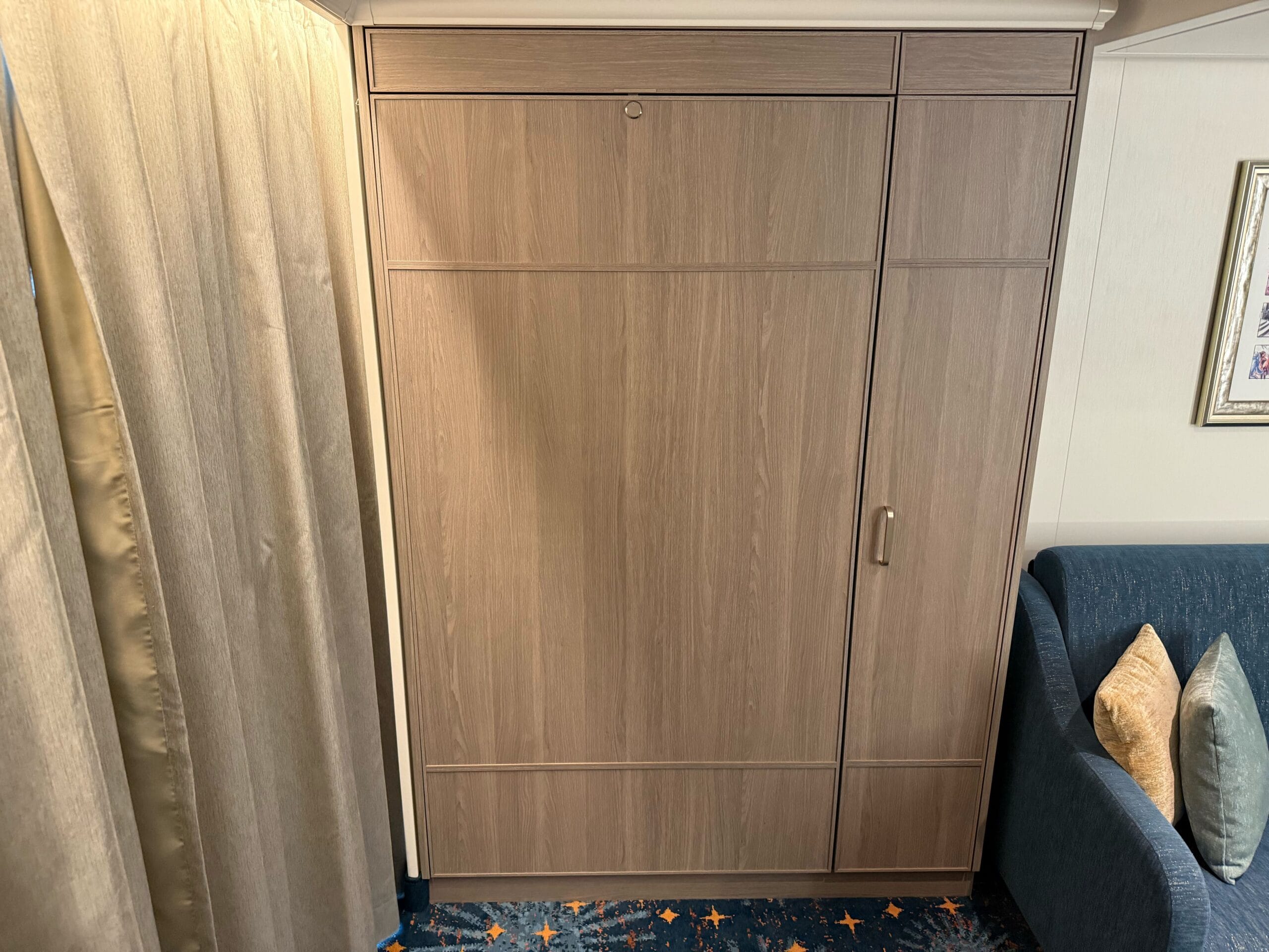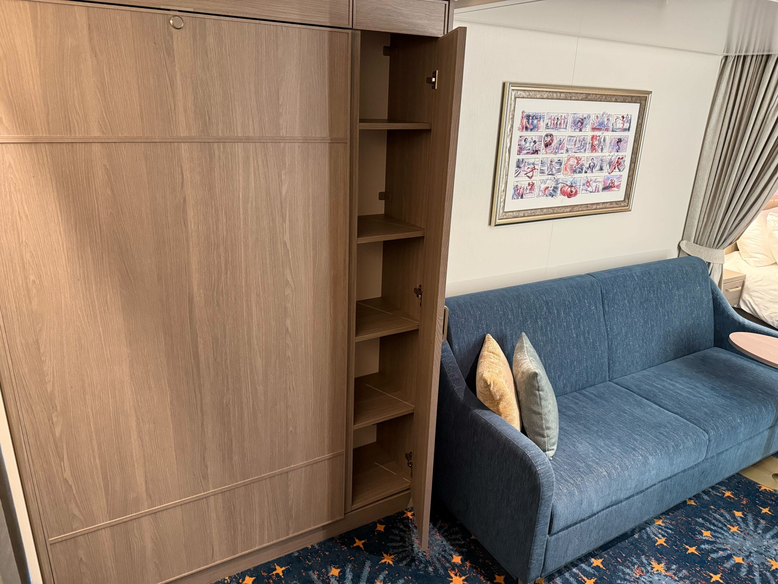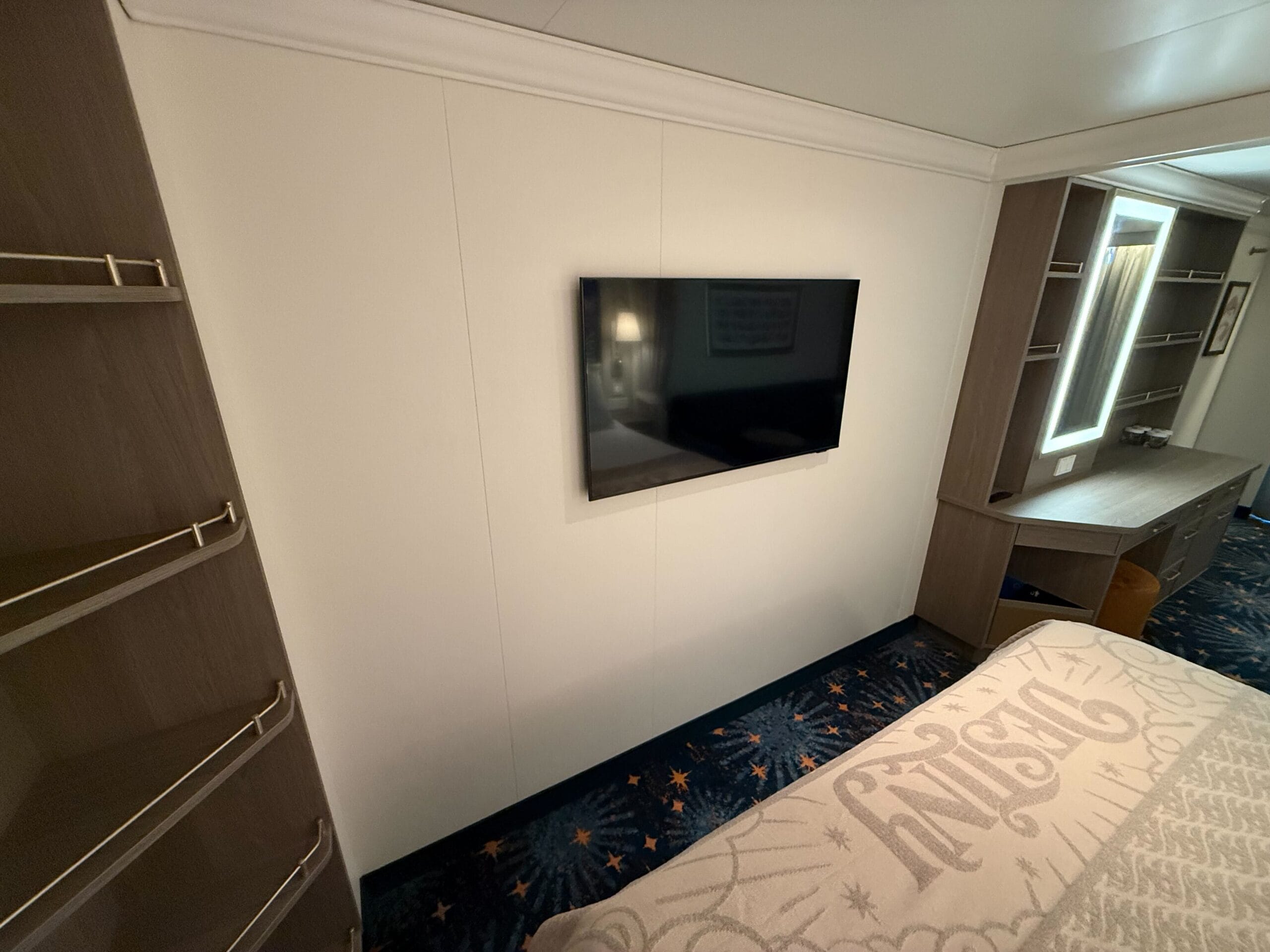 Across from the queen bed is a 43″ TV. Our one complaint about these staterooms is that, similar to the Disney Treasure, this wall seems pretty empty around the TV.