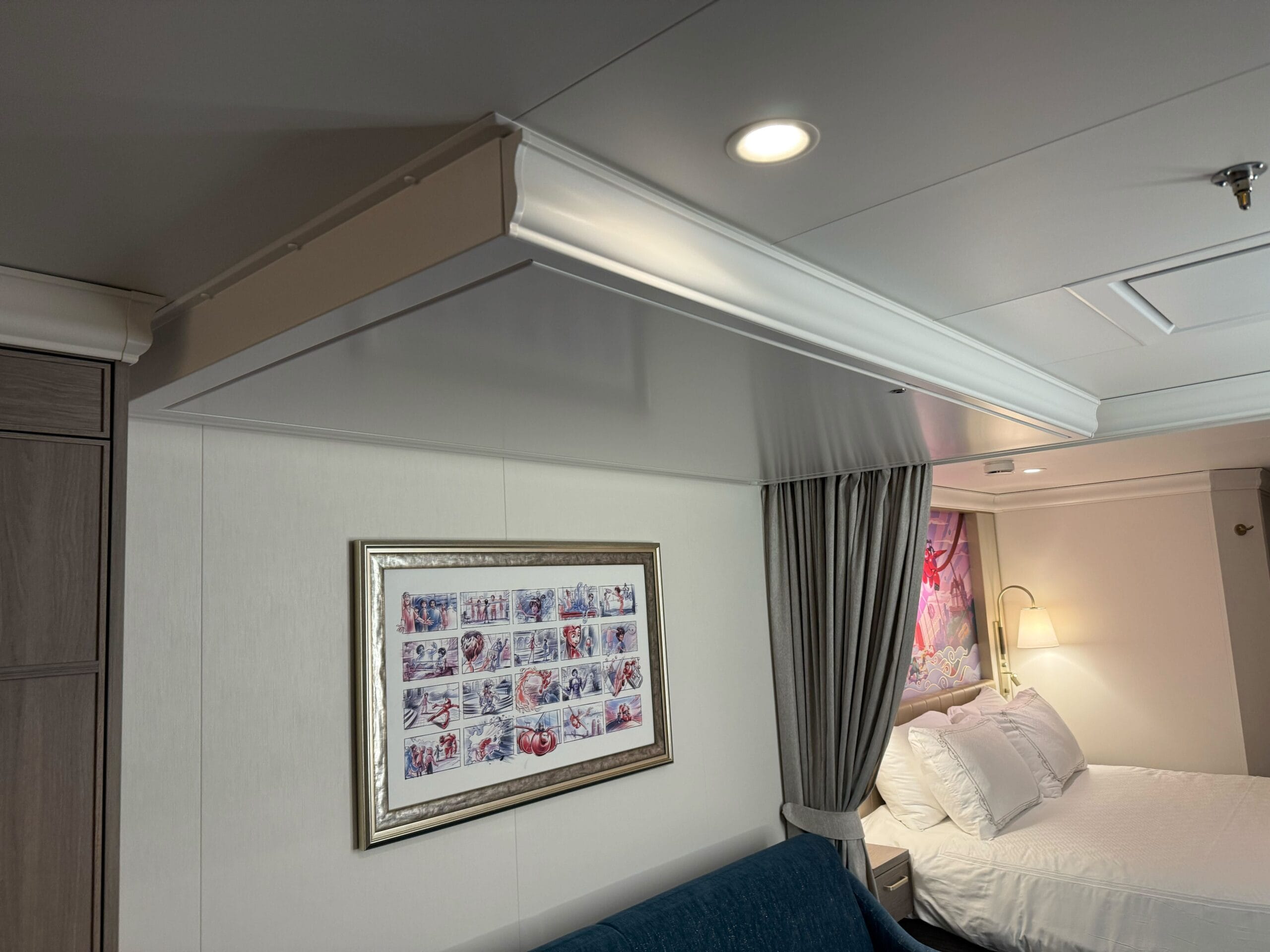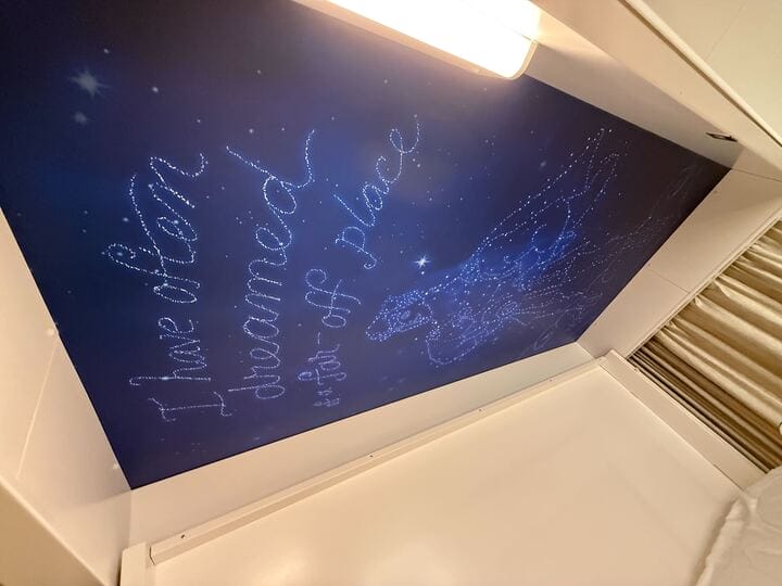 The ceiling has Hercules artwork when the berth is pulled down. Even though this is a Big Hero 6- themed room, the constellation scene spells out “I have often dreamed of a far off place” and has an image of Hercules.