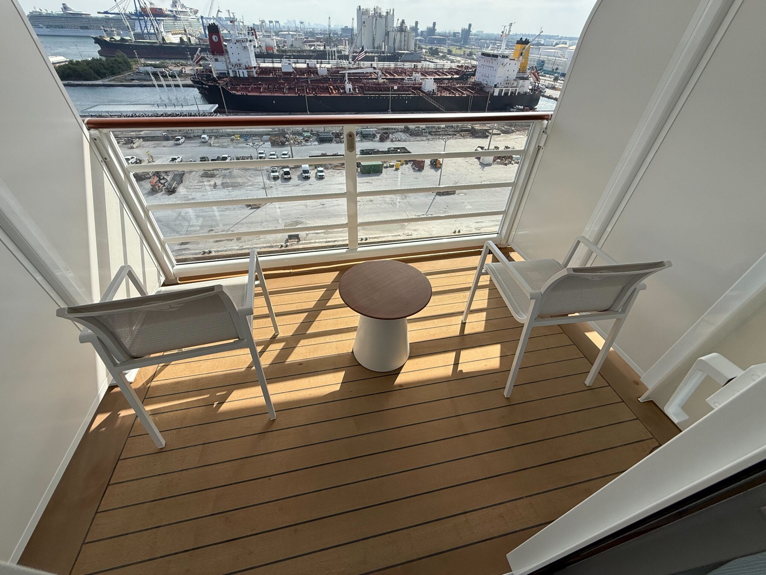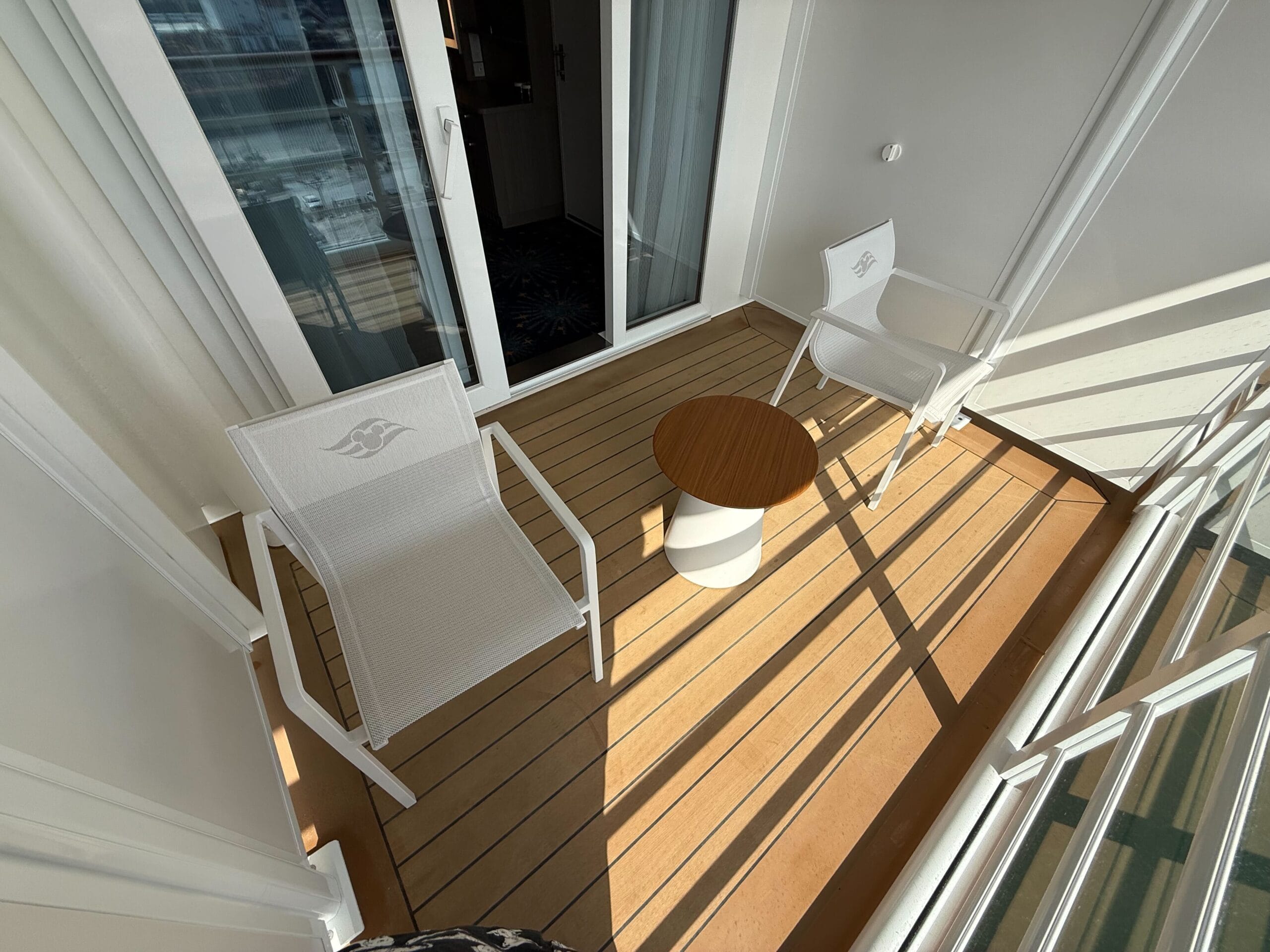 The verandah has two chairs, a small table, and deck lighting. The chairs are white with the DCL logo on the back.