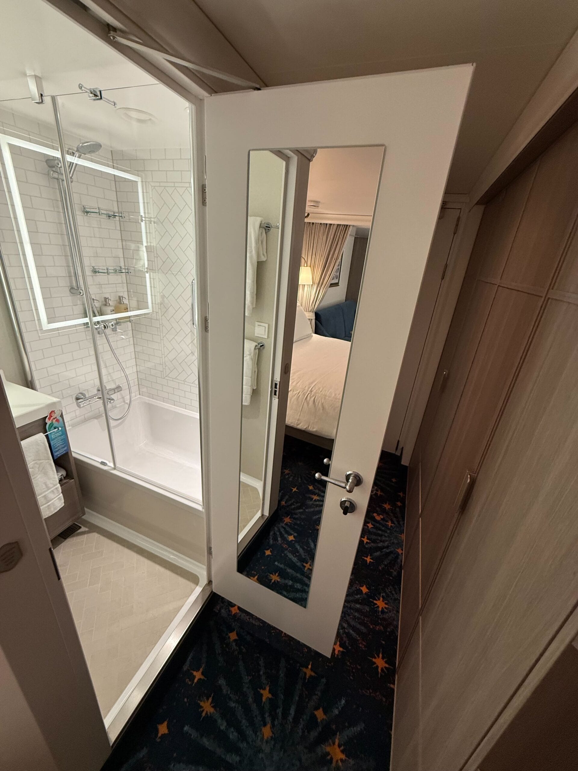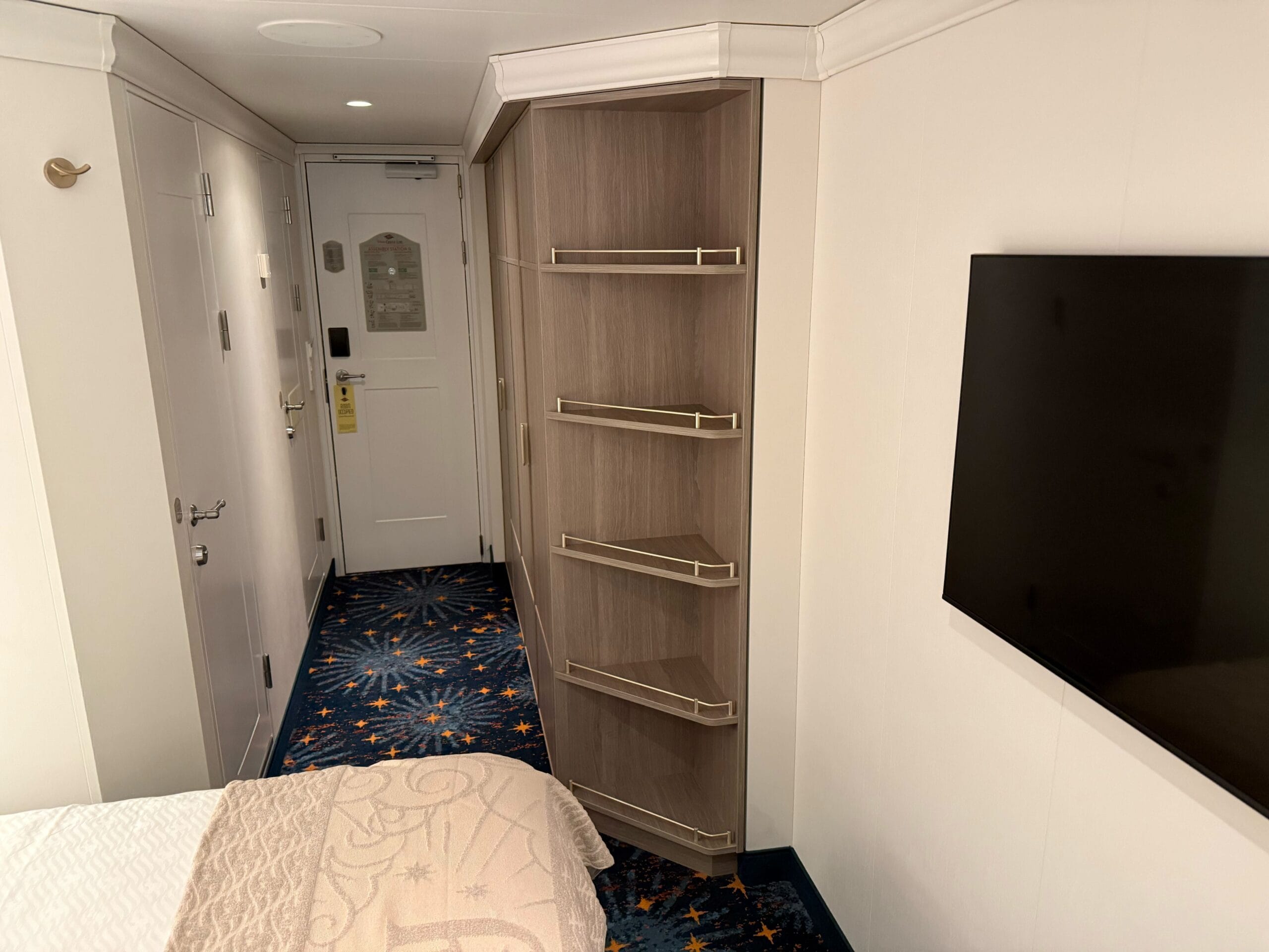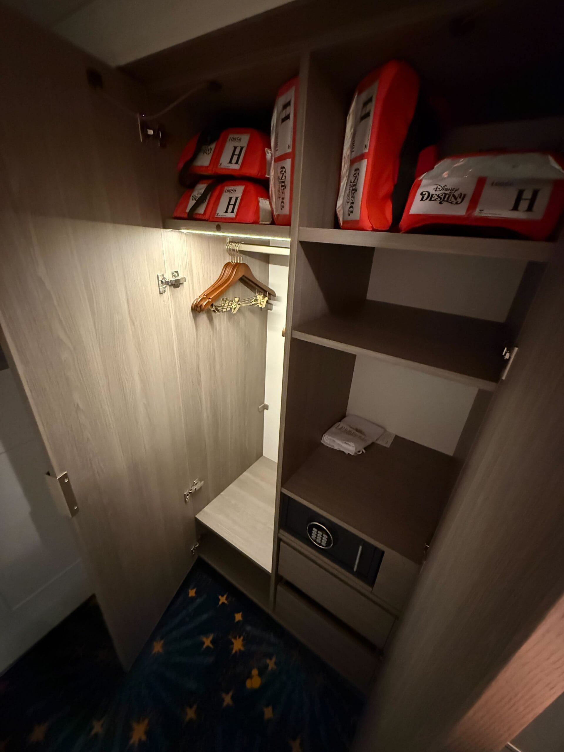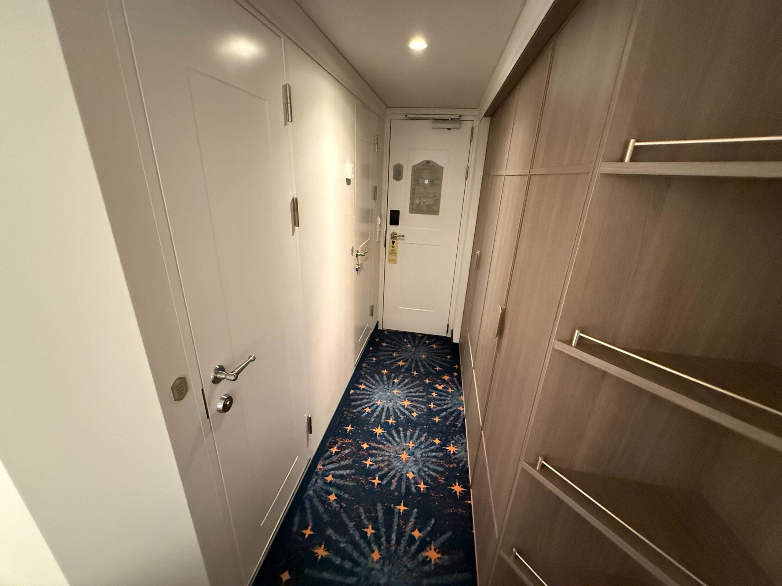 The stateroom number has a Baymax detail letting guests know their stateroom is Big Hero 6-themed. The entry leads into a small hallway with two closets on one side. The closet lights activate when you open the door.
