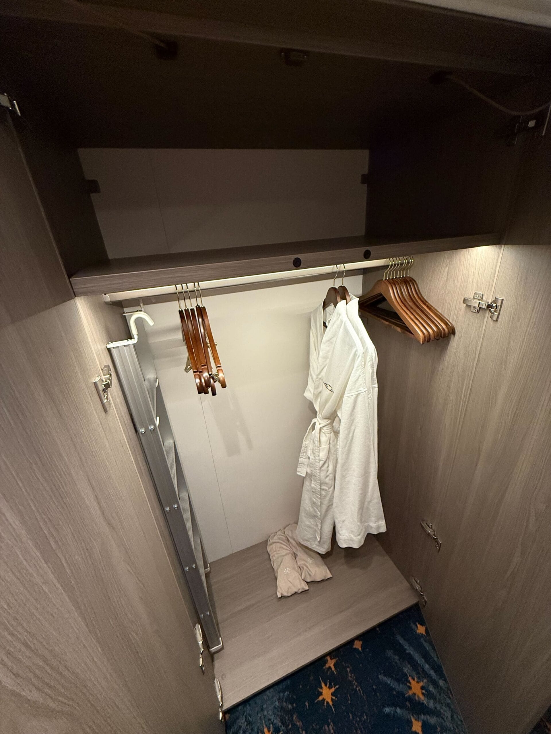 At the end of the closet unit is a stack of triangular shelves. These have a small rail to keep items from falling from the motion of the boat. On the opposite wall is a clothing hook.