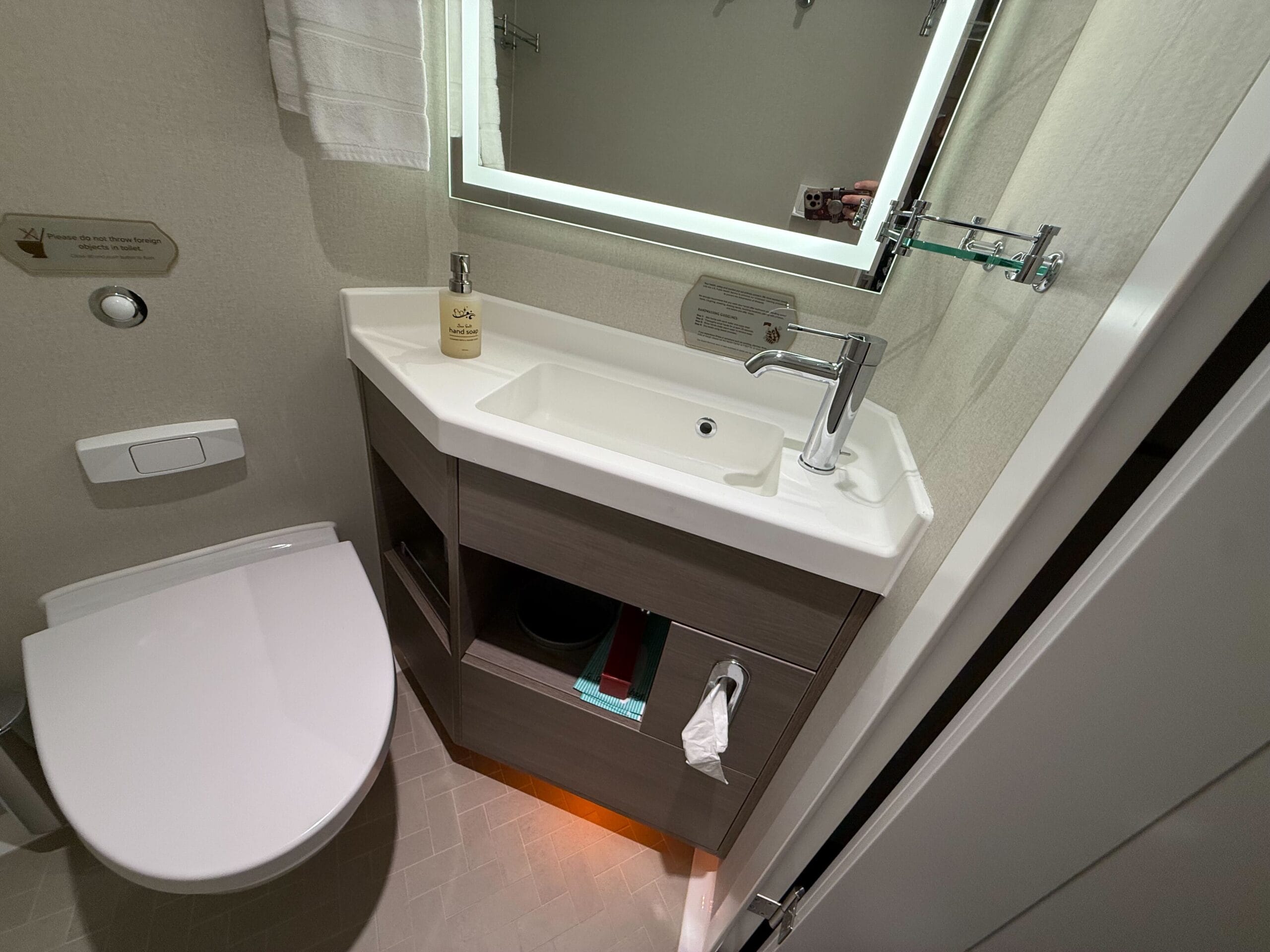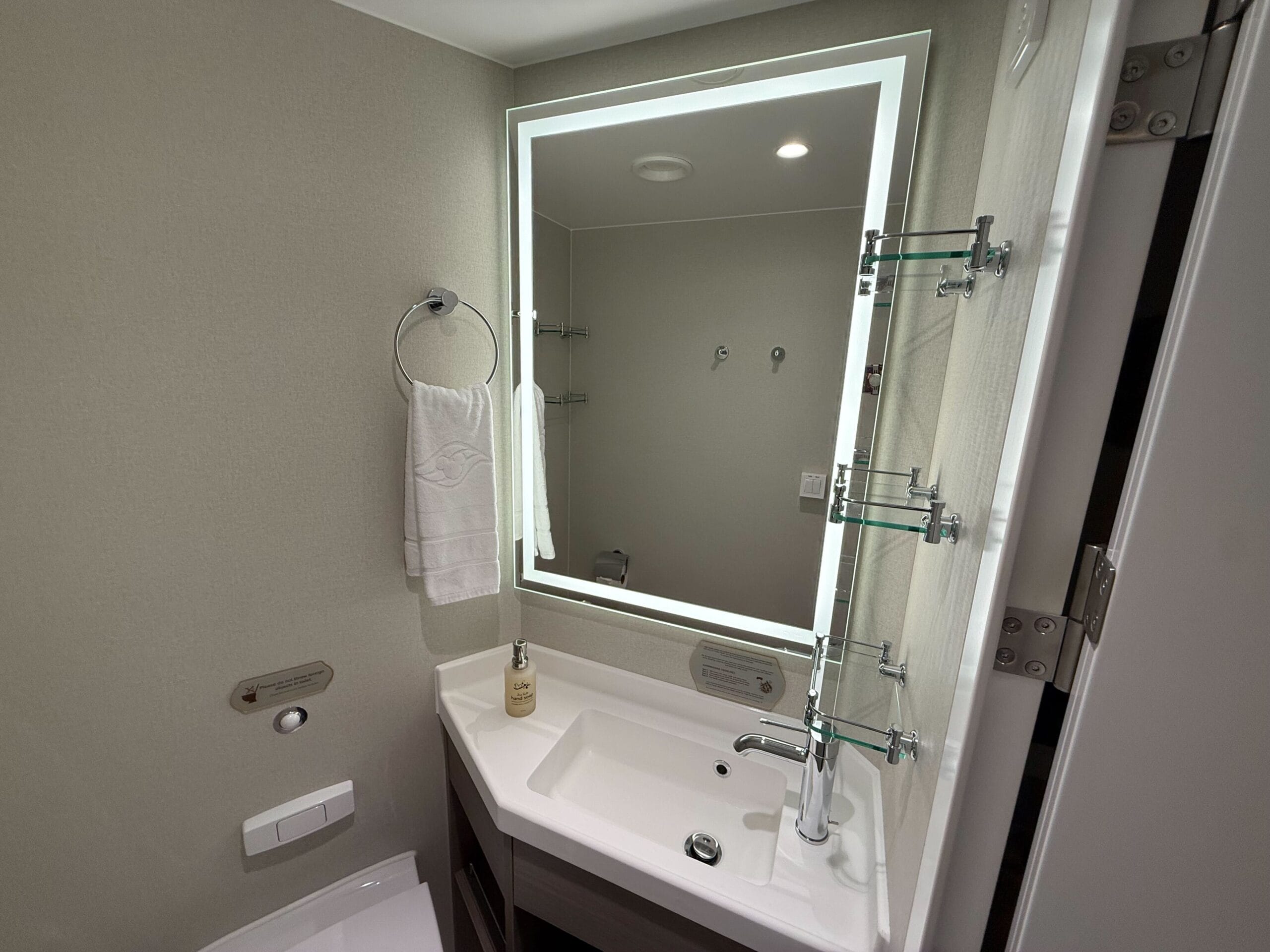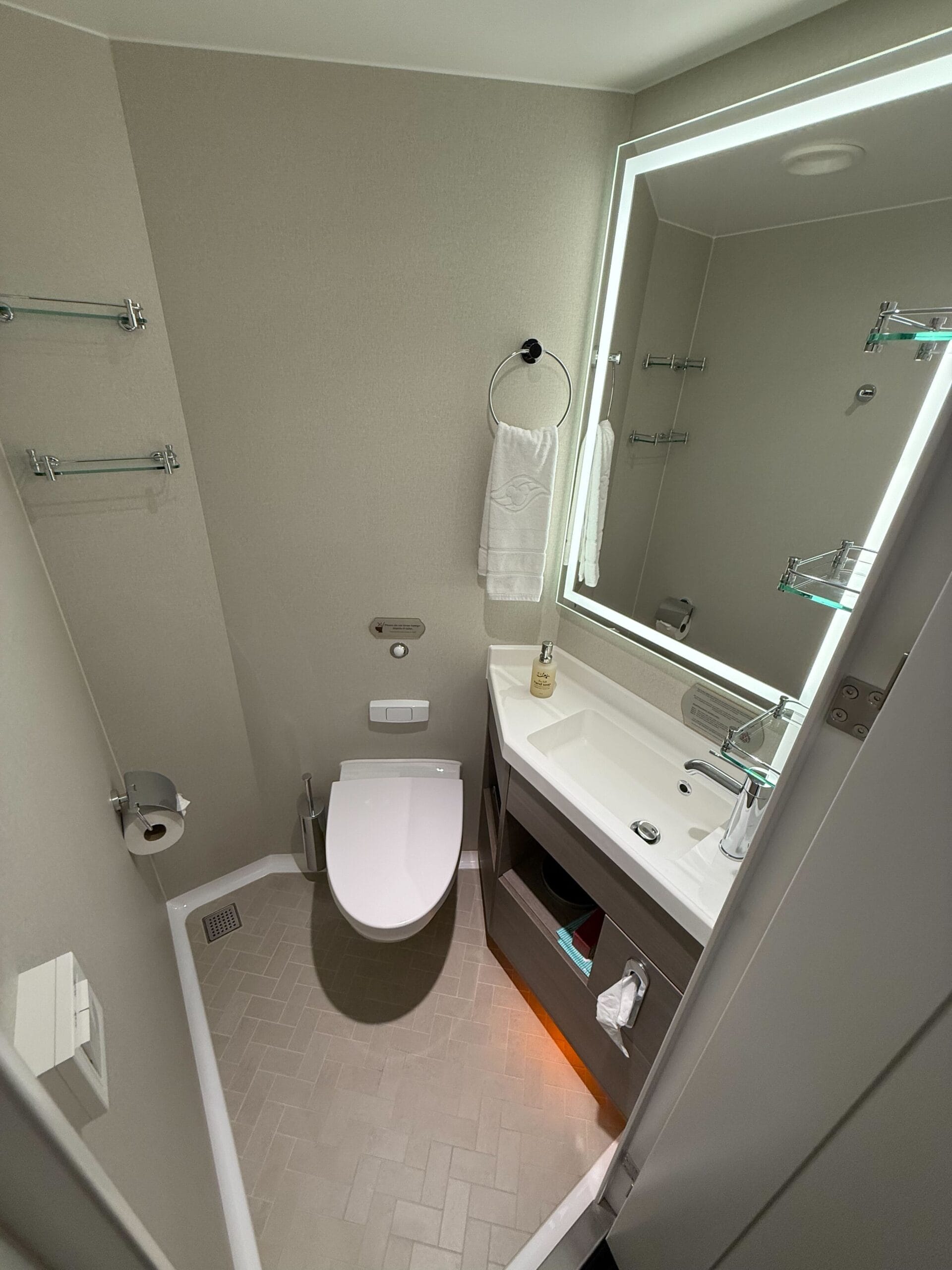 The one closest to the entry door has the toilet and sink. It has a nightlight option and the mirror above the vanity also lights up. Three glass shelves with rails are mounted to the wall by the sink, with a towel ring on the opposite side.