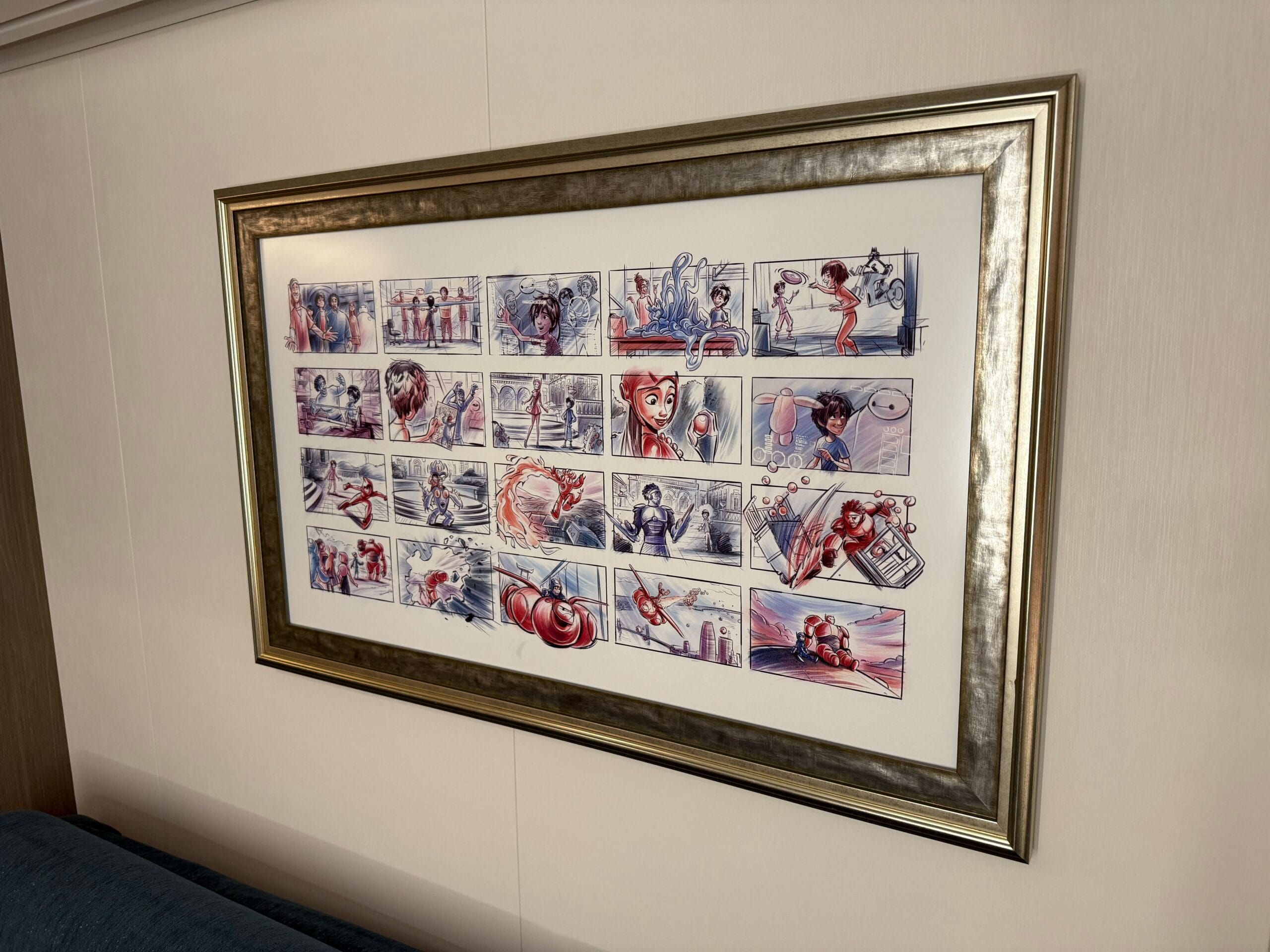 When not being used as a sofa, framed artwork featuring sketches of Big Hero 6 characters is on display.