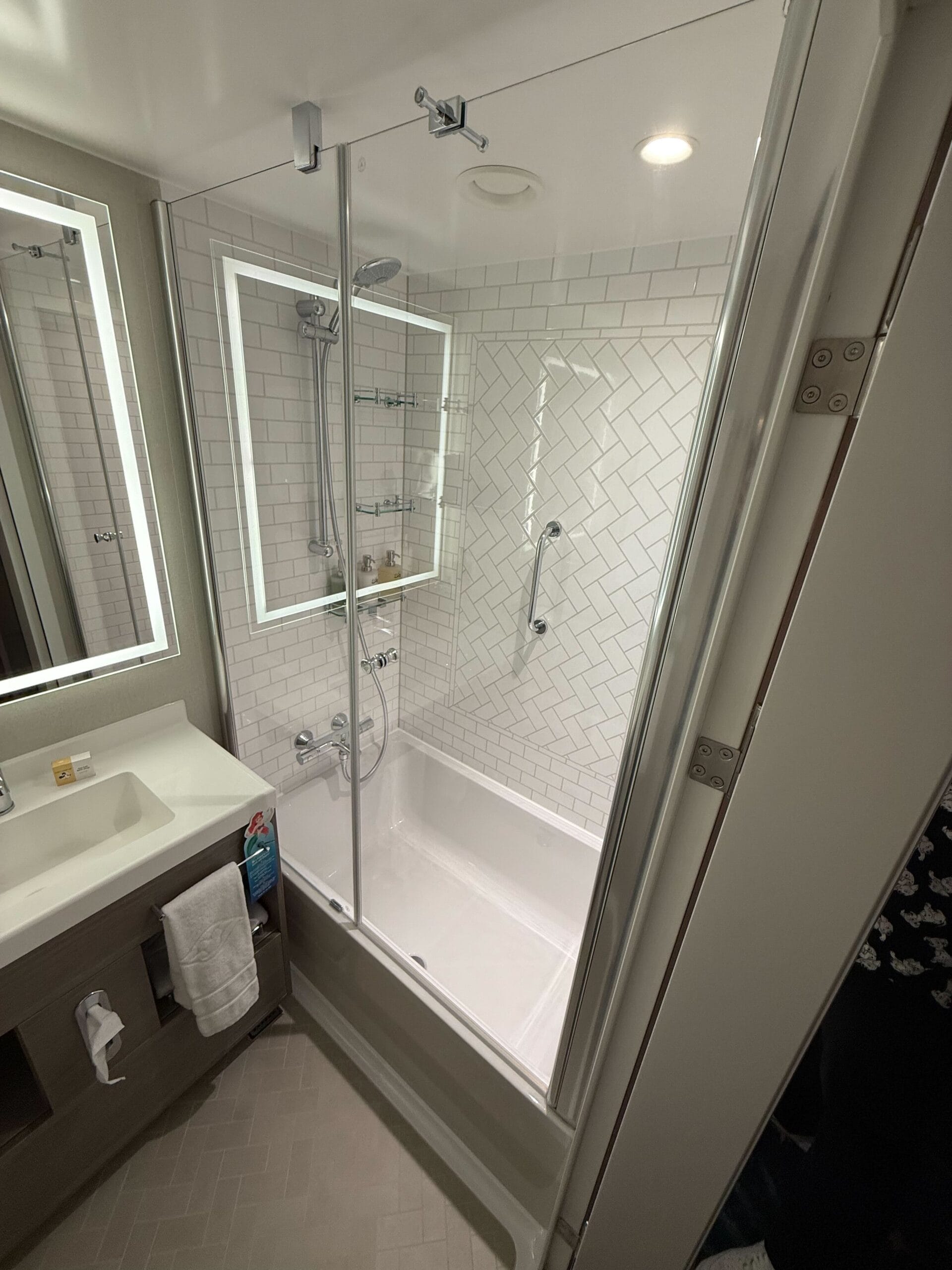 You’ll notice in the first Incredibles photo above, this is the Deluxe Oceanview with Verandah, which does not have the single wall pull-down bed next to the sofa. The only difference between the Deluxe Oceanview with Verandah and Deluxe Family Oceanview with Verandah is the additional bed (and thus, square footage). Both staterooms include the same split bathroom layout and private balcony, among other features.