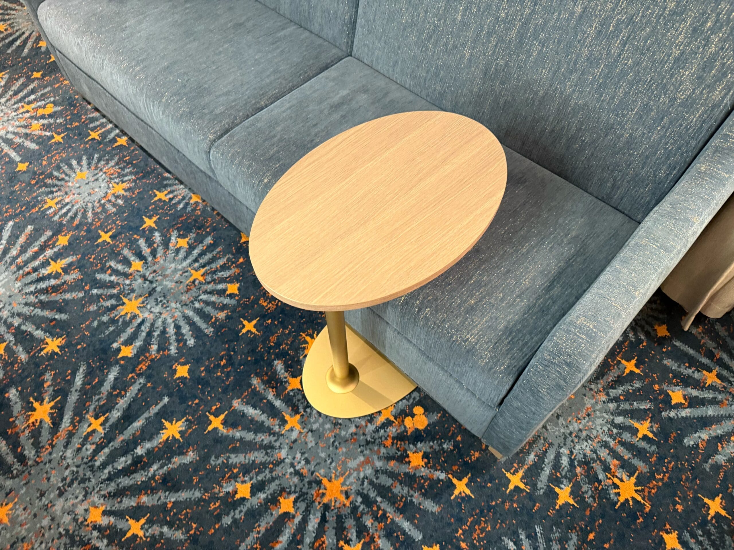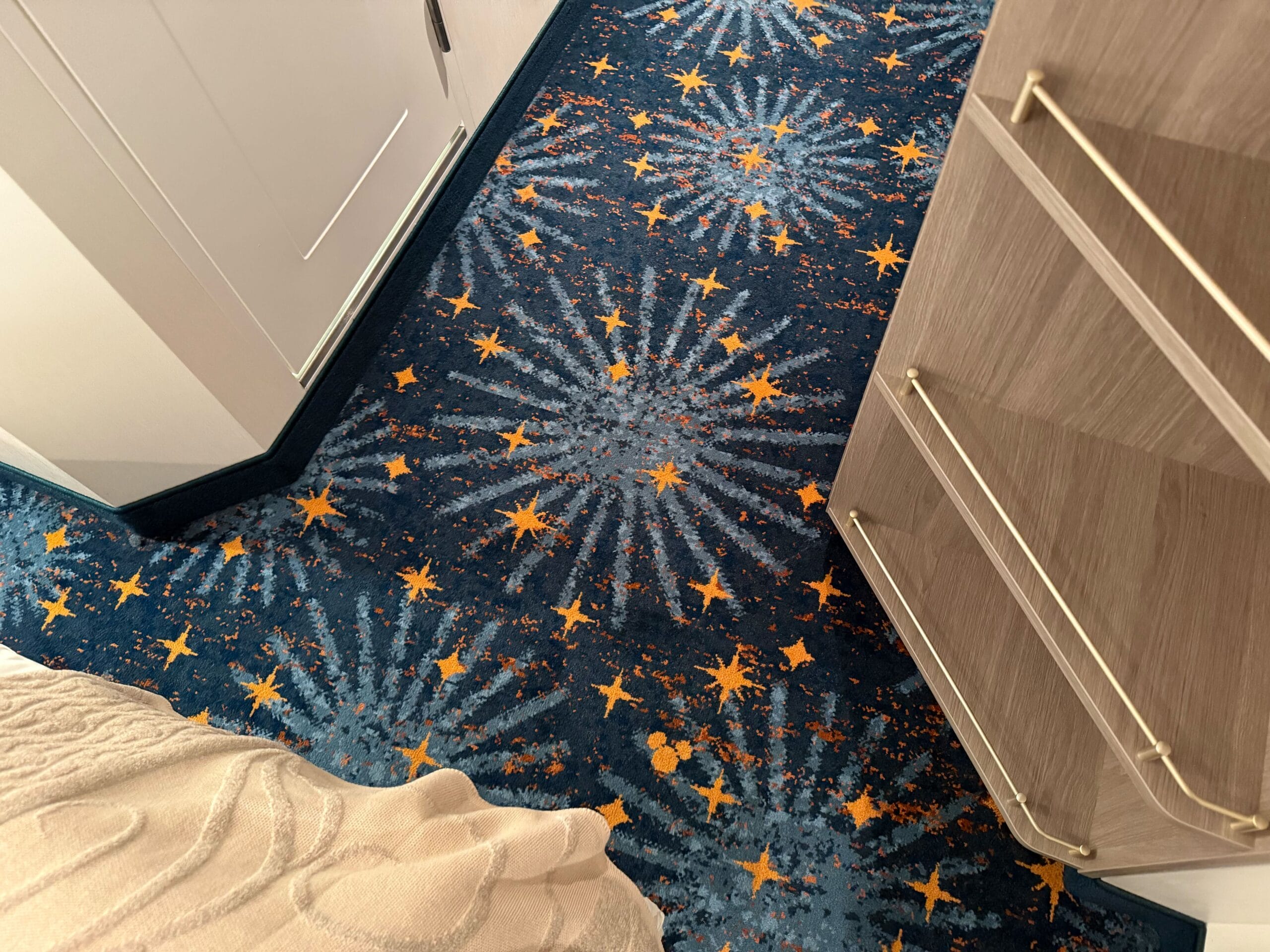 The carpet is a deep blue with lighter blue sunbursts, yellow stars, yellow Mickey icons, and orange designs.