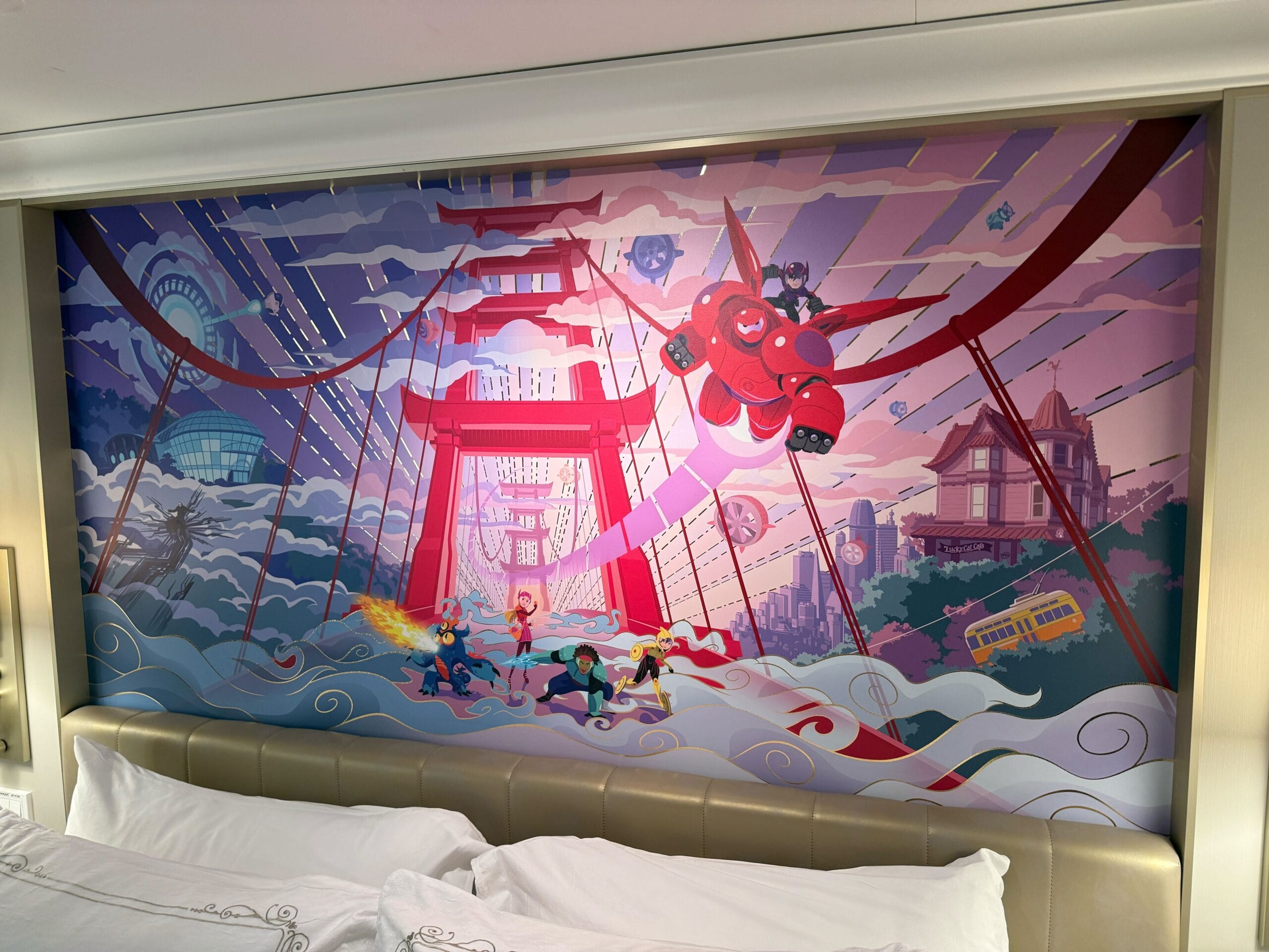The headboard features a scene from Big Hero 6, with Hiro, Baymax, and other characters flying over San Fransokyo.