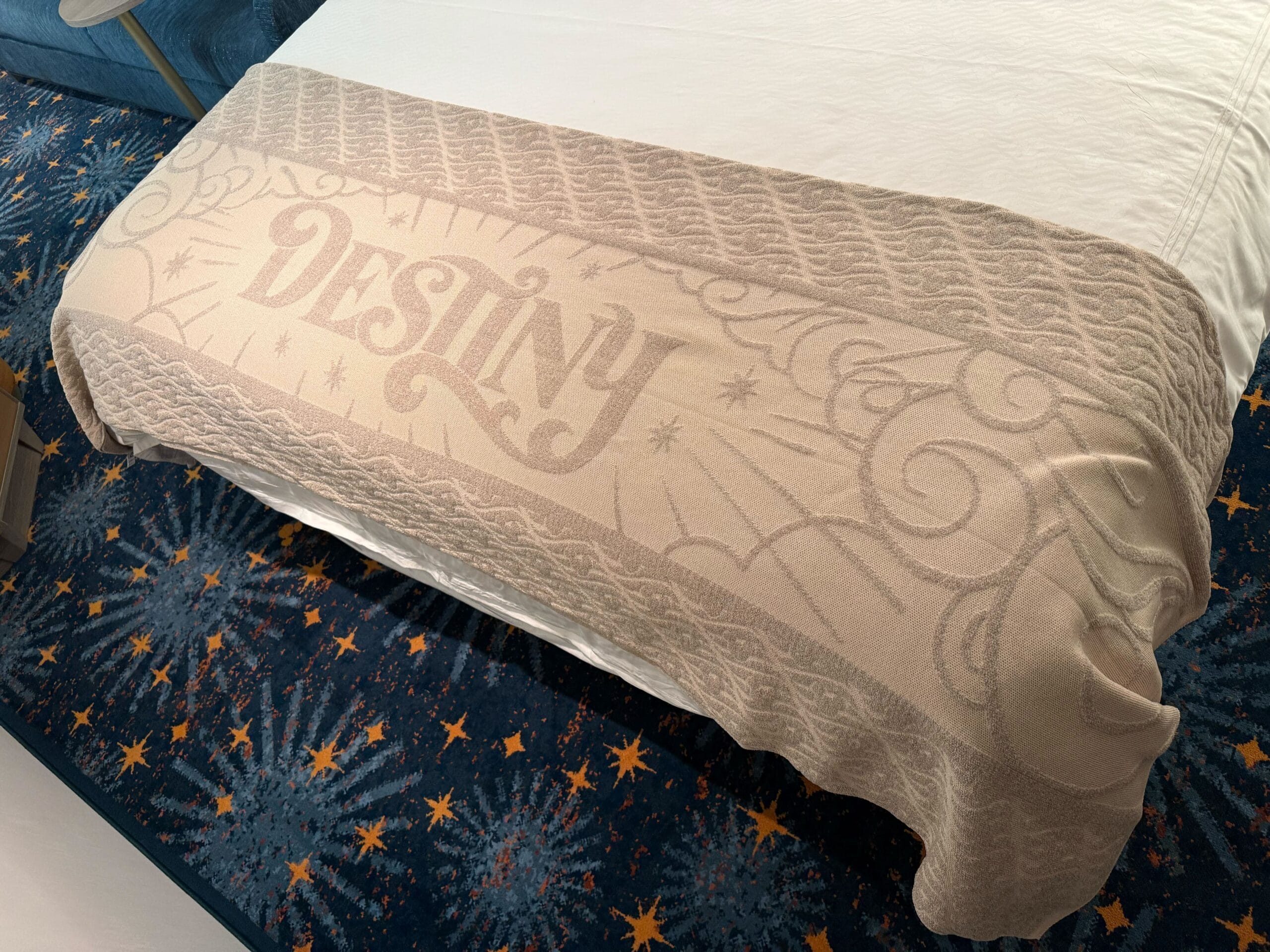 The sheets are white with a subtle pattern of the DCL logo. The pillowcases feature the same pattern and have golden borders featuring hidden Mickeys. The bed runner is tan with the Destiny logo in the center. A pattern of clouds and stars is on both sides of the logo.