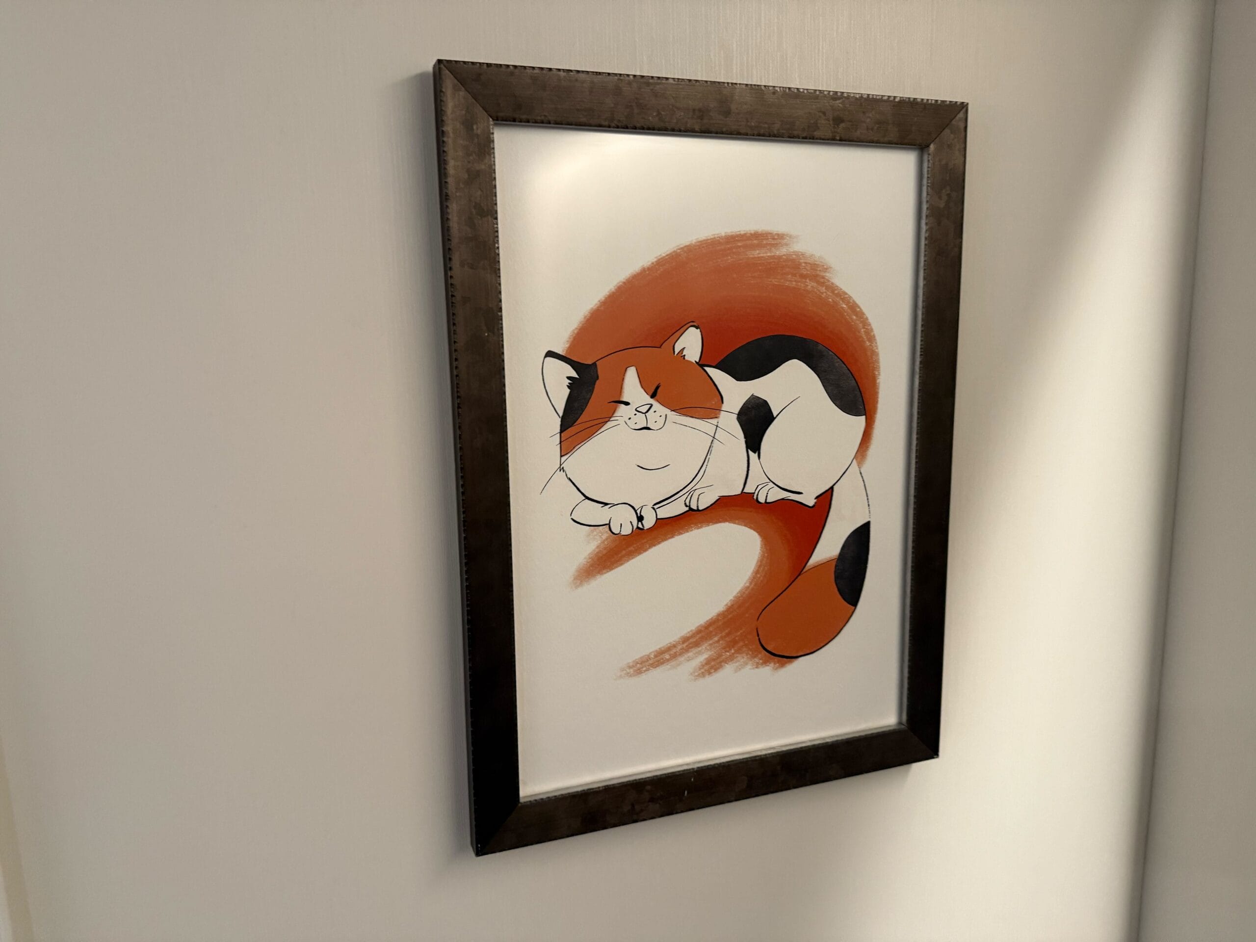 Framed artwork next to the verandah shows Mochi taking a nap.