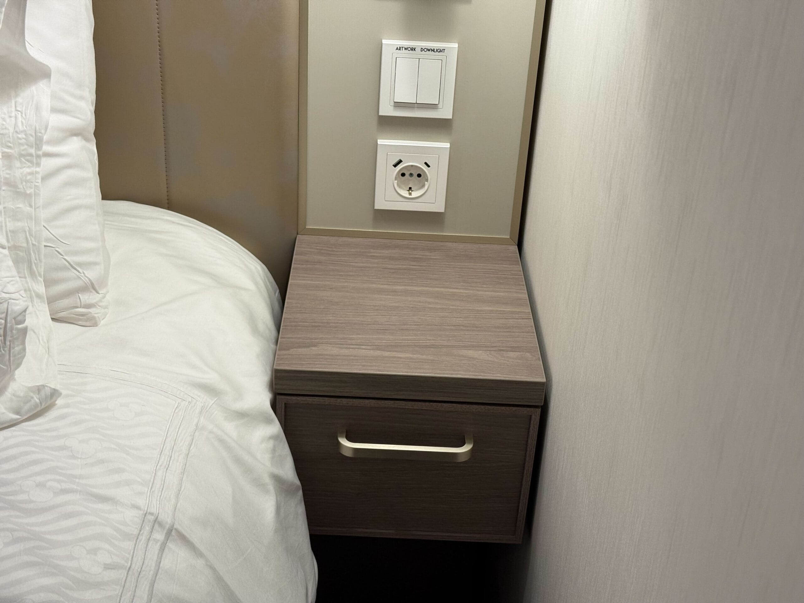Both sides of the queen bed have small mounted end tables with drawers. The room is equipped with USB and USB-C charging ports as well as standard outlets. One side has a European-style outlet.