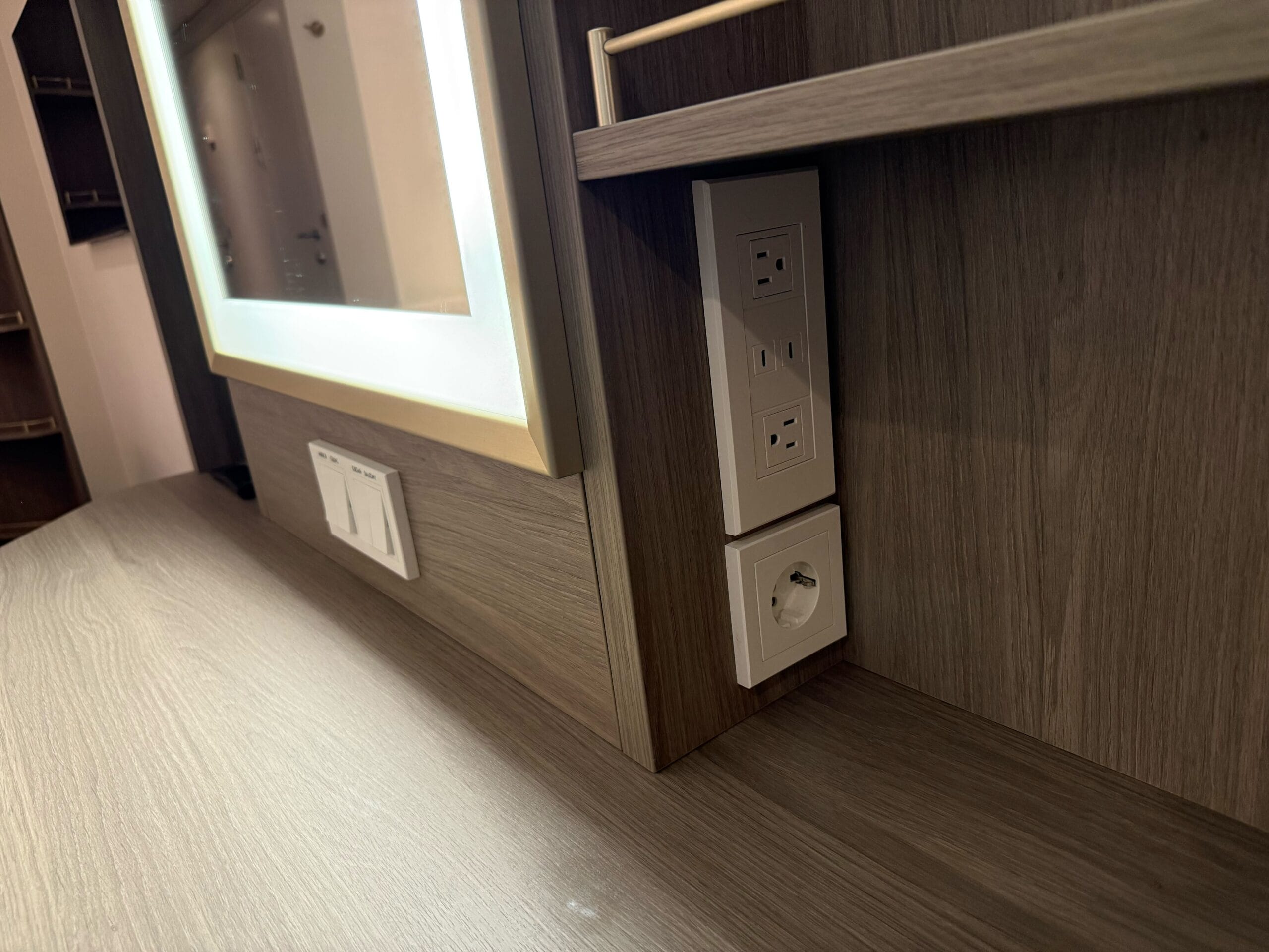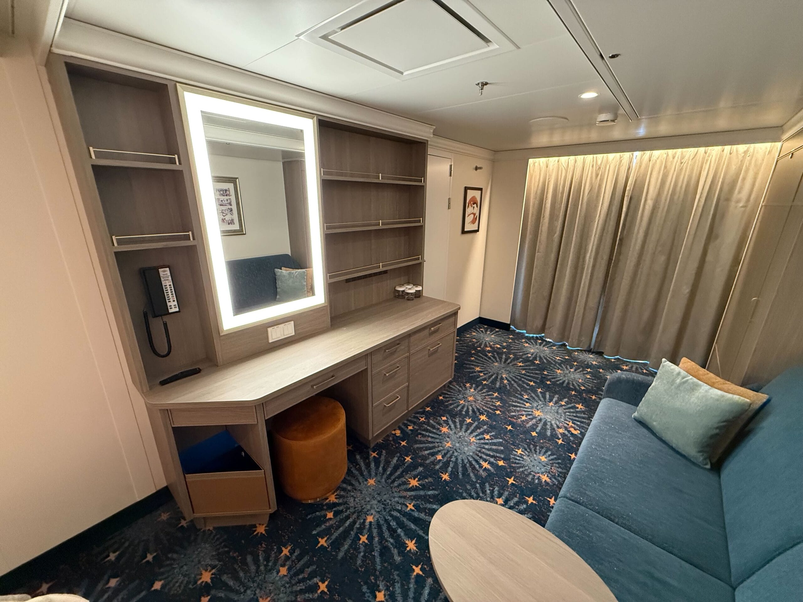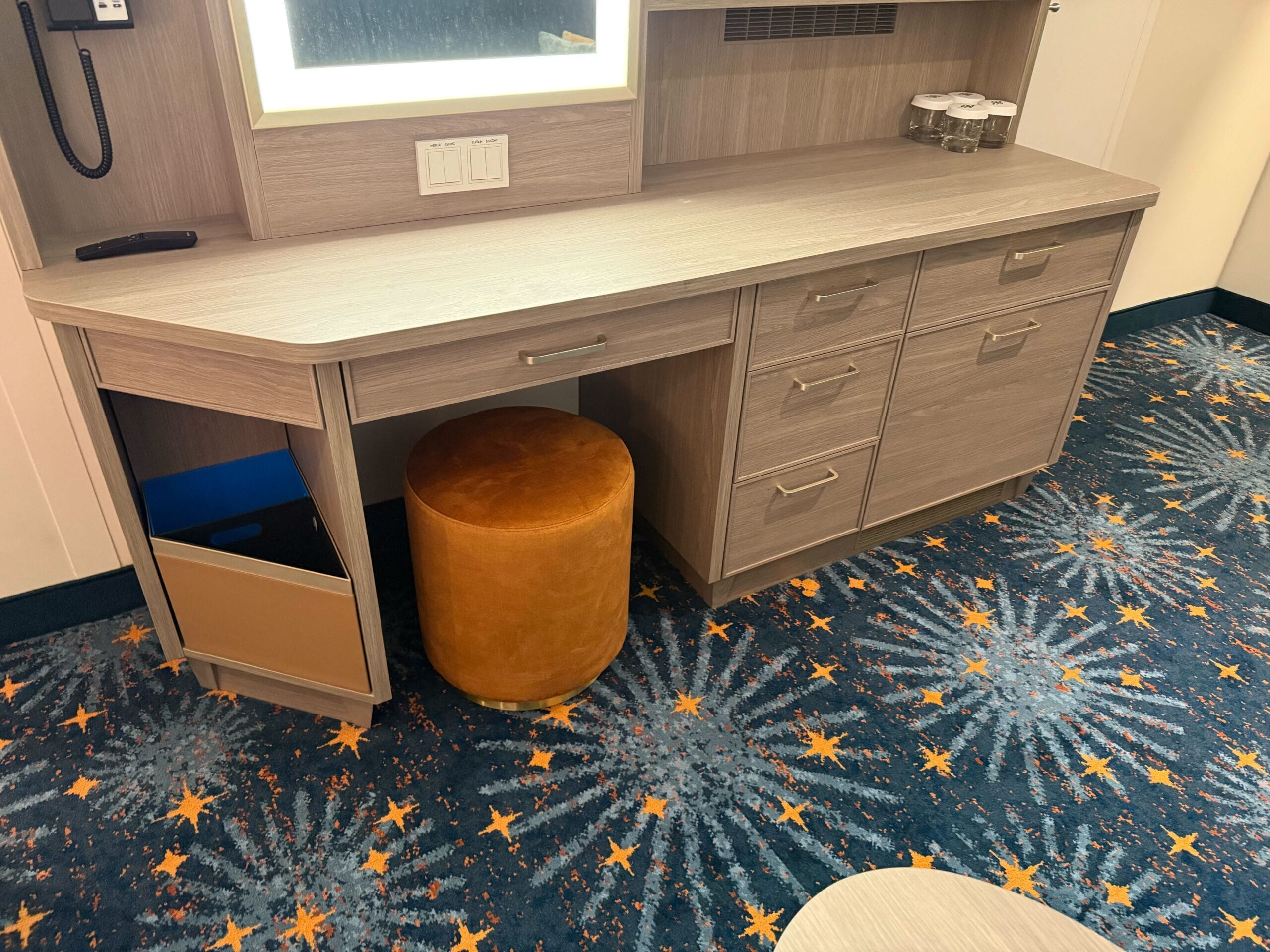There is a vanity with shelves and drawers on the other side of the stateroom. Here is where you will find the telephone. The mirror lights up and there are more outlets for charging your devices. A small brown stool tucks under the vanity when not in use.