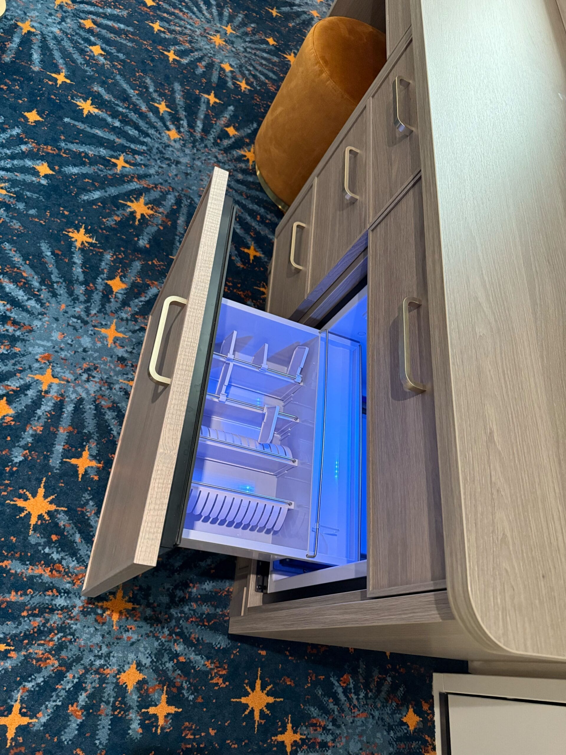 The hair dryer is stored in the vanity drawer here rather than in the bathroom. There’s also a mat for placing heated styling tools. Another drawer holds the mini fridge.