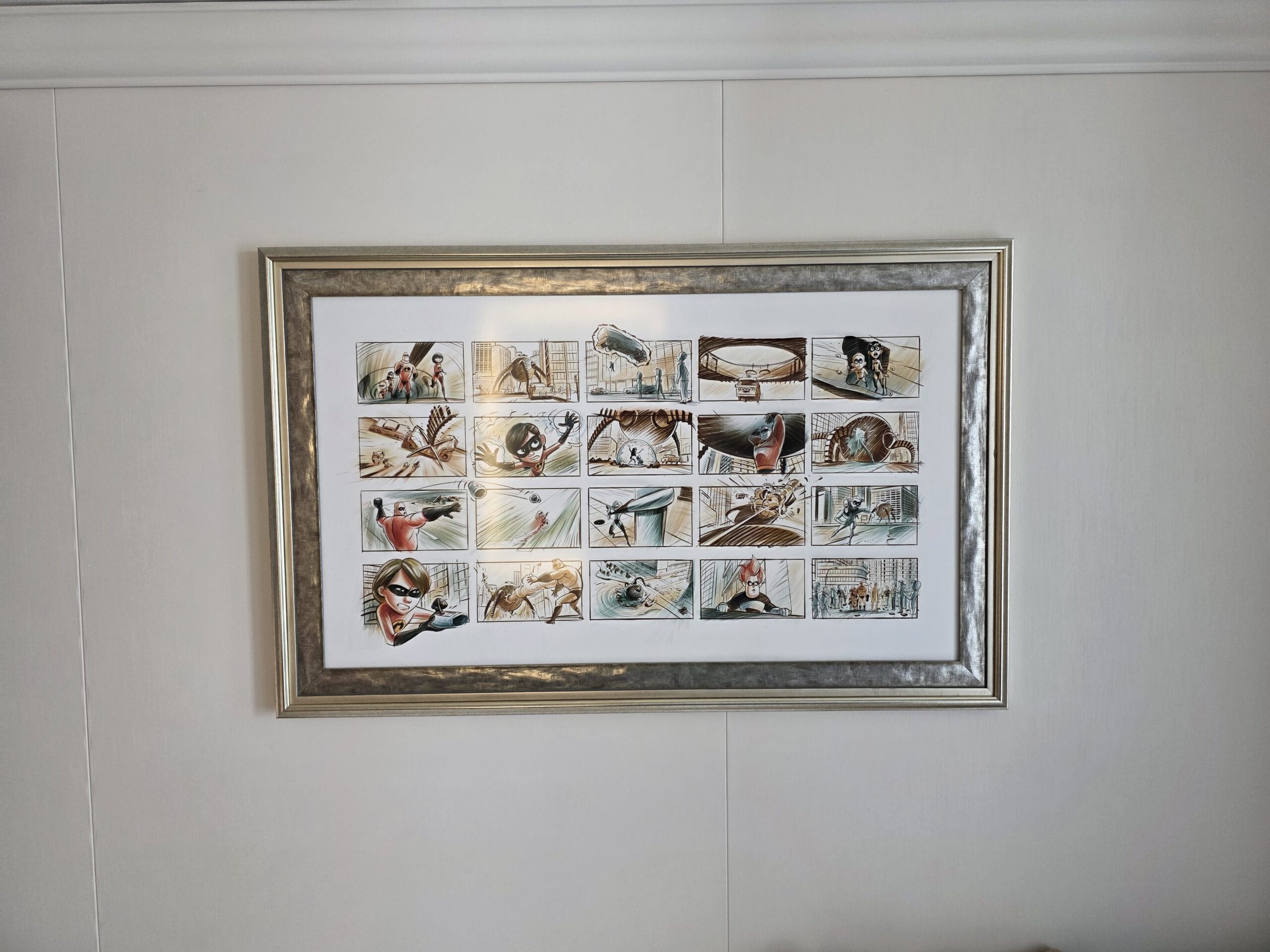Inside the Incredibles room, a scene depicting all the characters is on the artwork behind the bed. Behind the sofa, sketch-style comic book scenes hang on the wall in a framed photo.
