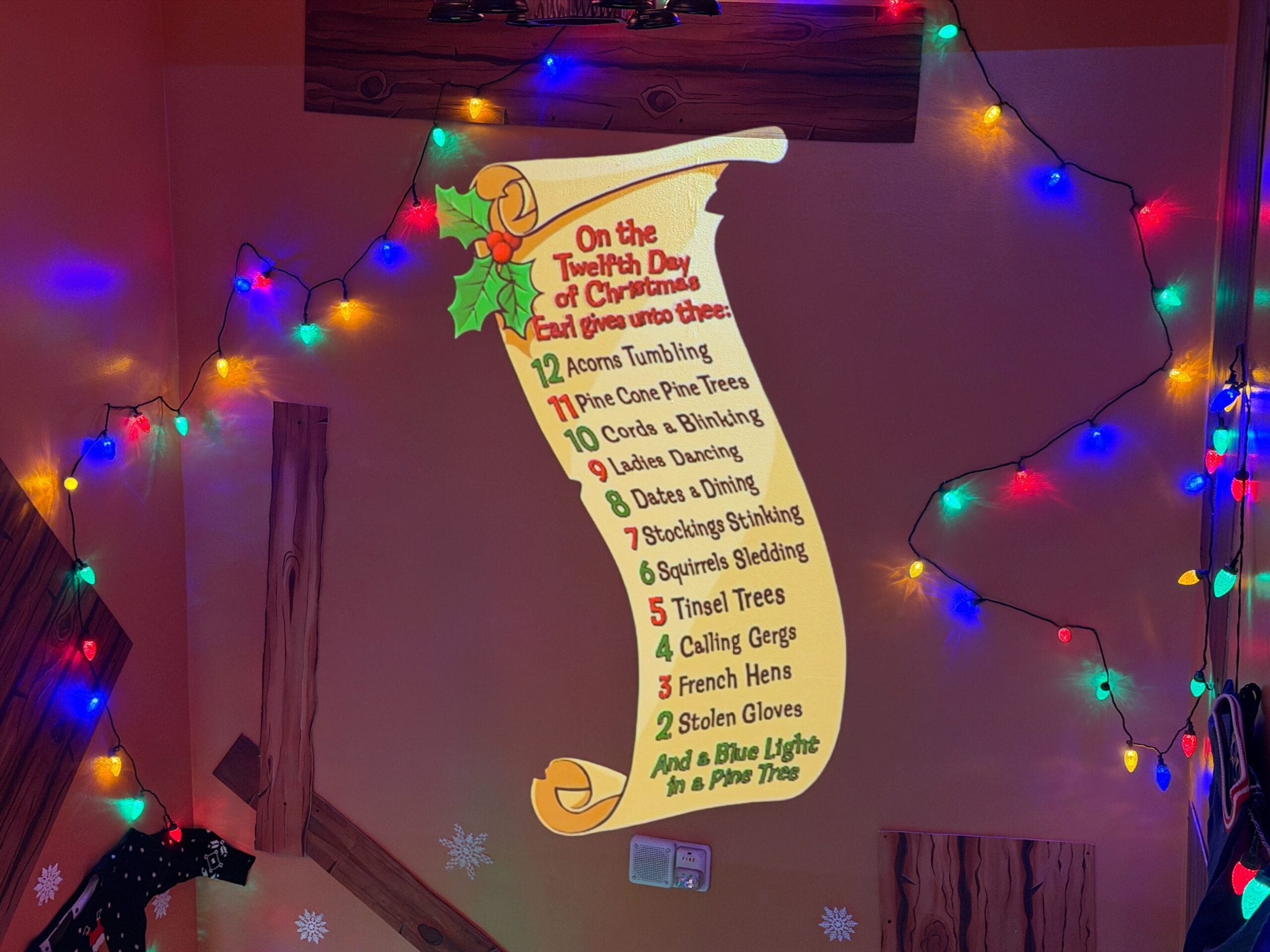 An Earl-style “12 Days of Christmas” list is projected onto the wall with items like “acorns tumbling” and “a blue light to a pine tree.”