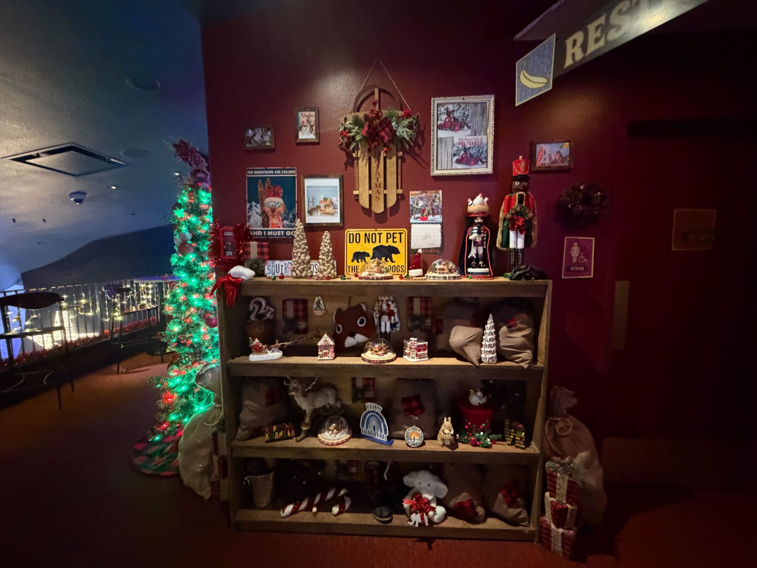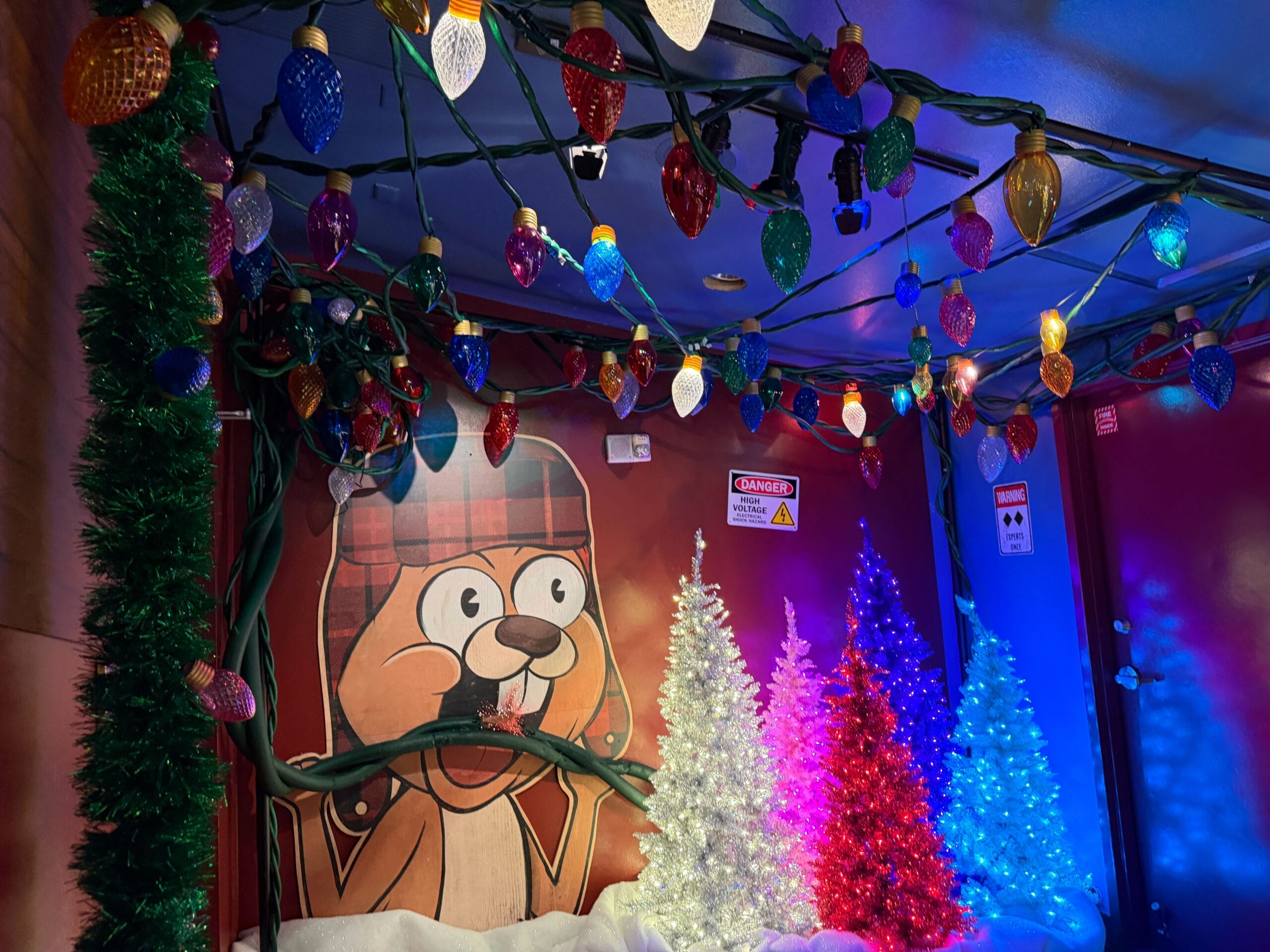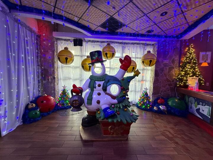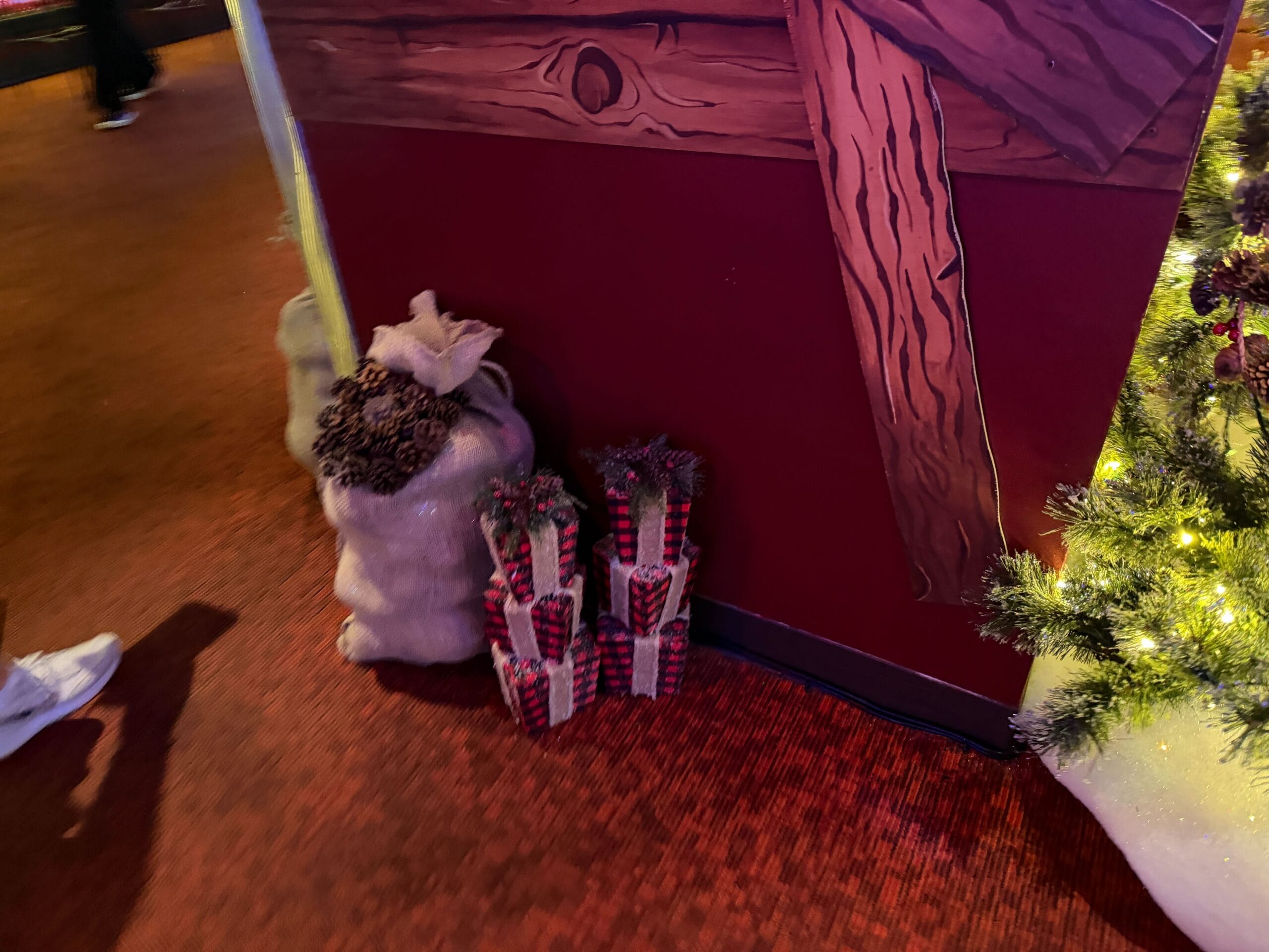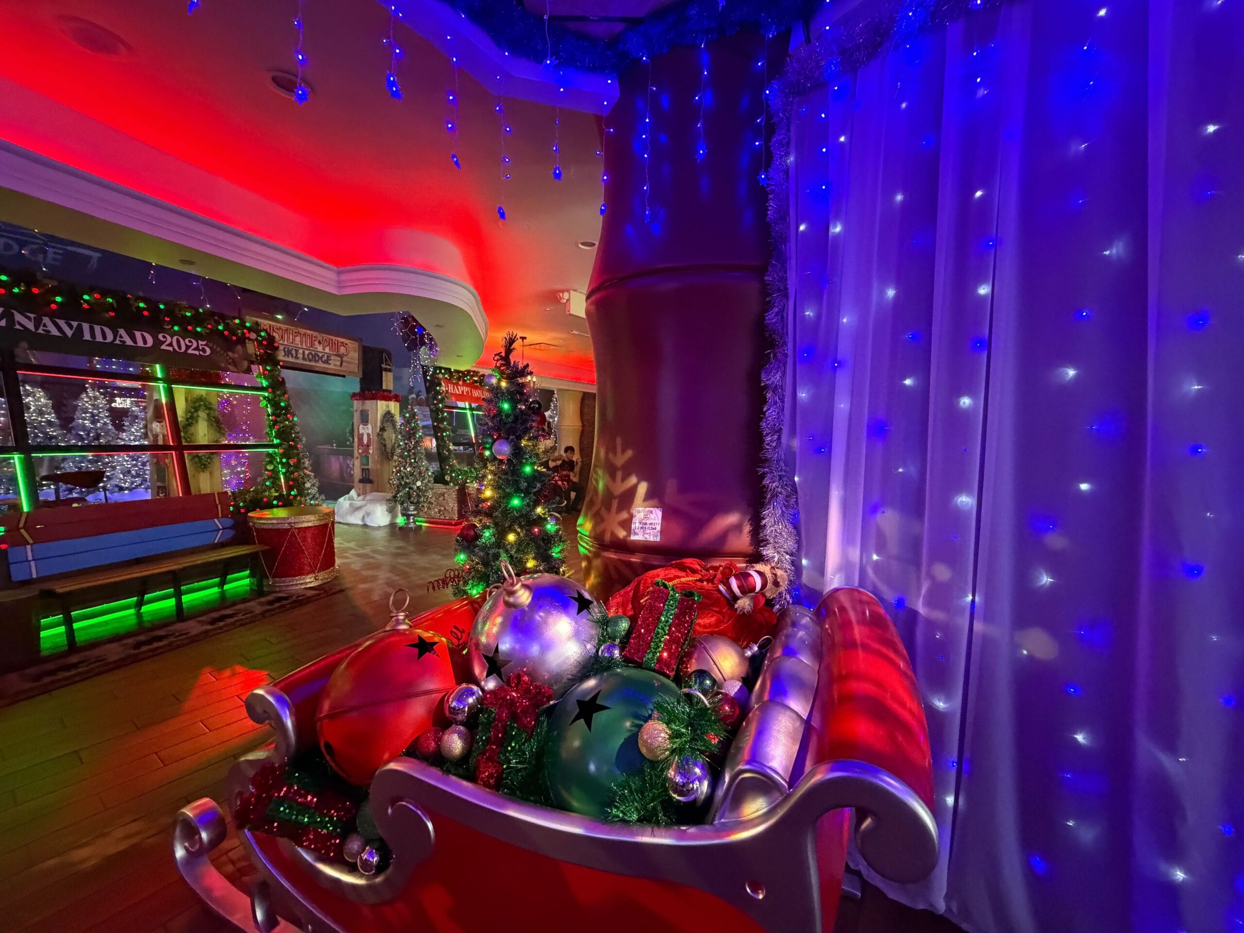 There’s a Super Chexx ice hockey machine available for guests to play alongside other holiday decor, including a sleigh pull of presents.