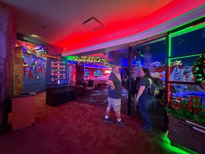 We even caught the famous guy in action. Earl holds a blue lightbulb (that he likely stole) as he meets a guest visiting the upstairs lounge to celebrate his 12 days of Christmas.