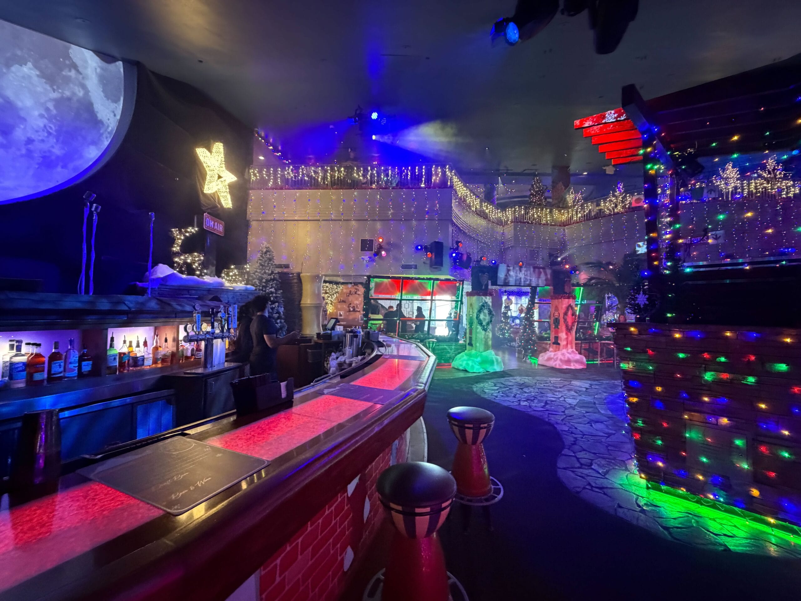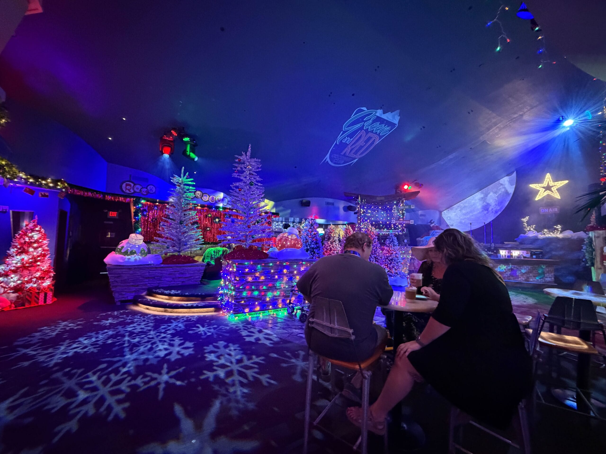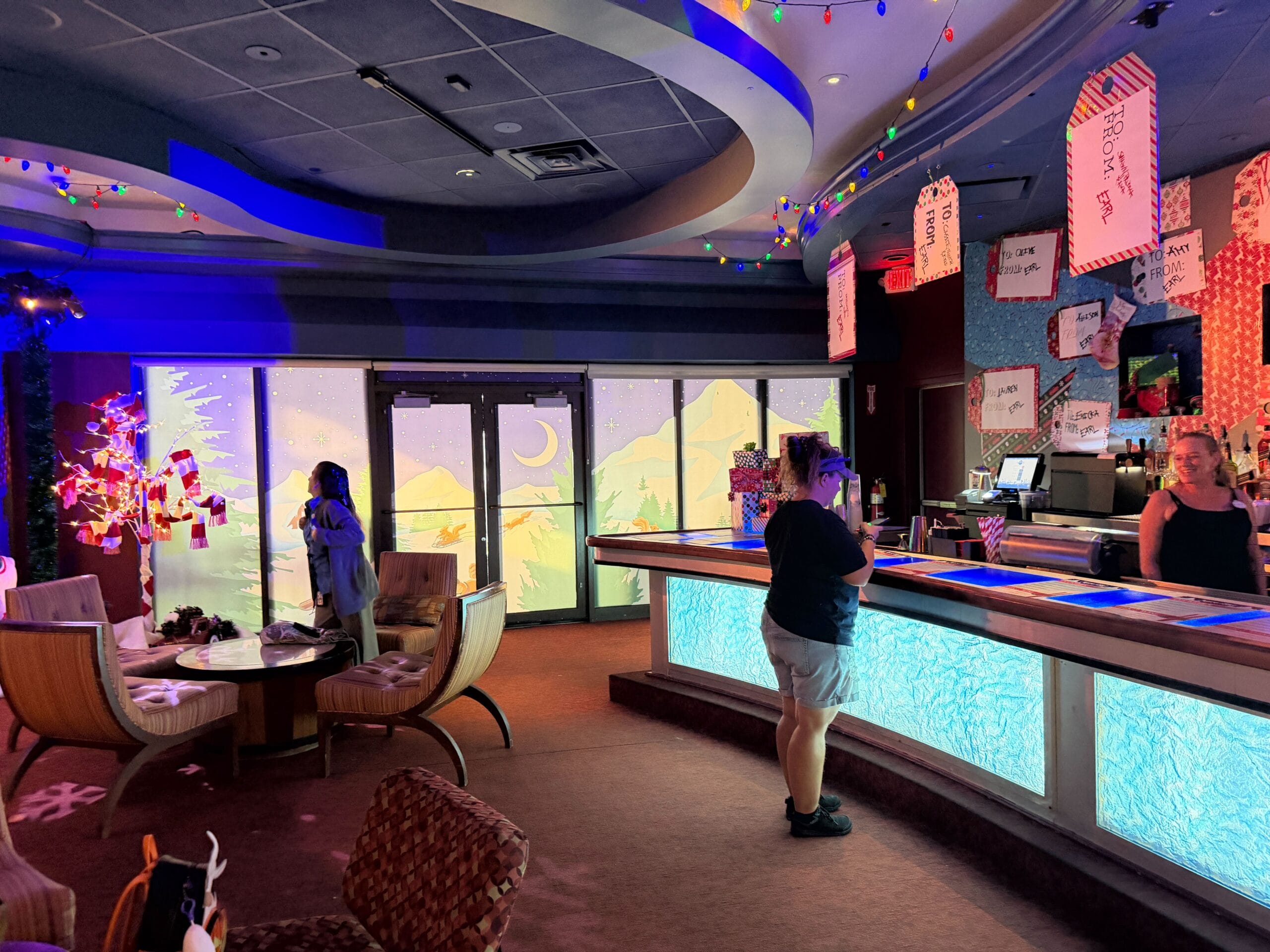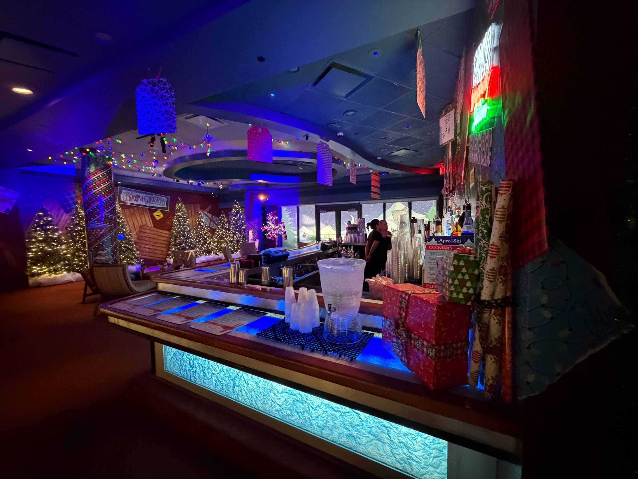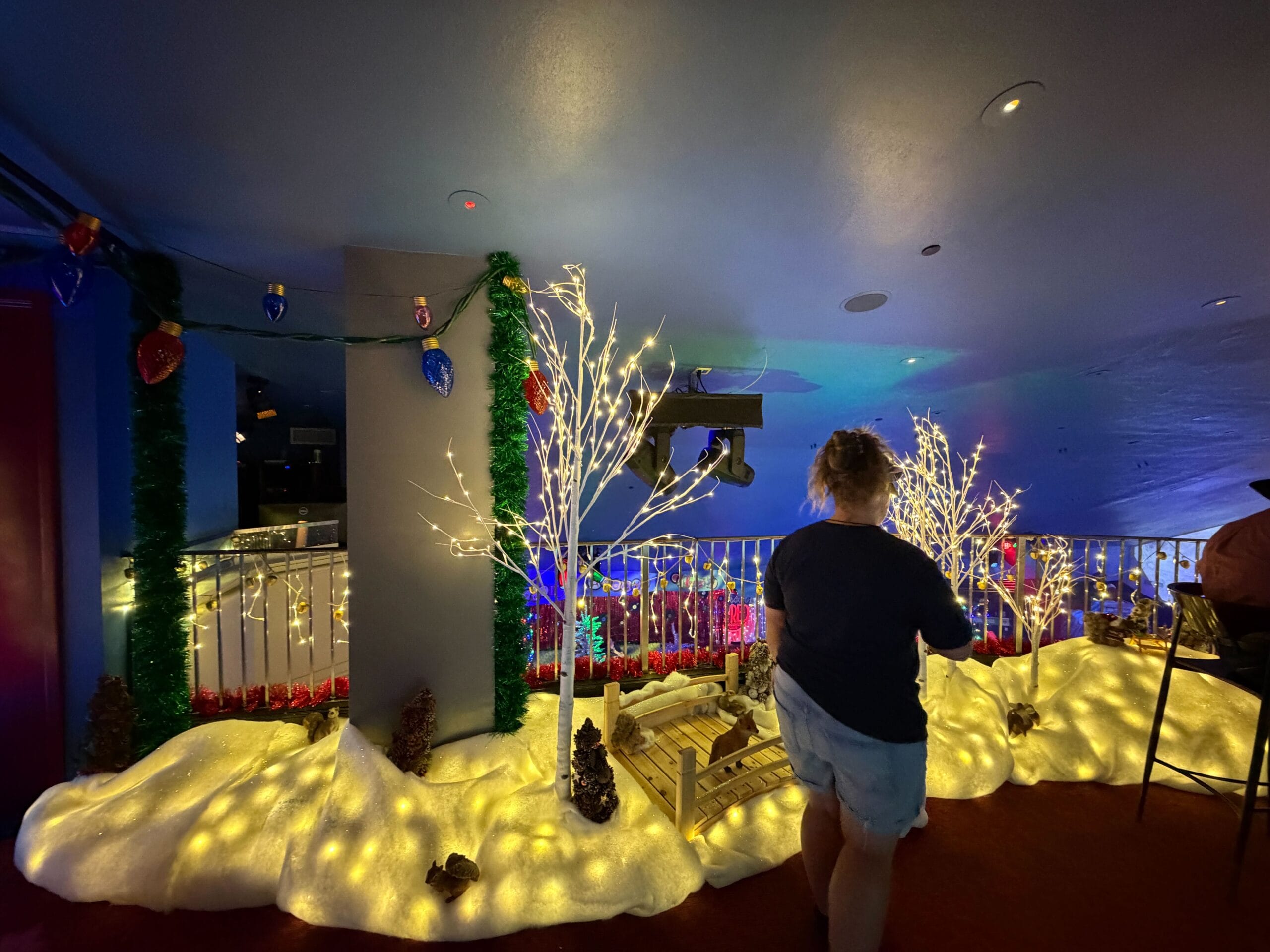 The upstairs seating area is also decorated with snowflakes projected onto the floor, seating, and tables.