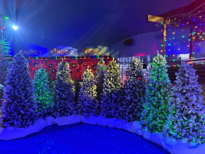 There are several photo-ops, including a snowman prop and a snow globe. The dance floor is illuminated with icy blue light. Green and blue spotlights circle the space.