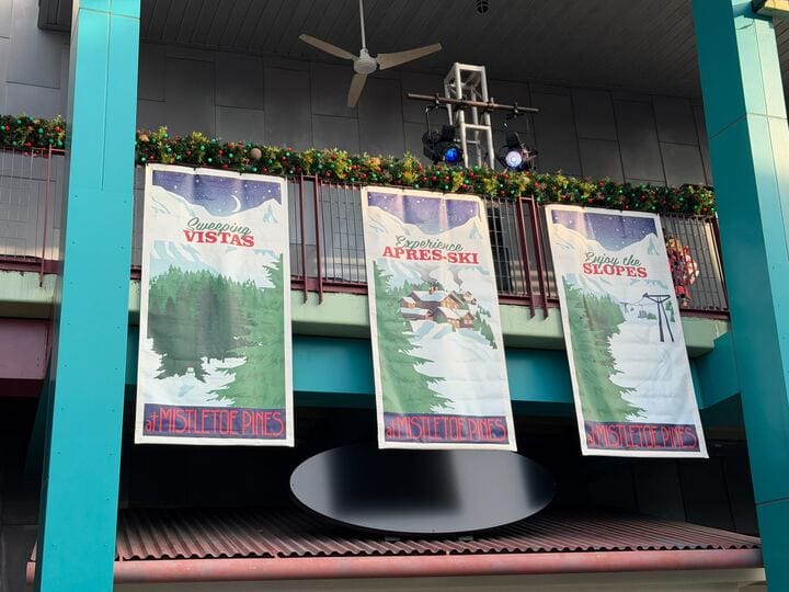 It’s adorned with garland and Mistletoe Pines travel posters.