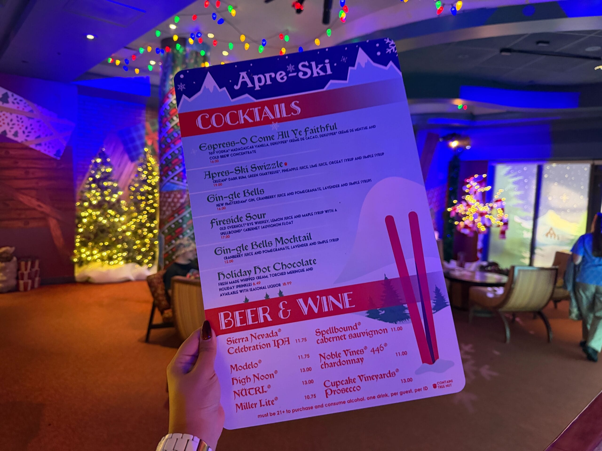 Signs above the dance floor entries read “Mistletoe Pines Ski Lodge.”