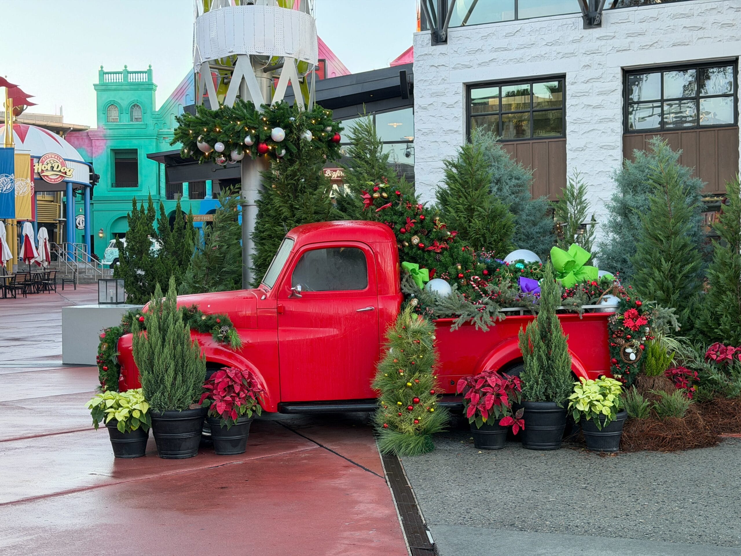 Before you head out, check out Earl’s truck by the Epic Preview Center. The red, vintage pick-up is parked amongst holiday foliage and trees right beside the wooden Mistletoe Pines Village sign.