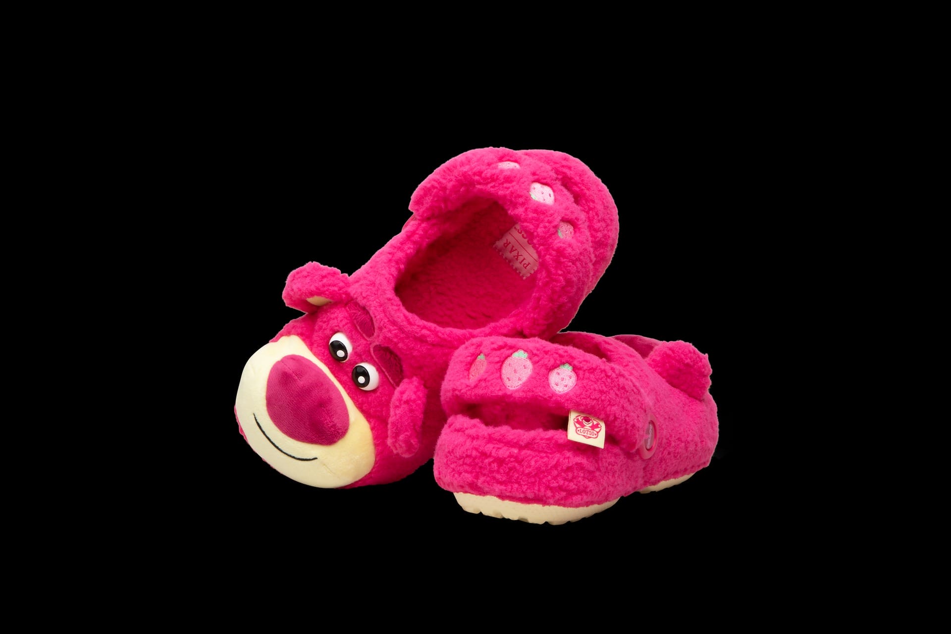 The Lotso Fuzzy Crocs for Adults have 3D ears, an embroidered smile, and strawberries on the adjustable heel strap.