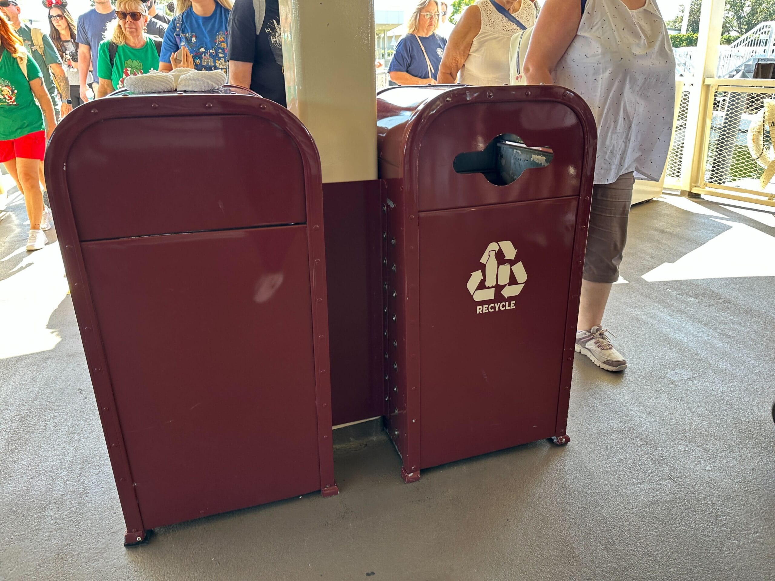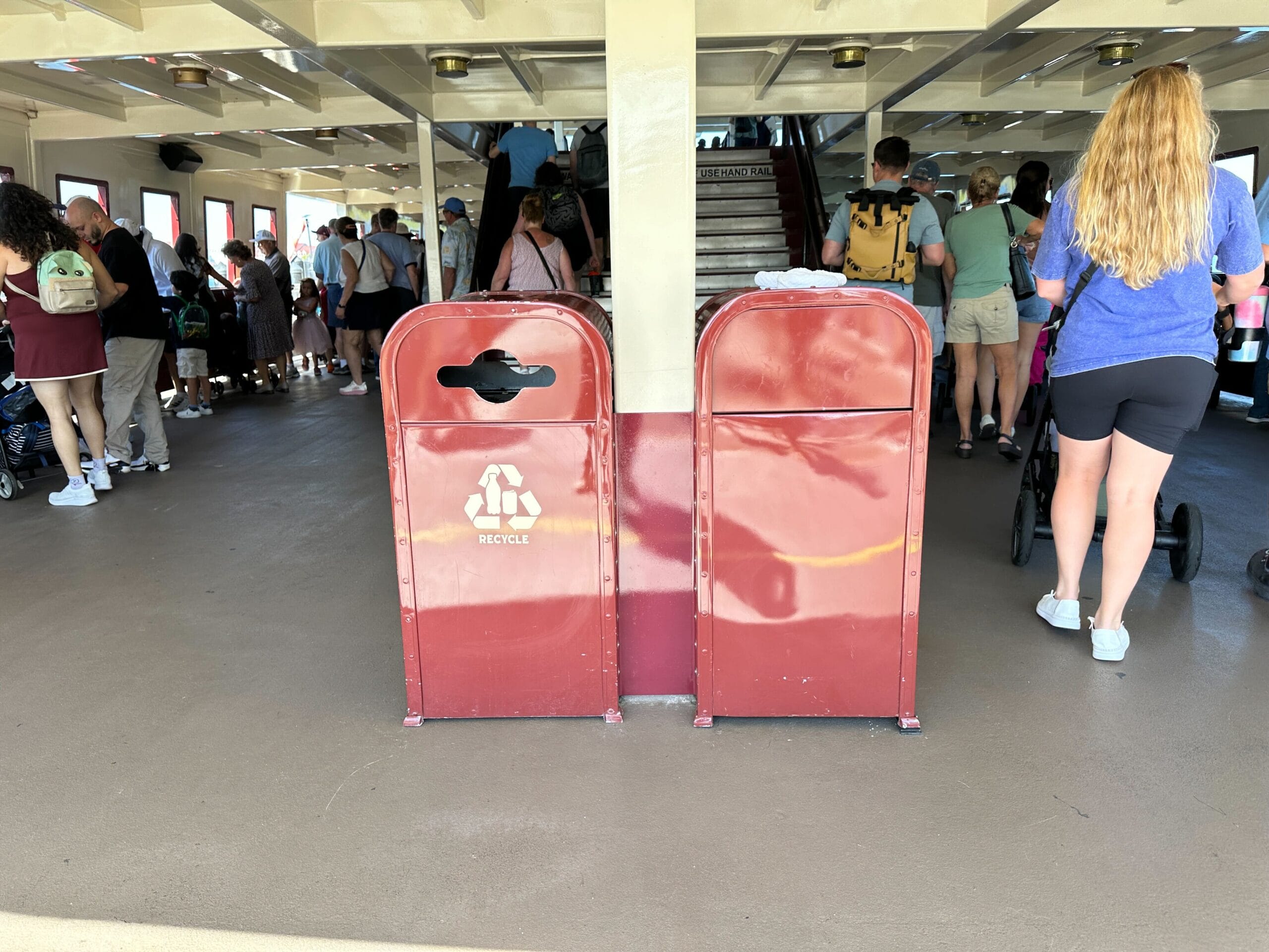 The Magic Kingdom ferryboats have trash cans again, now bolted in place so they don’t fall over.