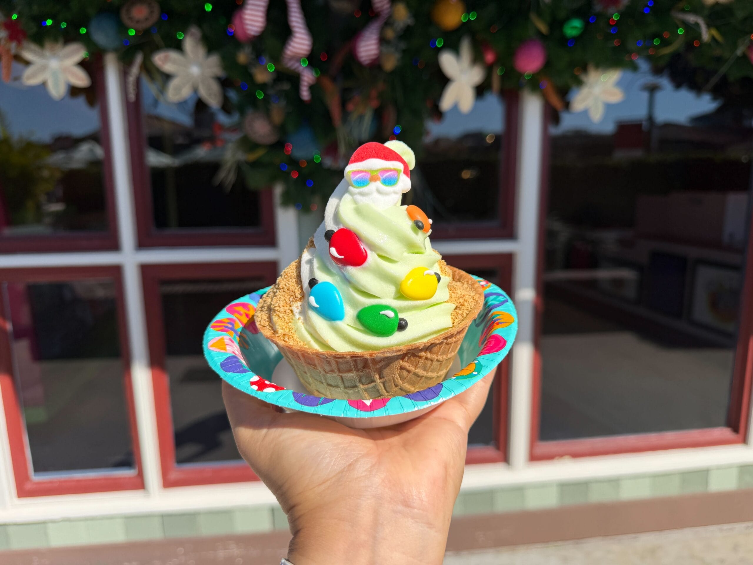 Swirls on the Water at Disney Springs has a new seasonal treat available perfect for a warm winter holiday: the Tropical Holiday Tree Sundae. It’s a lime-flavored DOLE Whip with coconut soft serve.