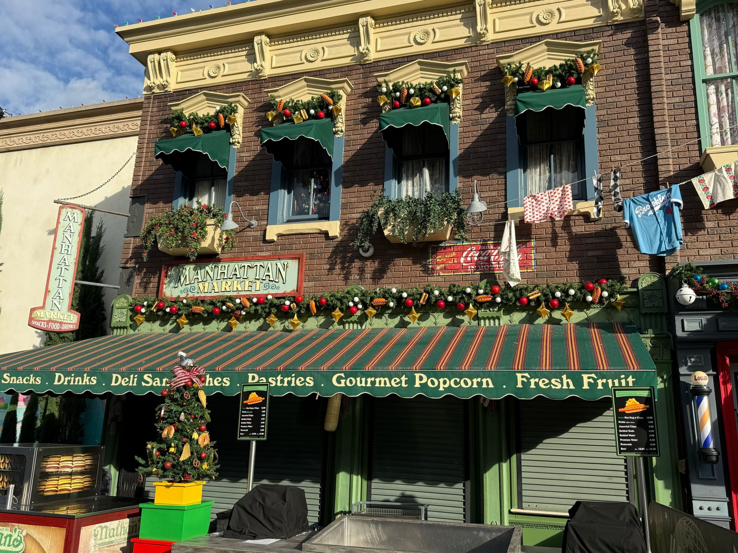 More decorations are throughout the streets of New York. A pair of plastic snowmen are on a balcony. Garlands across this deli feature big white bells. The Manhatten Market facade has garland decorated with golden stars and hot dogs, plus a Christmas tree out front.