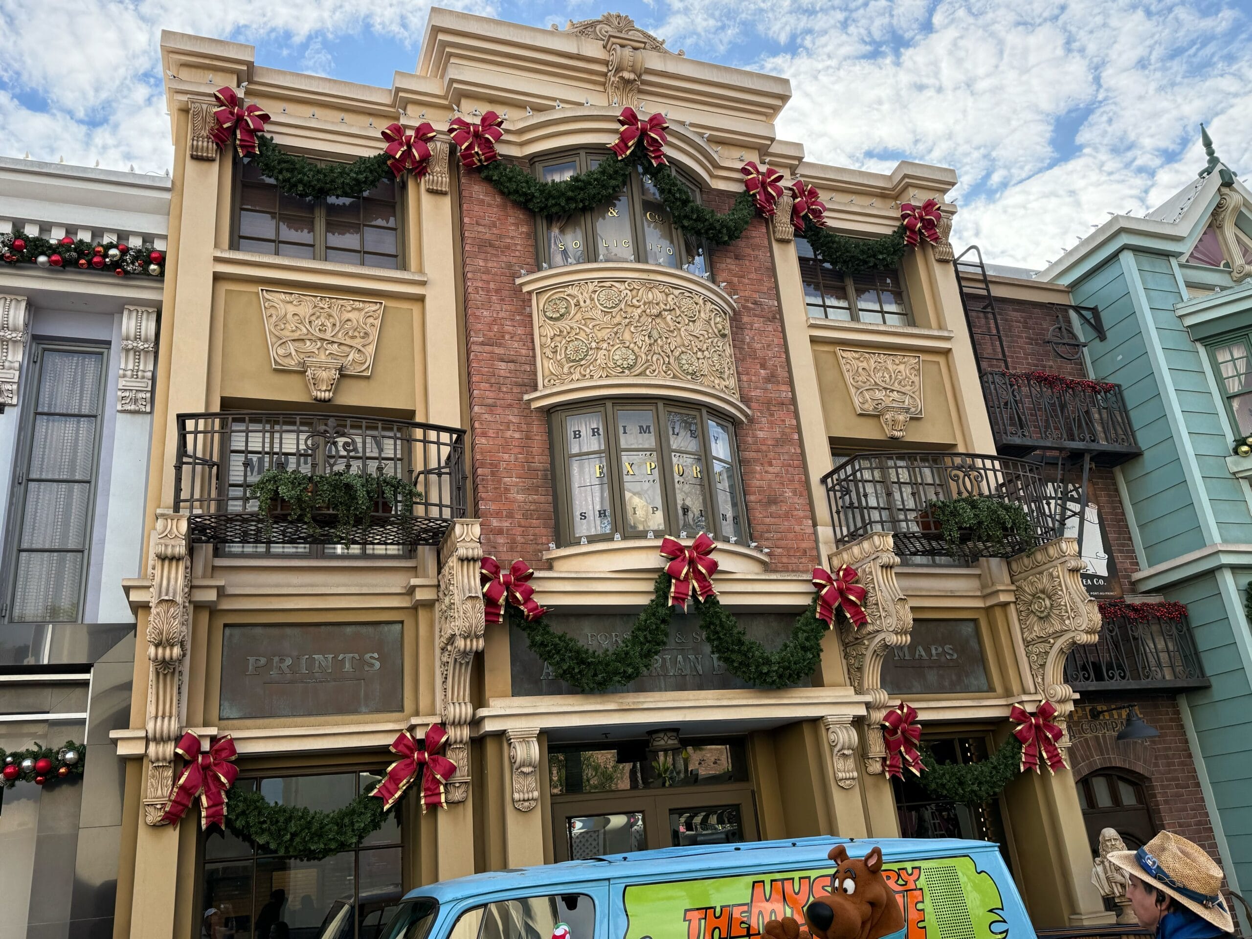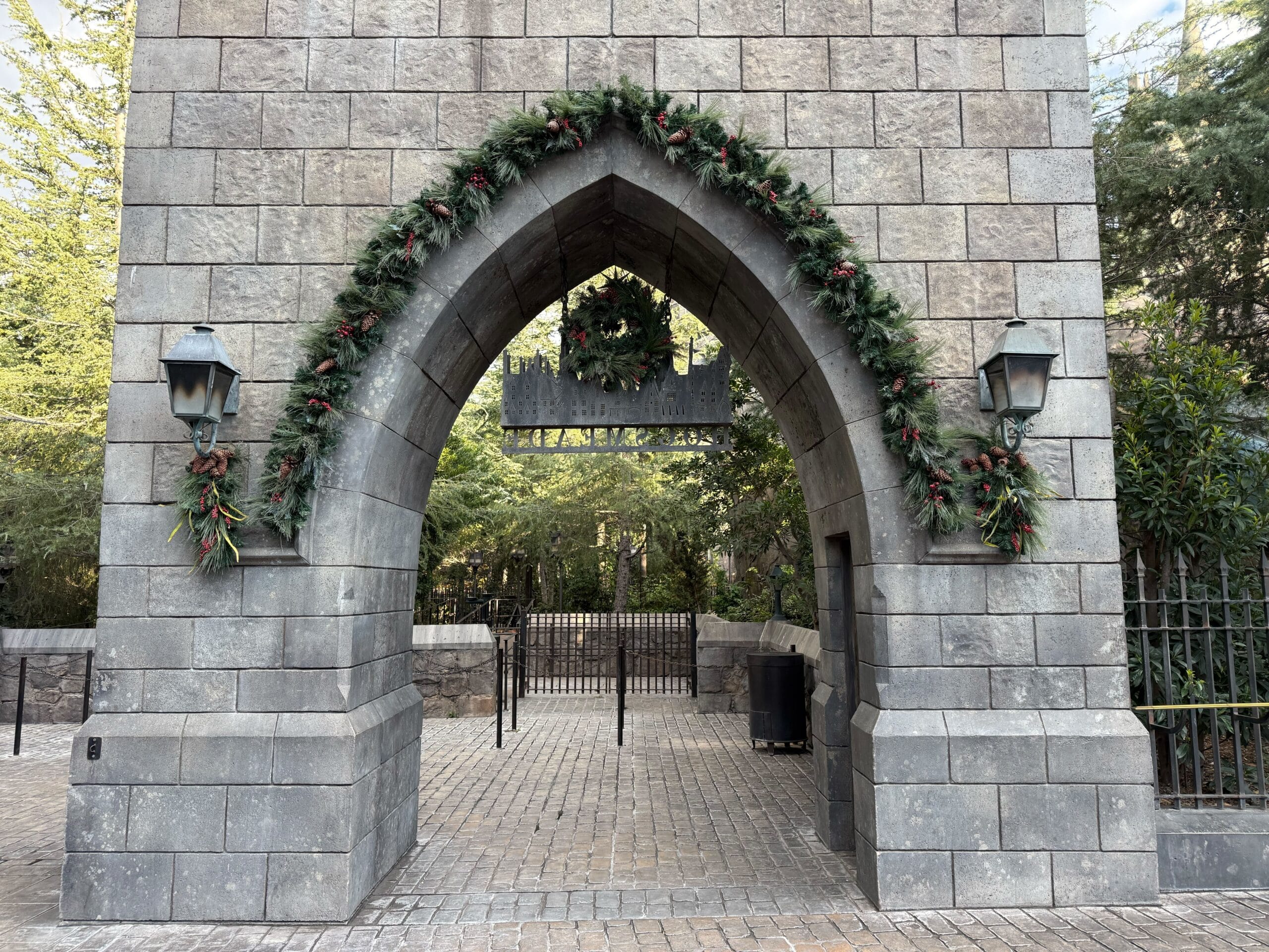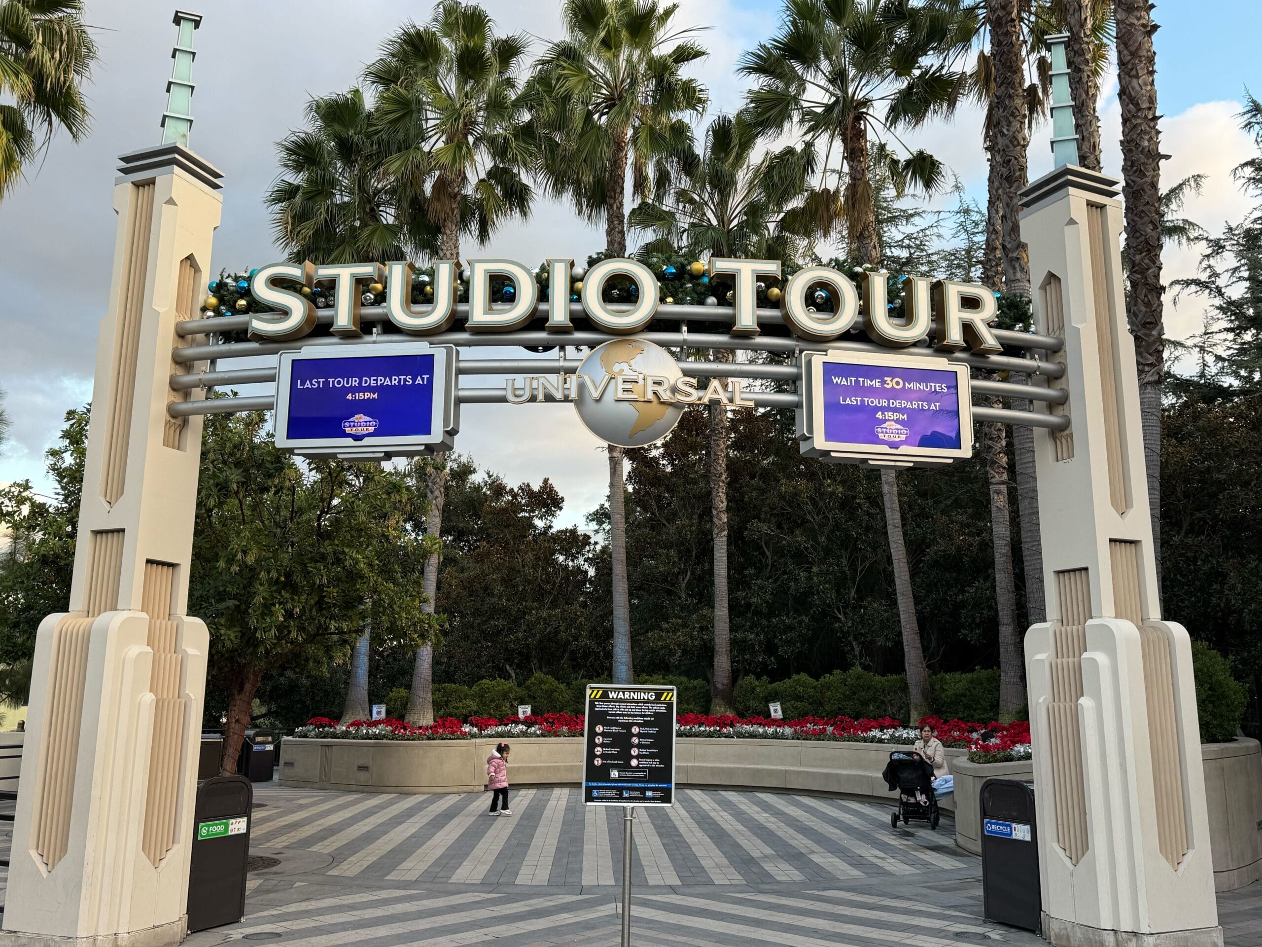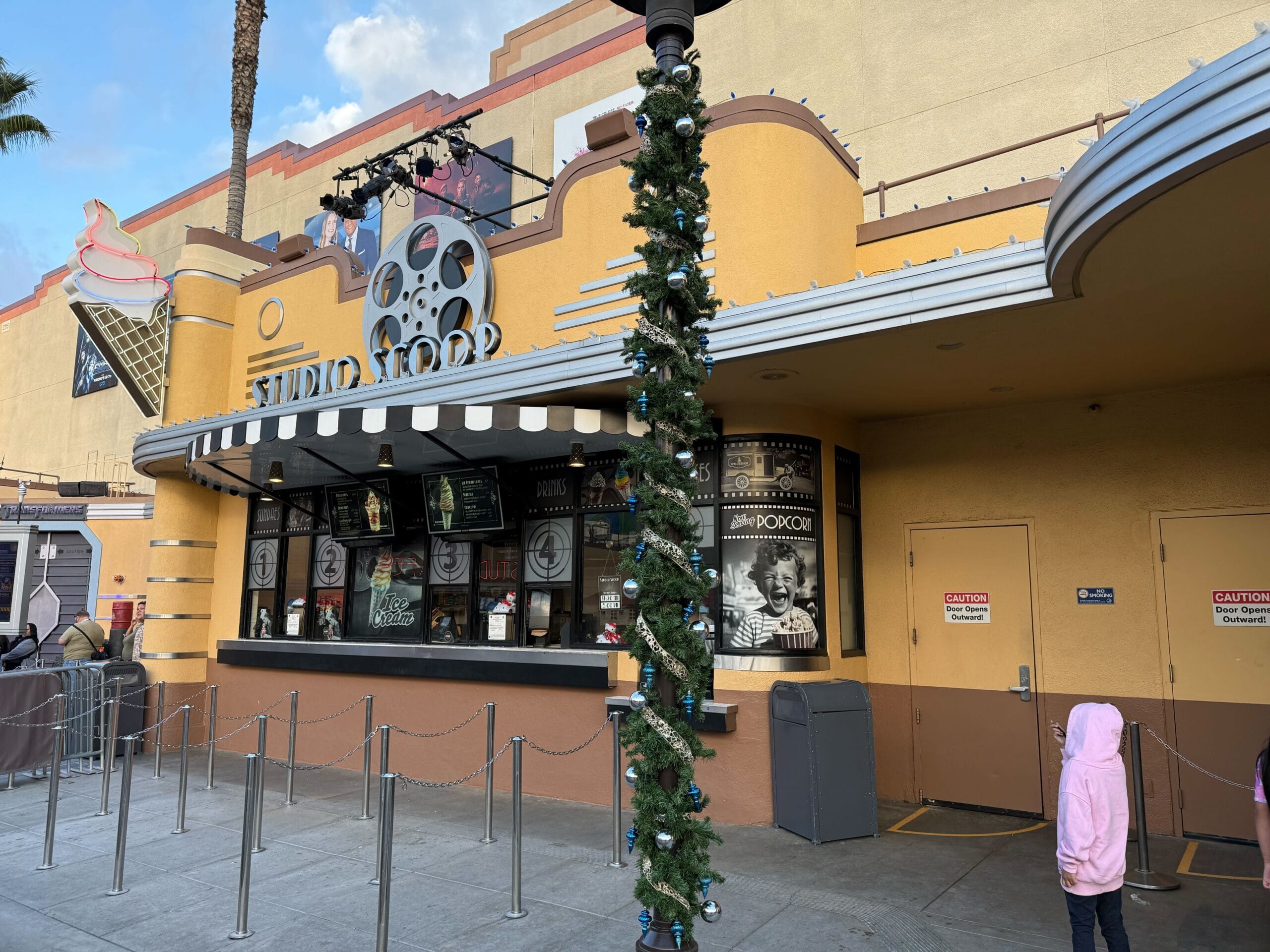 The entrance archway to the World-Famous Studio Tour has garland behind its sign. It’s adorned with blue, silver, and gold ornaments.