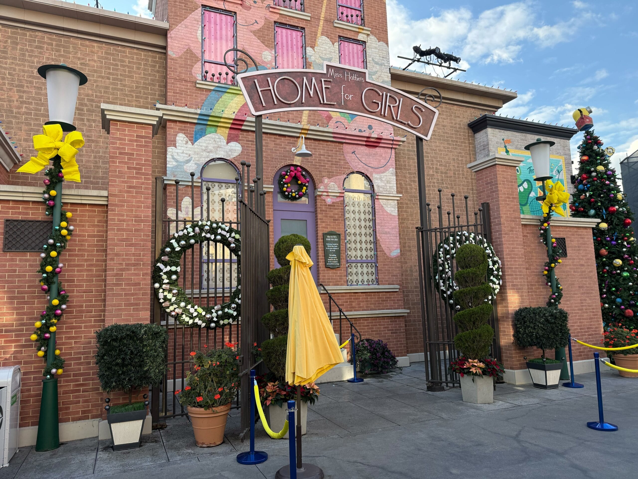 Lampposts are wrapped in garland and topped with yellow bows. Miss Hattie’s Home for Girls has big wreaths adorned with candy.