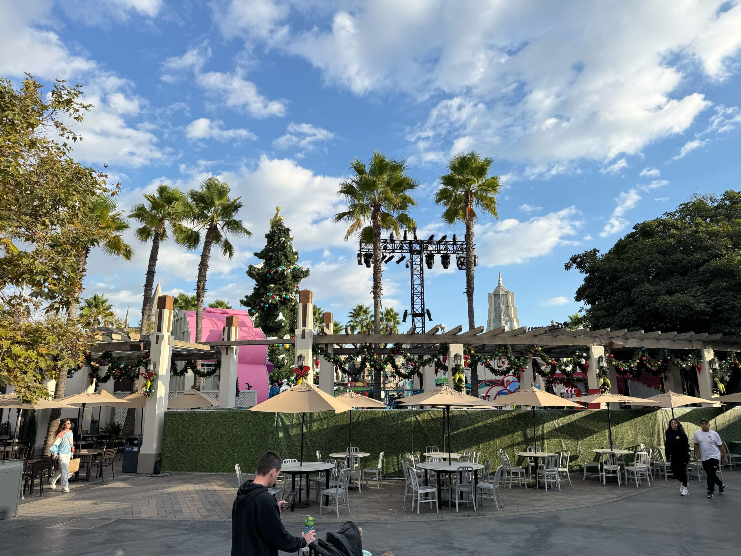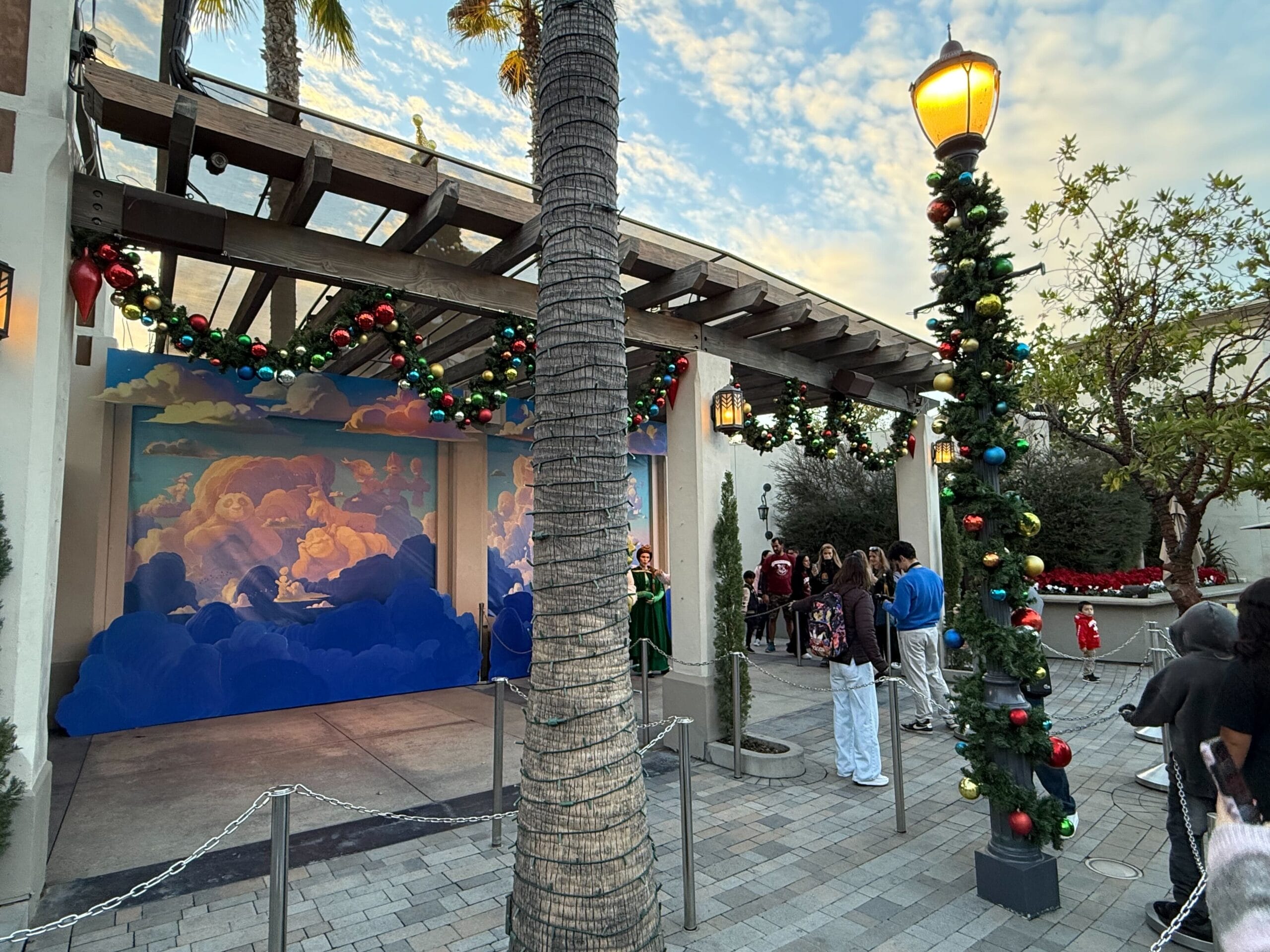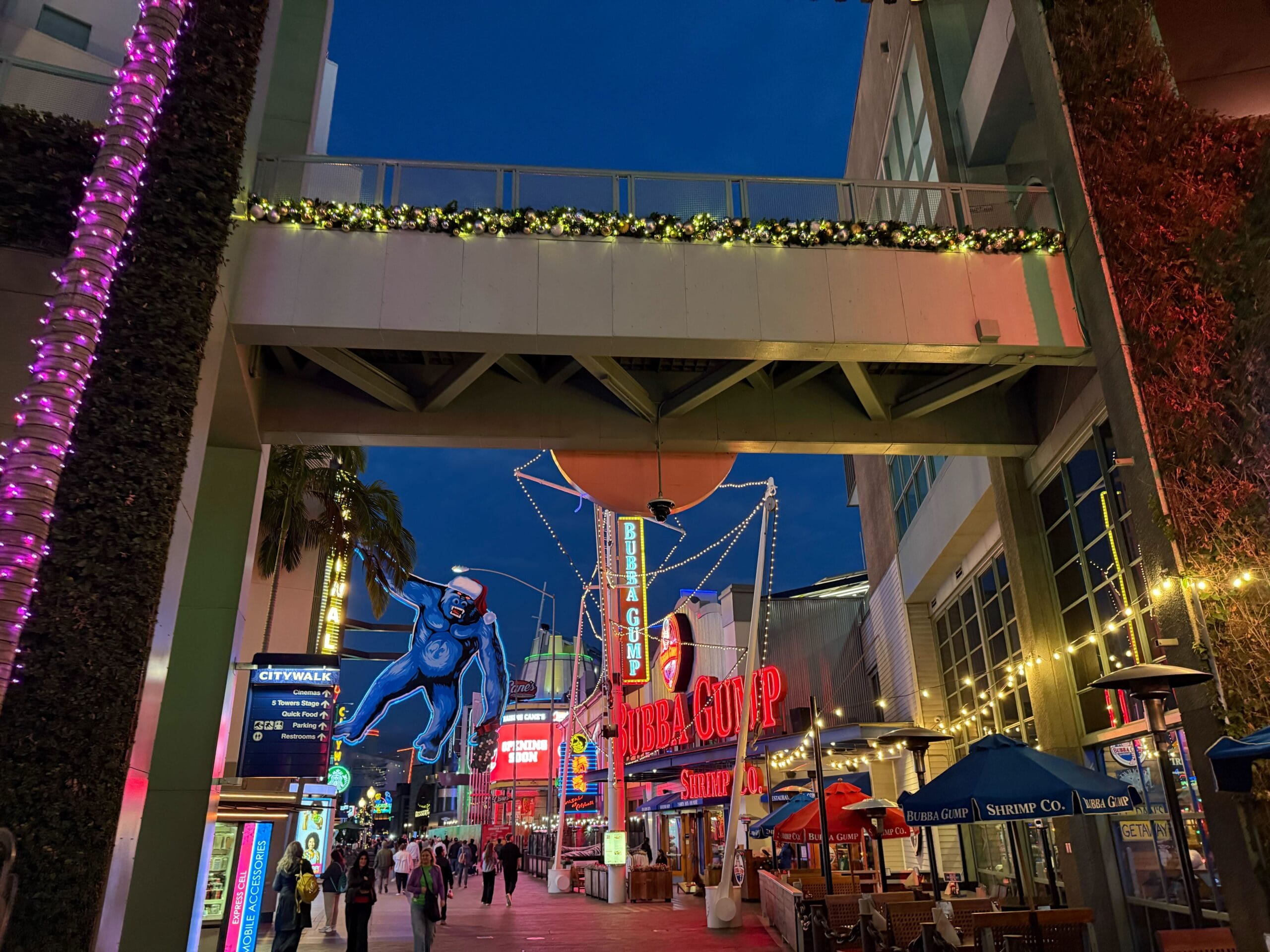 We caught CityWalk all aglow in the evening. Garland is hung above the sidewalk, with wreaths in the center. The palm trees are wrapped with green and purple lights.