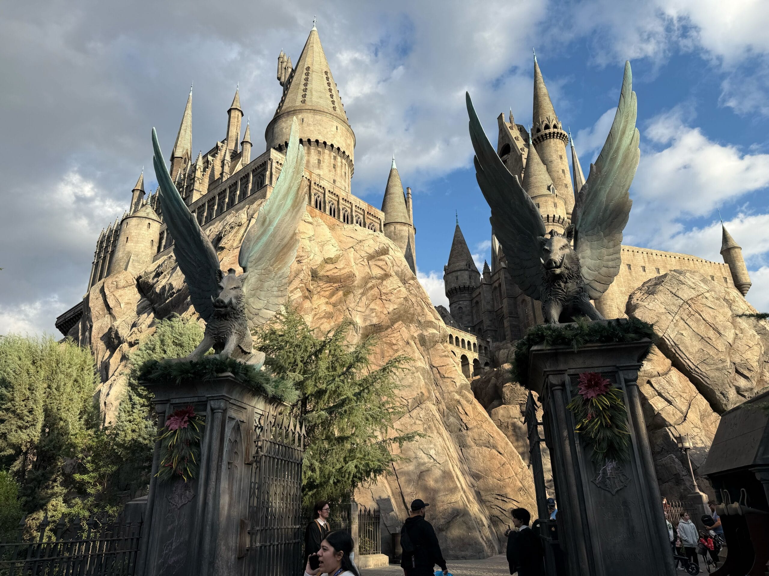 There are garland decorations on the columns of the Hogwarts entrance gate. These are topped with red flowers.