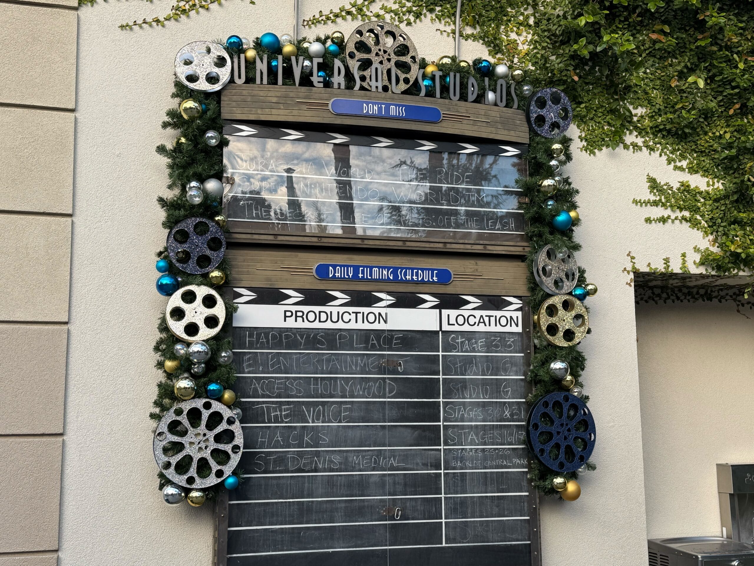 Matching garland is wrapped around the filming schedule sign. It also features sparkly film reels.
