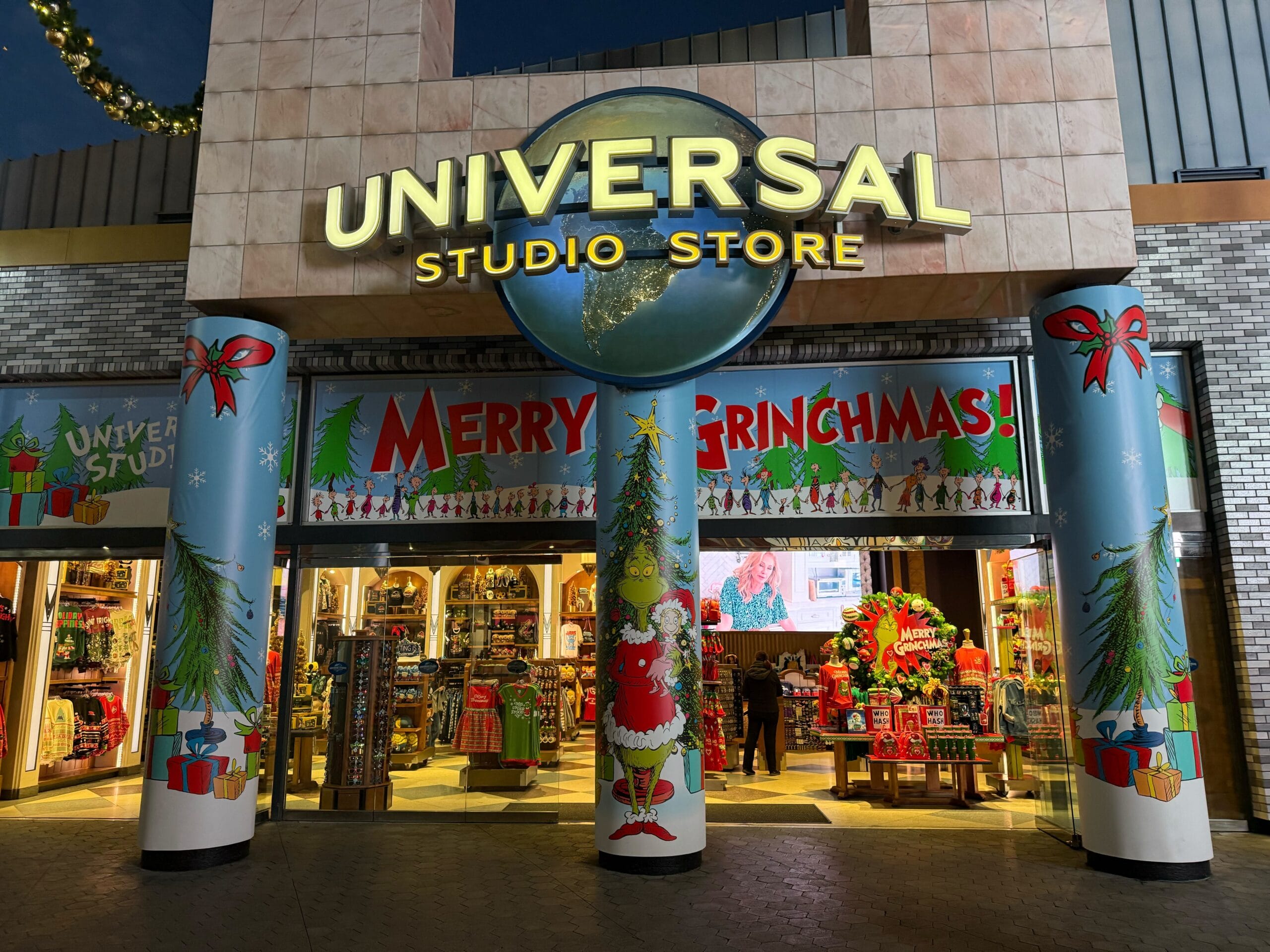 Universal Studio Store has Grinchmas decals around its columns and in the windows.