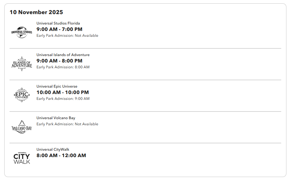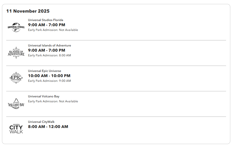 All the other Universal Orlando parks are listed as being open with operating hours.