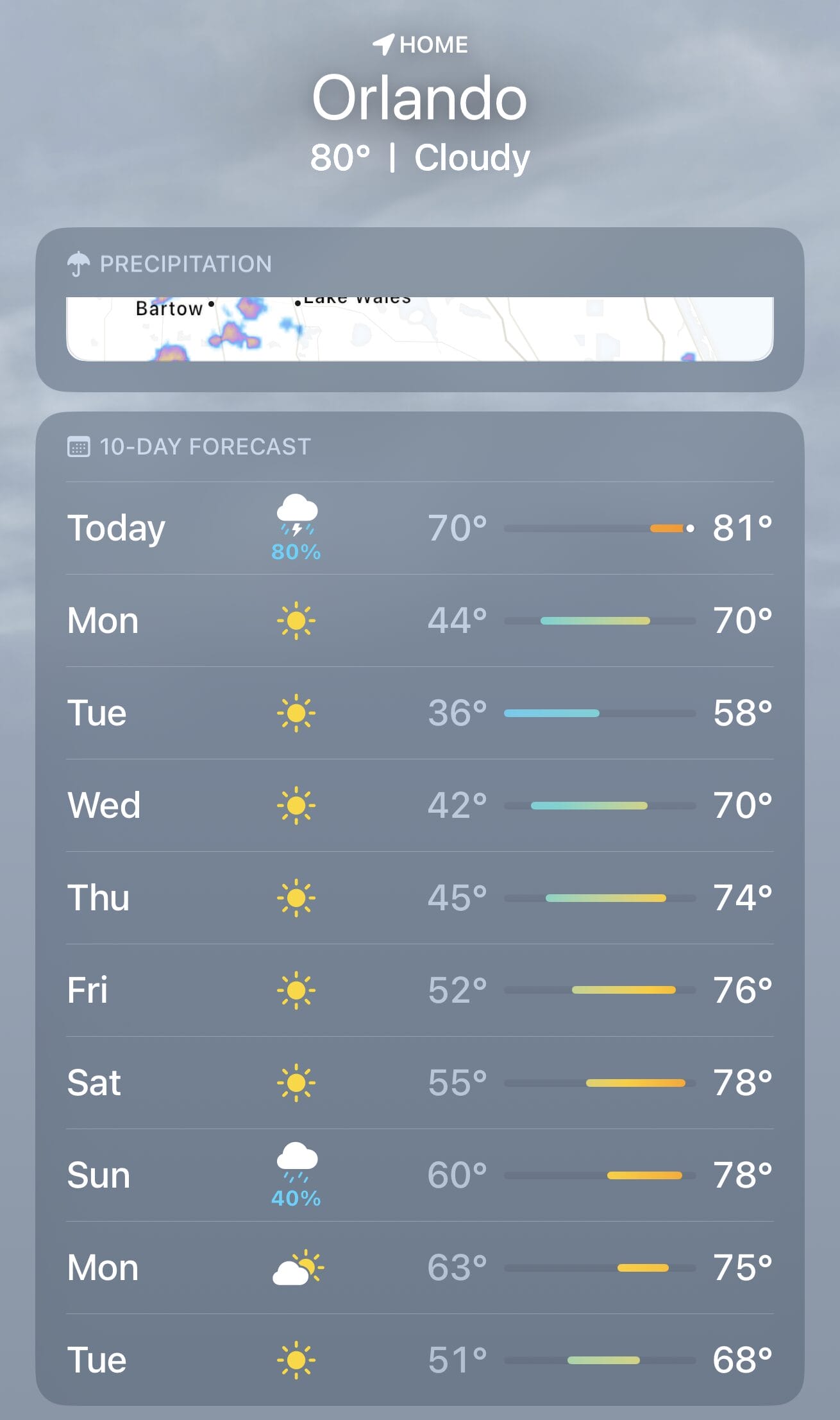 The forecast for Orlando shows that those days will have lower temperatures than normal for this year, with a high of 70° on Monday and a chilly 58° on Tuesday.
