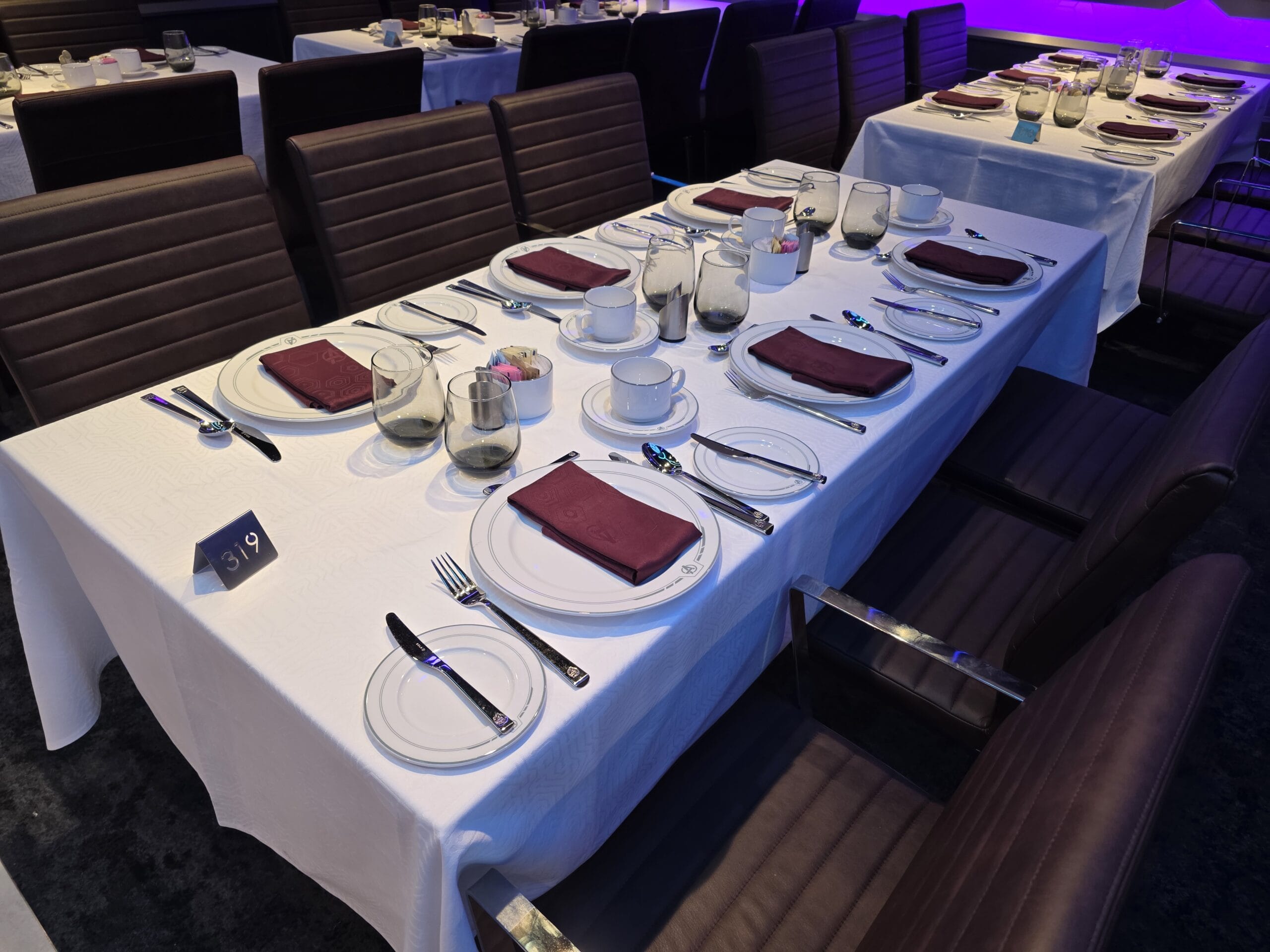 The tables are pre-set with glasses, burgundy cloth napkins, metal plates. and flatware. The number on the base of each core corresponds with your assigned table number.