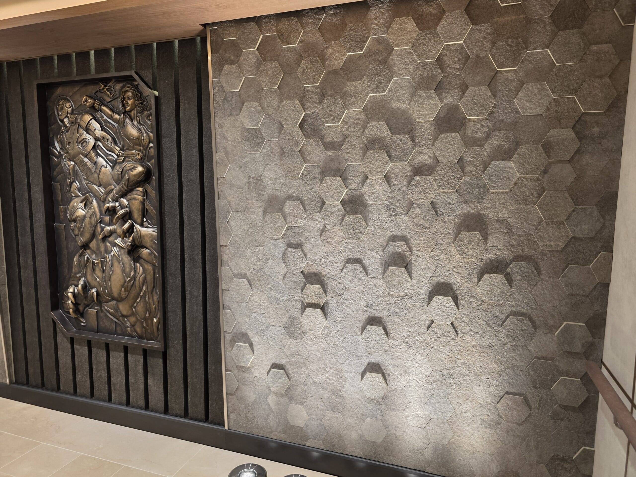 The hall to the restaurant is lined with hexagons and a large Worlds of Marvel sign. The metal doors at the end feature the Avengers “A.”