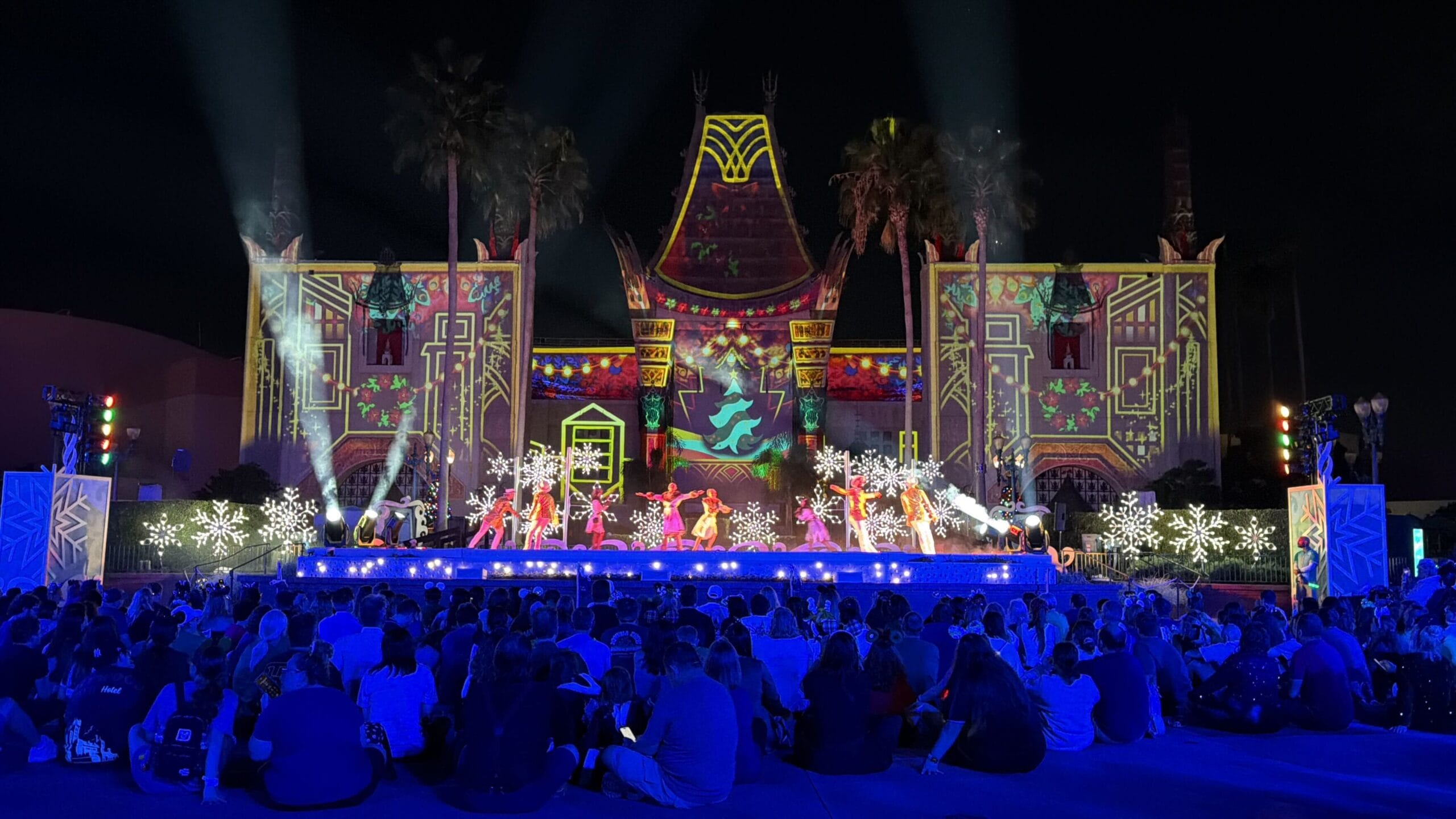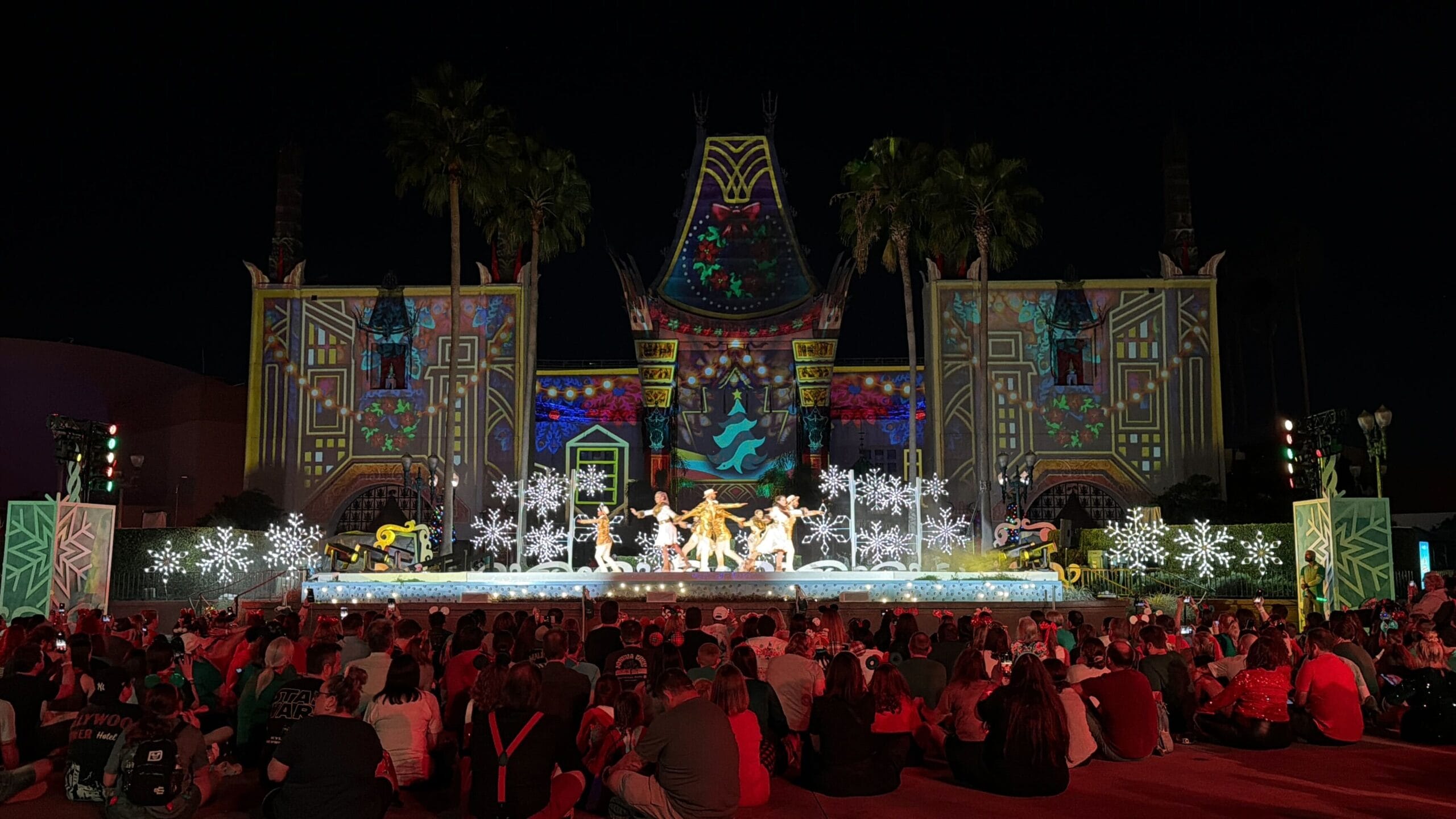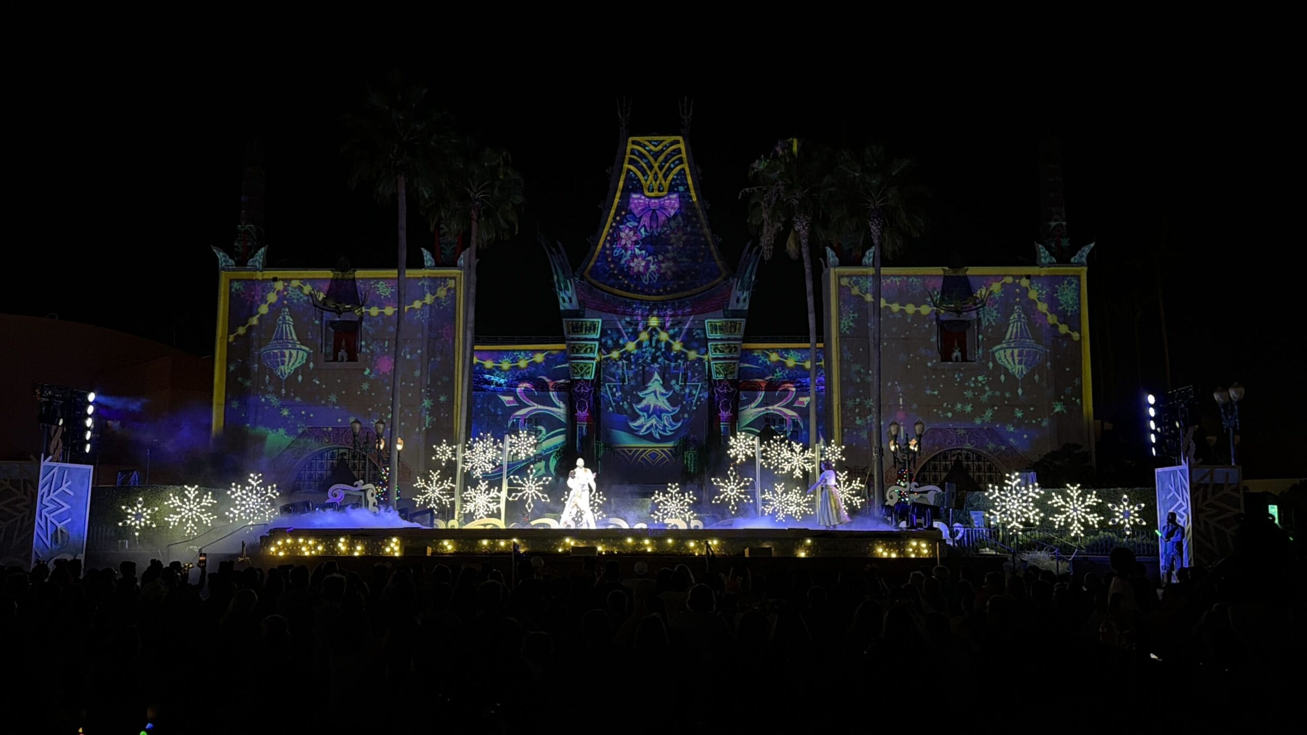This year sees a new “Glisten!” set with illuminated snowflake set pieces, which we saw being installed earlier this week. They stand out against the different colorful scenes projected onto the facade of the Chinese Theater.