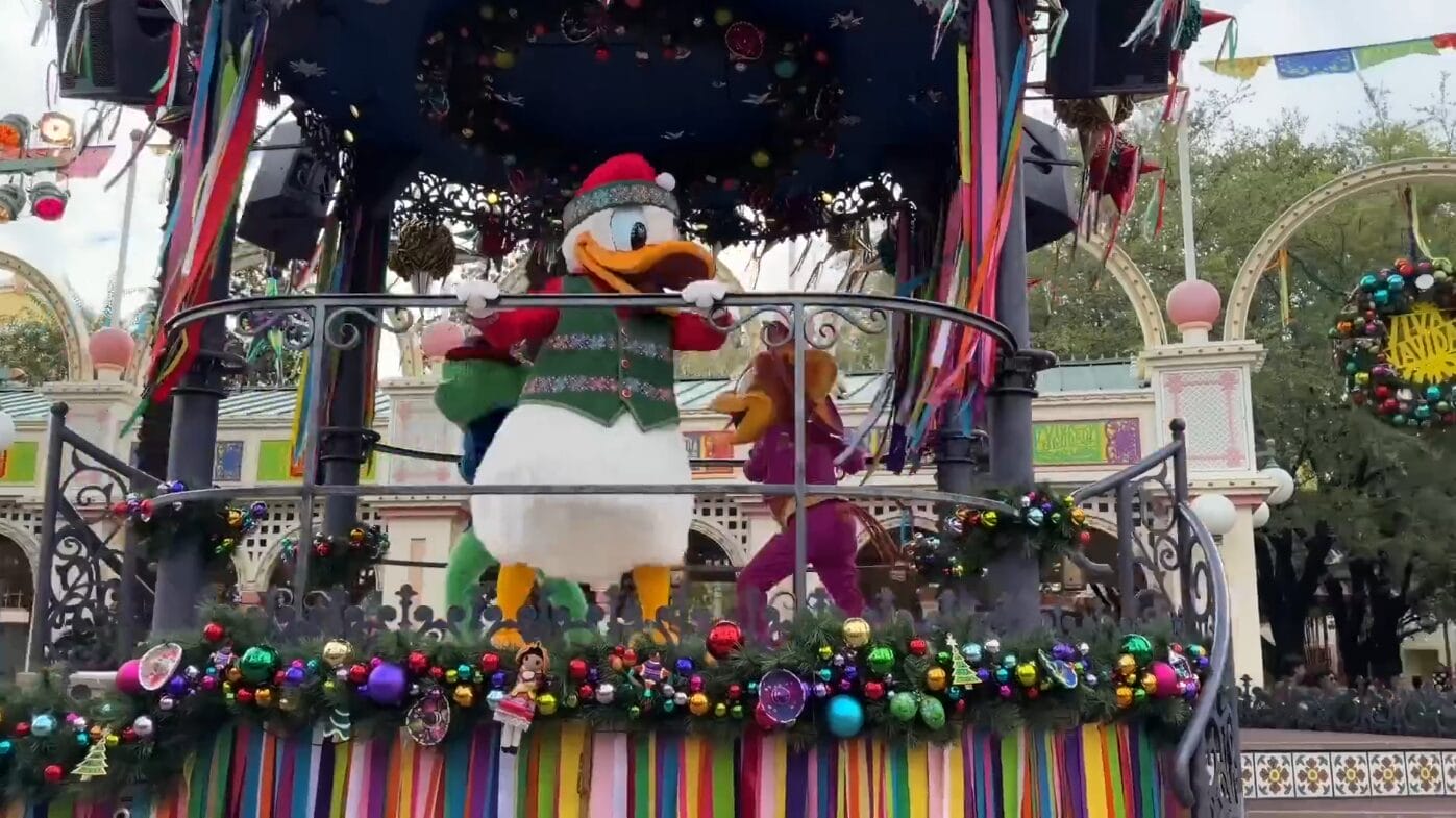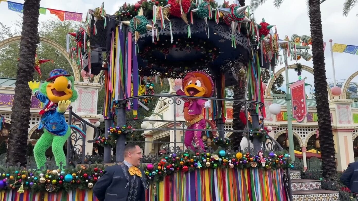 The Three Caballeros — Donald Duck, Panchito, and José Carioca — ride in on the main float. The float is festooned with a variety of holiday decorations, including red, green, and gold piñatas, multicolored ribbon streamers, and a garland with traditional dolls and maracas interspersed with ornaments.