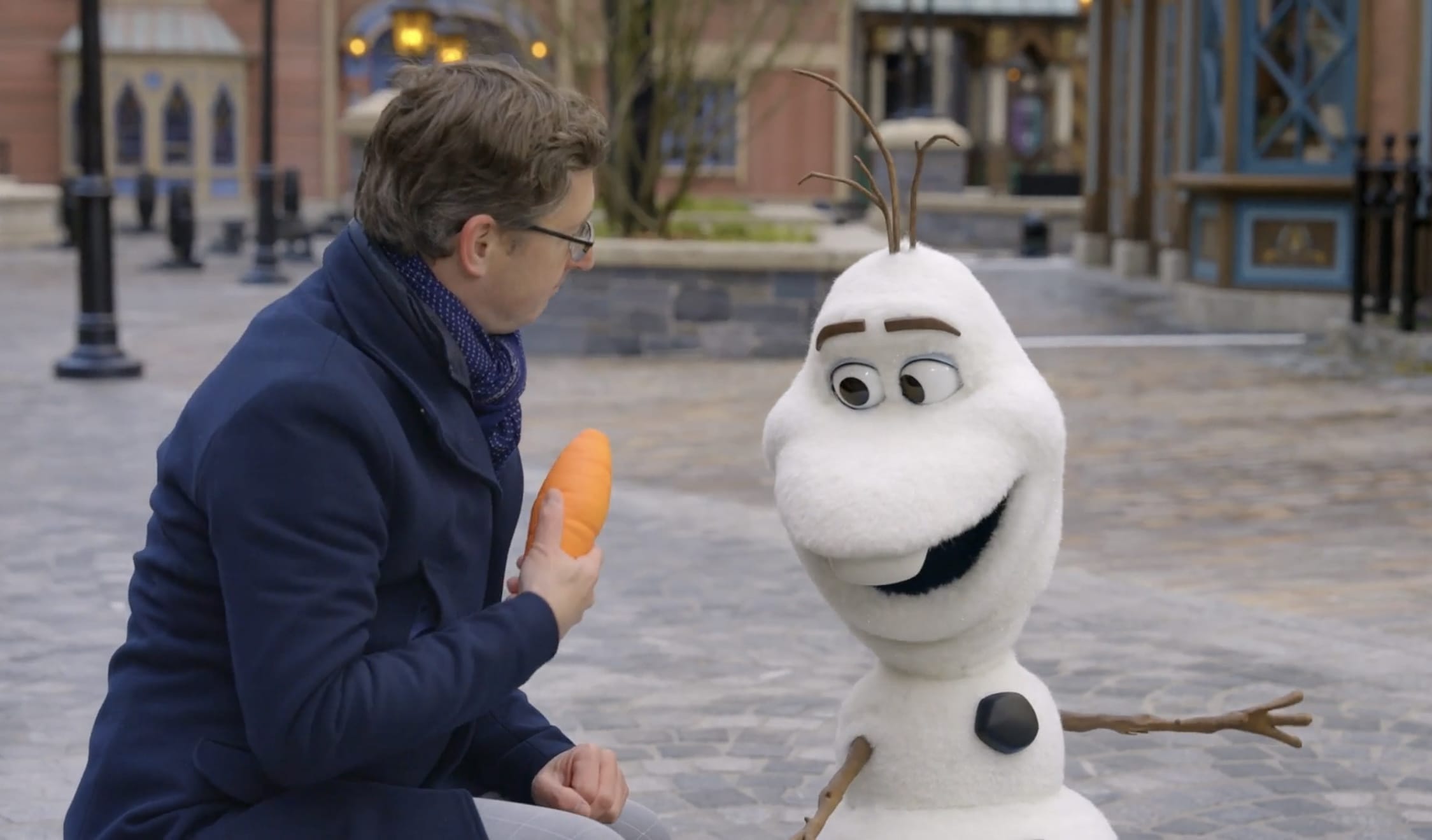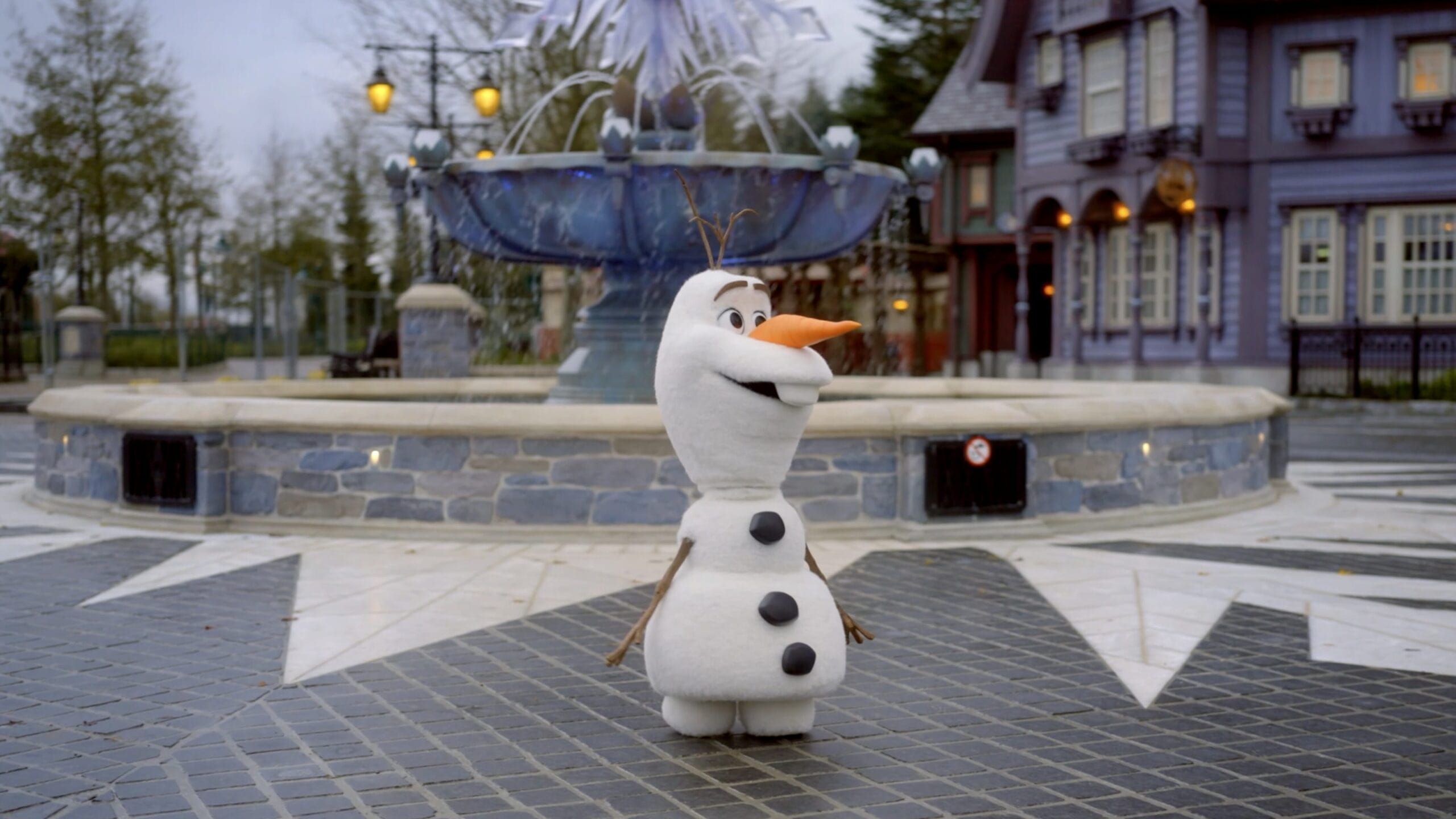 At the beginning of the Research & Development episode of We Call It Imagineering, Chairman of Disney Experiences Josh D’Amaro shows Olaf in a more unfinished form at their Zurich facility. The character is later shown in a more complete form, walking around the soon-to-open World of Frozen in Disney Adventure World at Disneyland Paris.