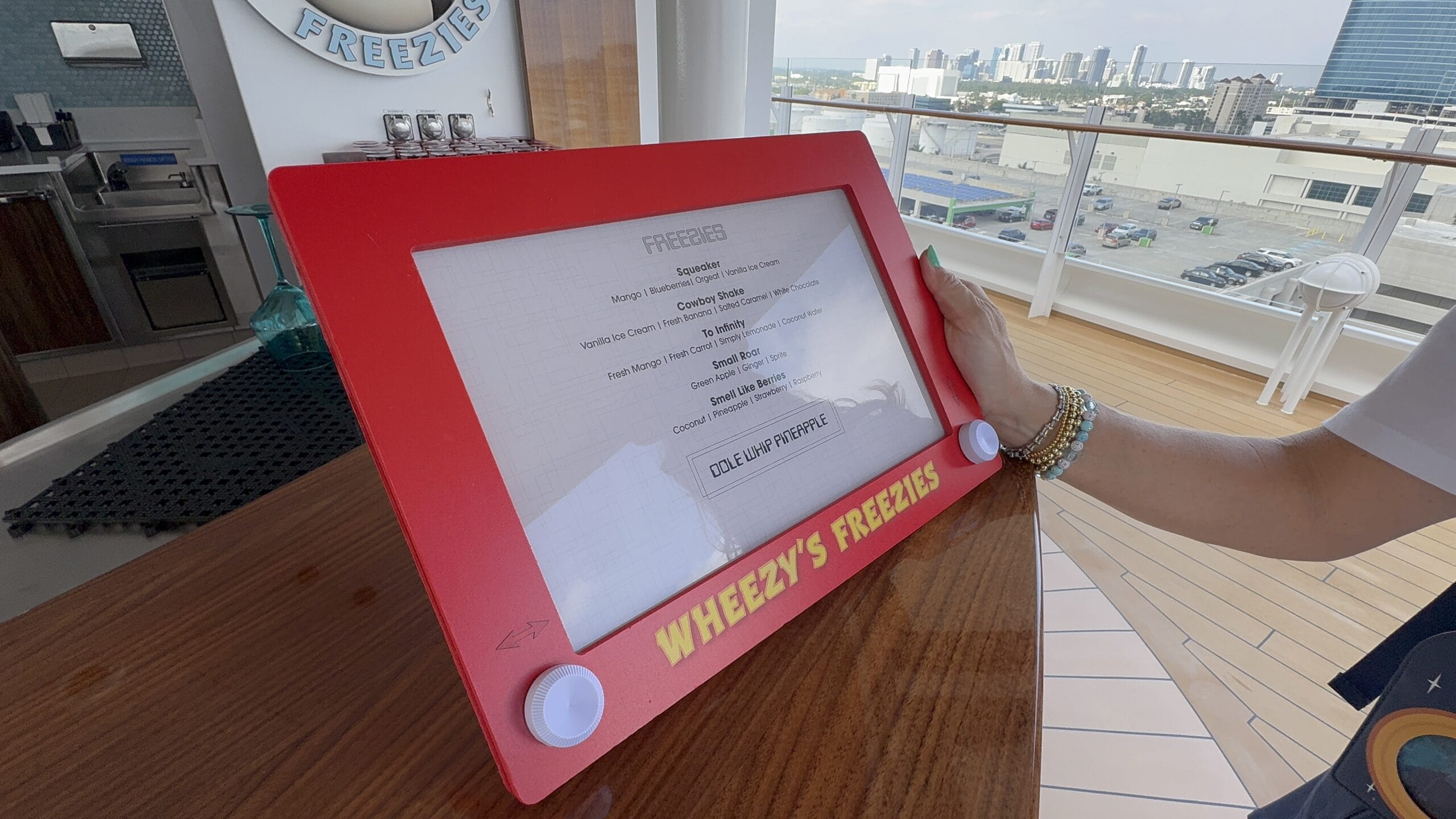 The menu comes on large Etch-a-Sketch pads that have “Wheezy’s Freezies” text at the bottom.