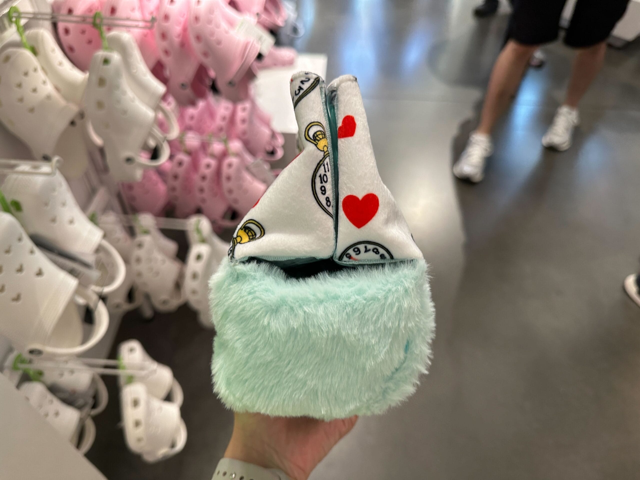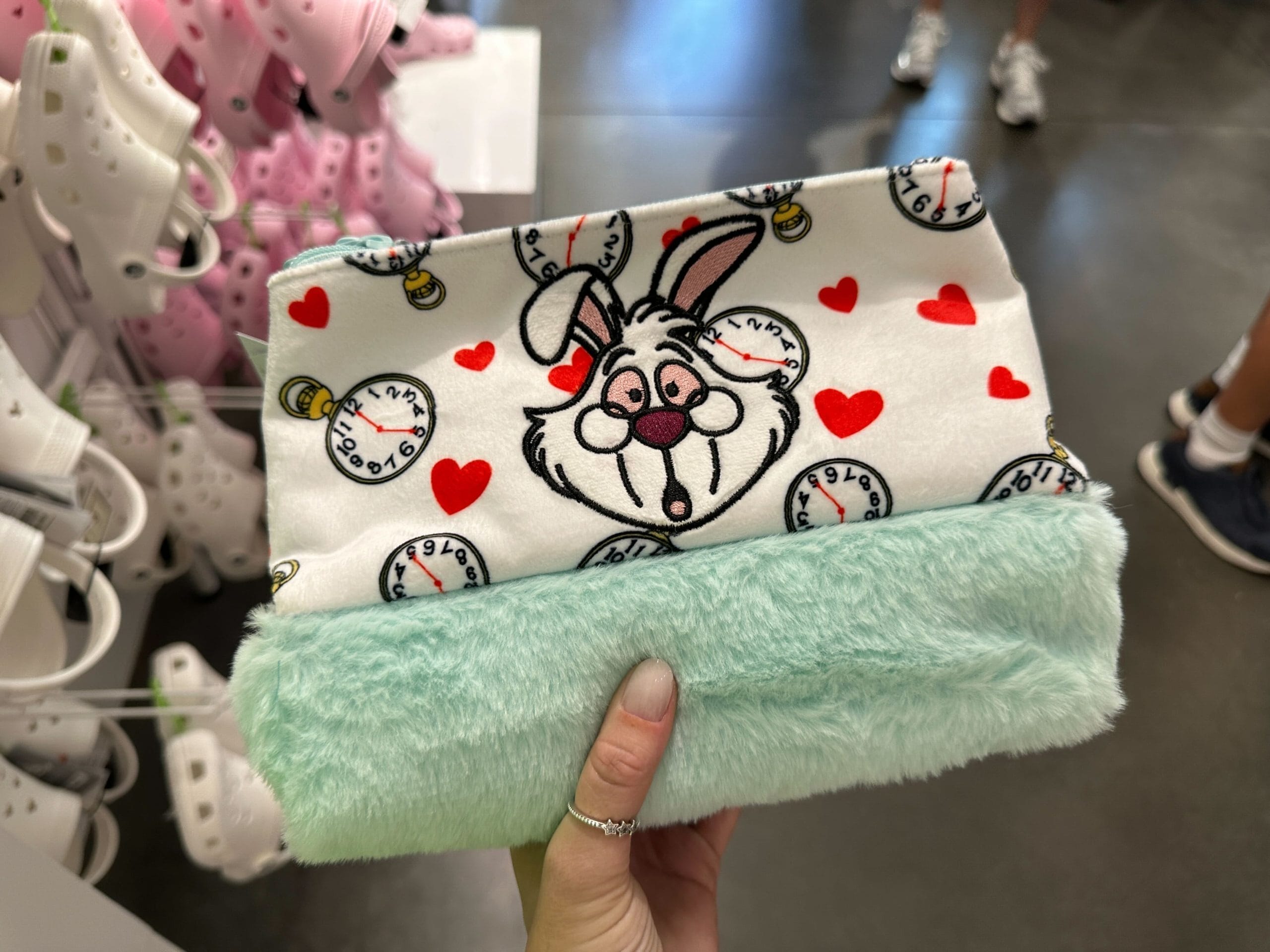 This soft handbag features a bewildered White Rabbit embroidered on the front. Clocks surround him, all set to 5 o’clock, and red hearts. The bottom of the bag is fuzzy and mint green.