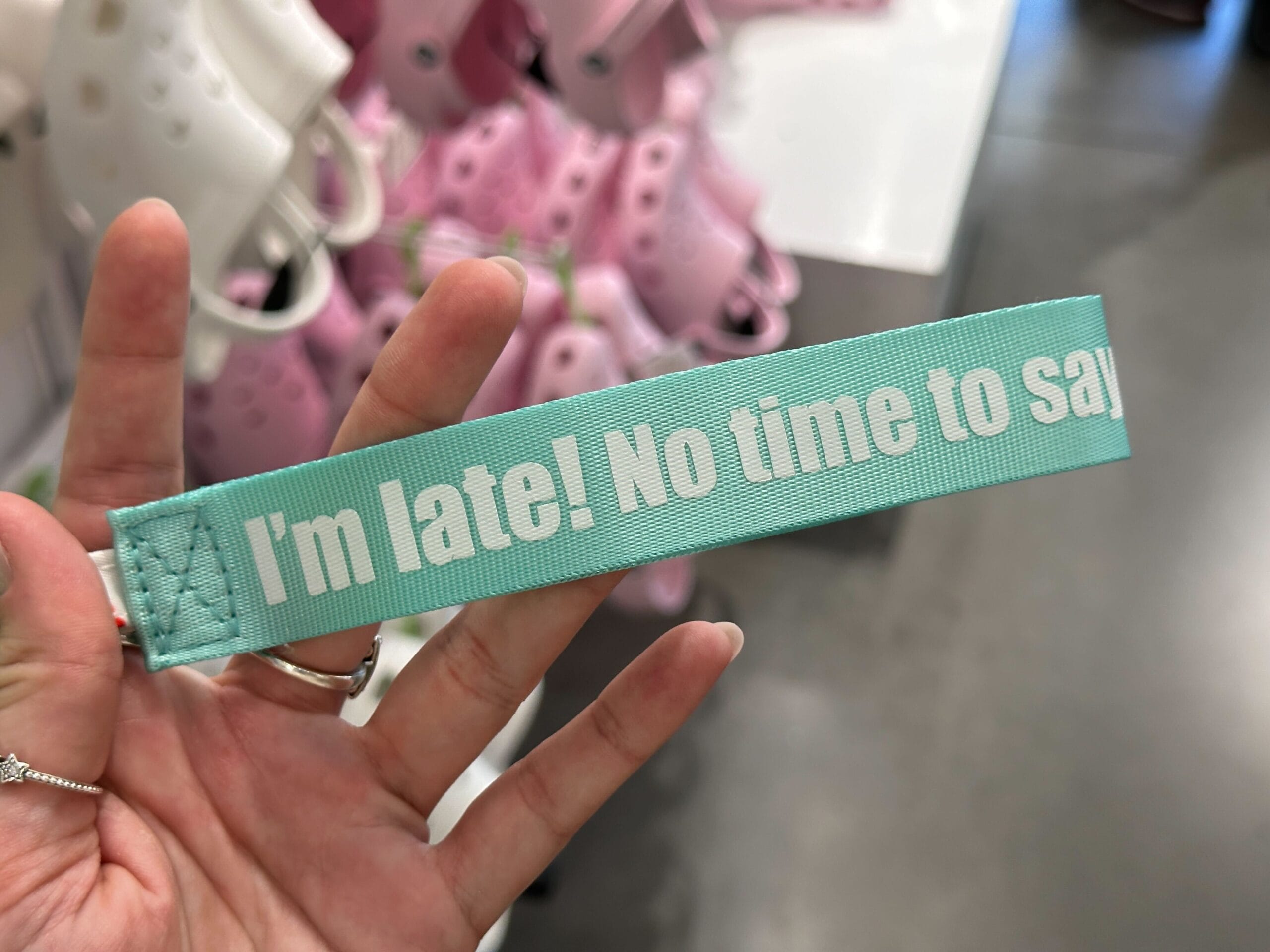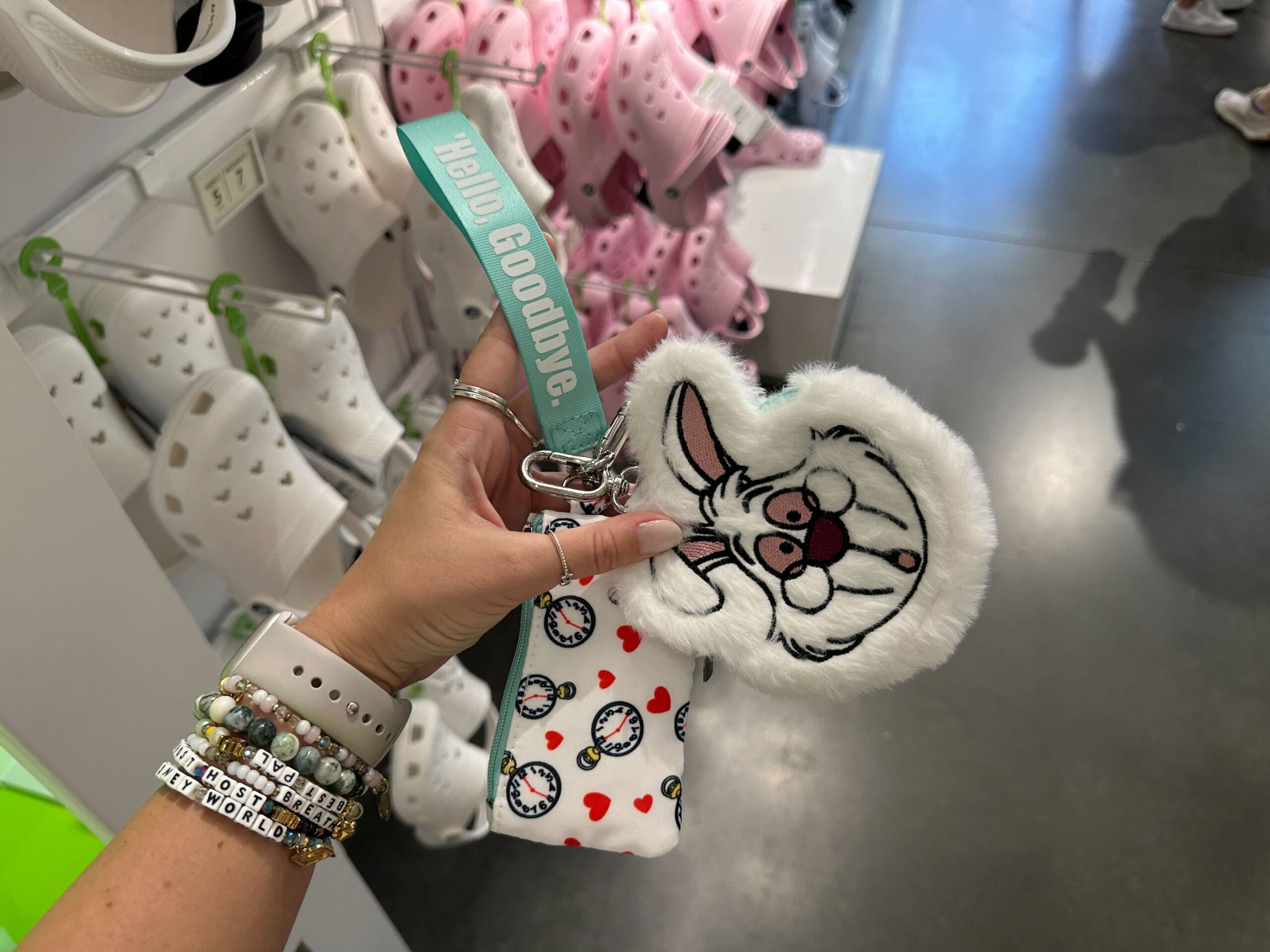 The coin purse is in the shape of the White Rabbit’s head. Beside that is a mint green strap that reads “I’m late! No time to say ‘hello, goodbye.” The additional small bag has a pattern of the White Rabbit’s clock and red hearts.