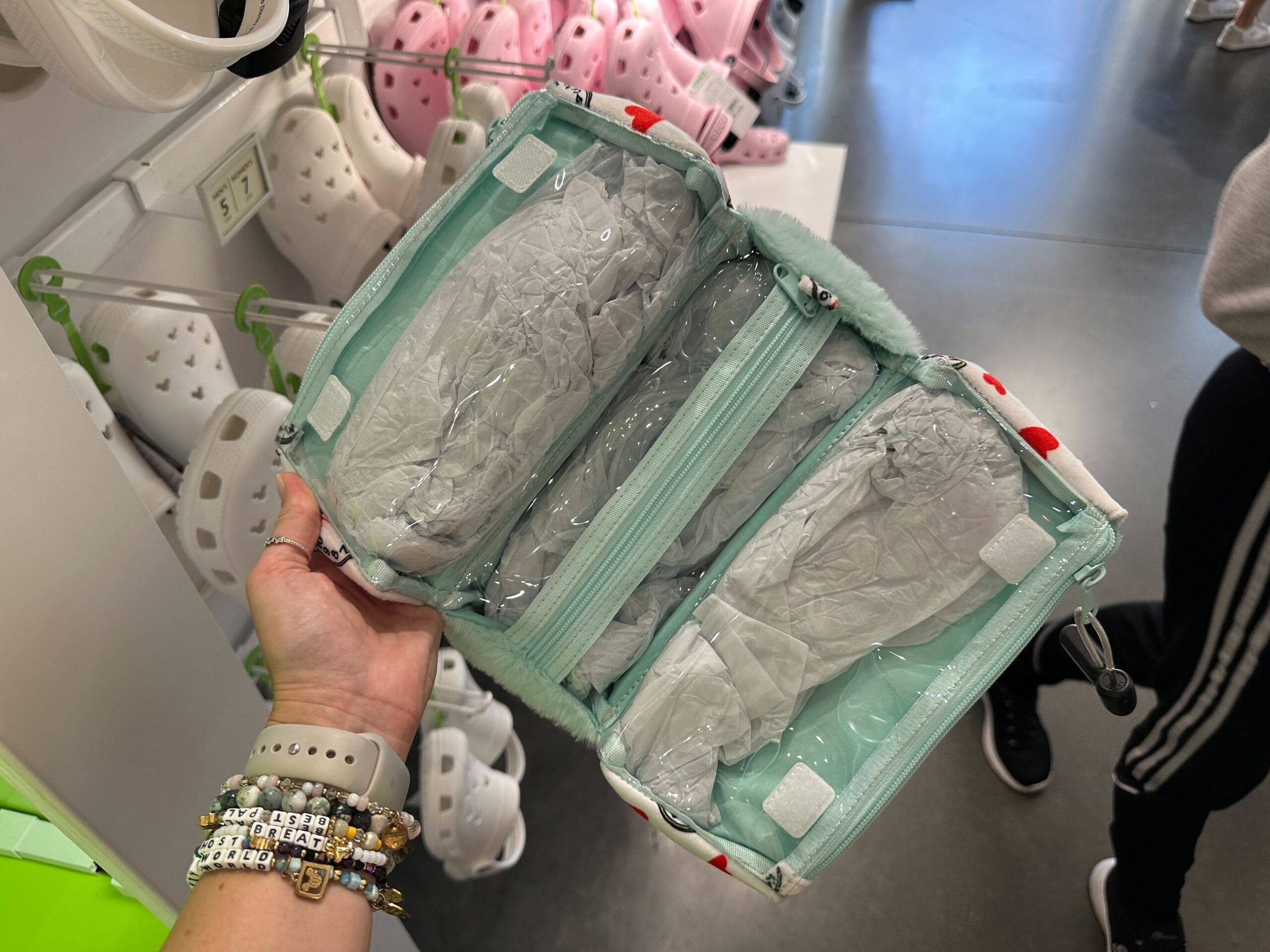 On the inside of the bag are three clear, vinyl, zippered pockets. The interior details match the mint green bottom half of the bag.