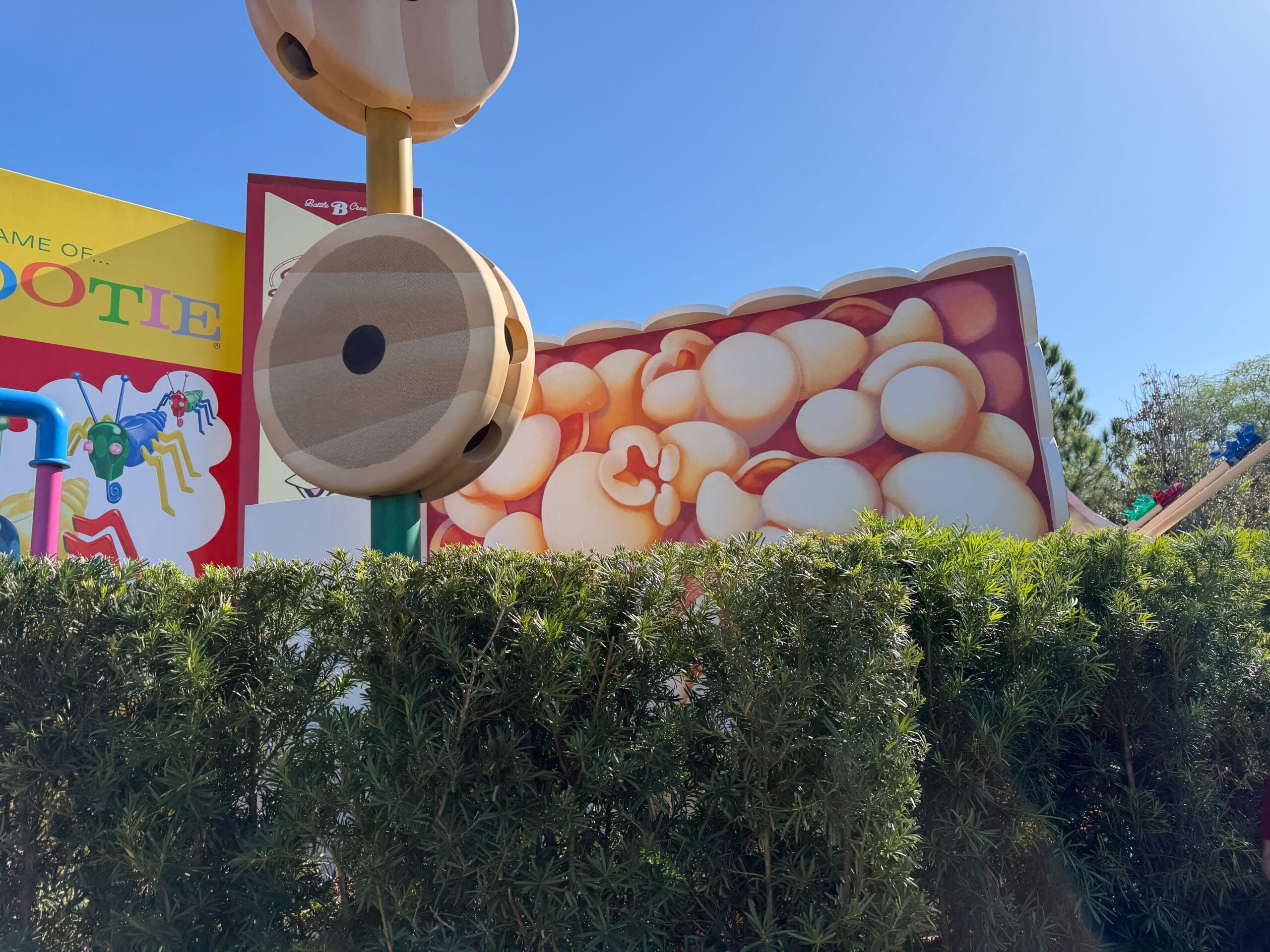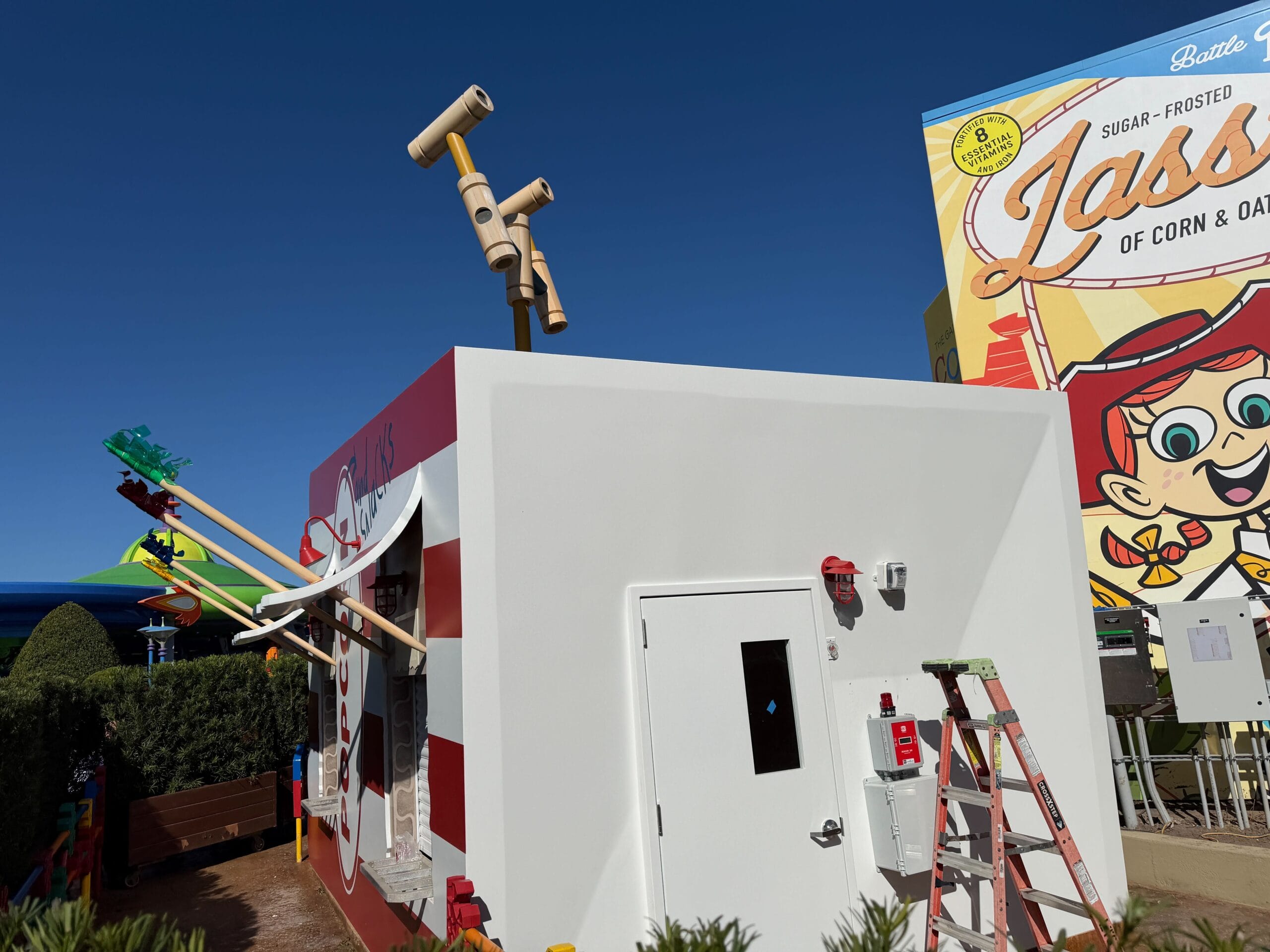 Moving back into Toy Story Land, we’ve been watching the progress of the new snack stand located in the space previously holding a Toy Story Land sign. The new kiosk comes after Disney added shades to the Woody’s Lunch Box seating. Disney recently removed construction walls from the Toy Story Mania exit queue after nearly four years.