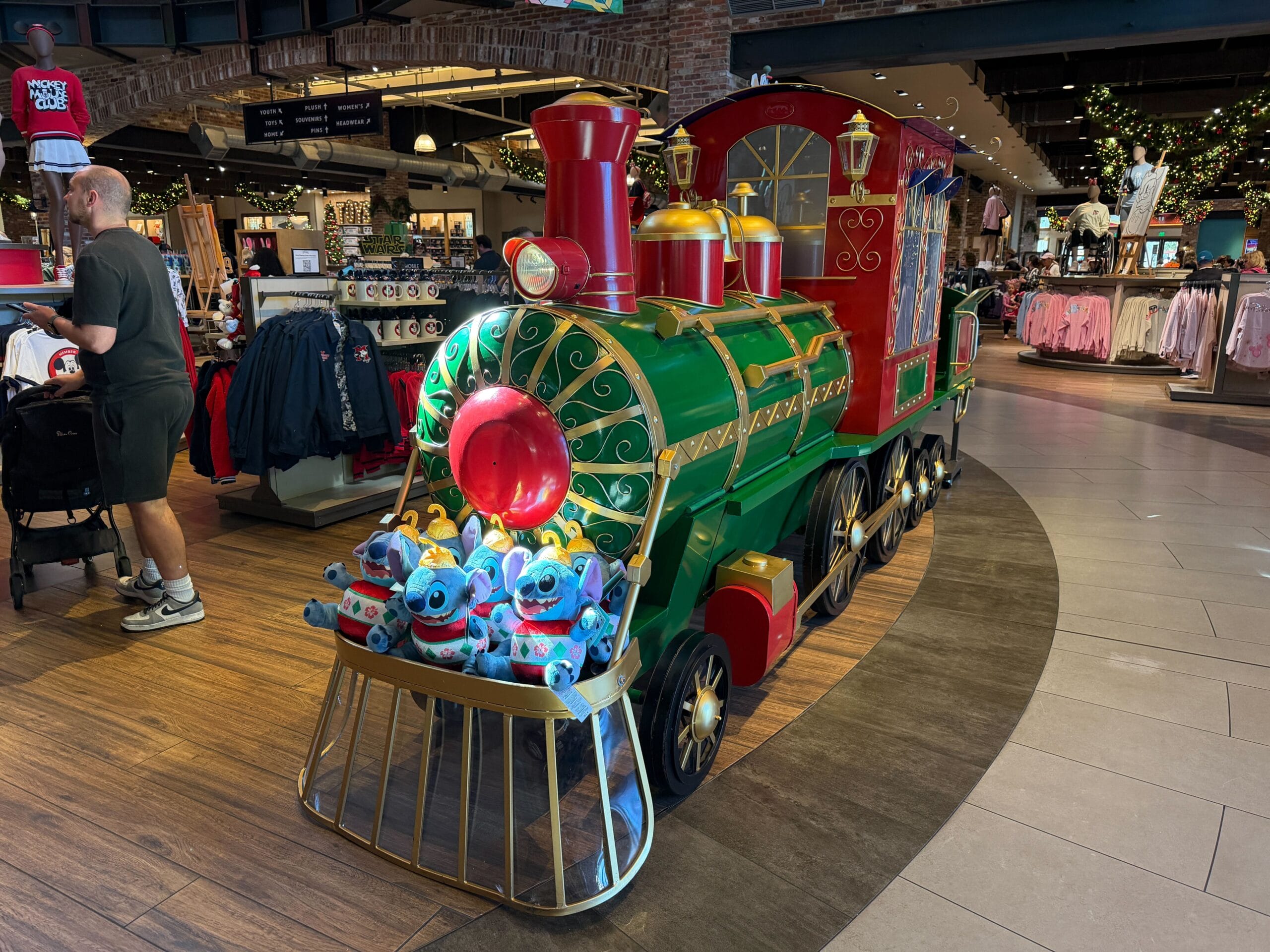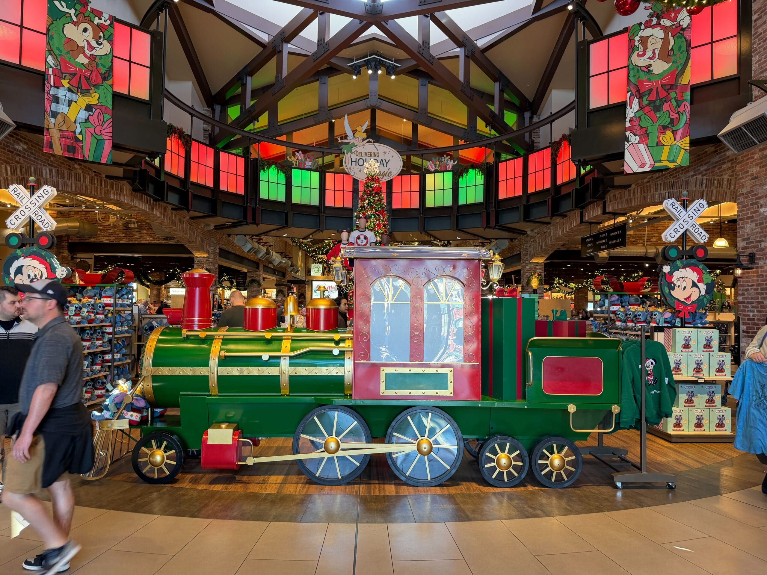 The illuminated panels and lights around the top of the store are now red and green. There’s a train engine in the center of the store, beneath garland and Chip ‘n Dale holiday banners. Christmas merchandise is available in this section of the store.