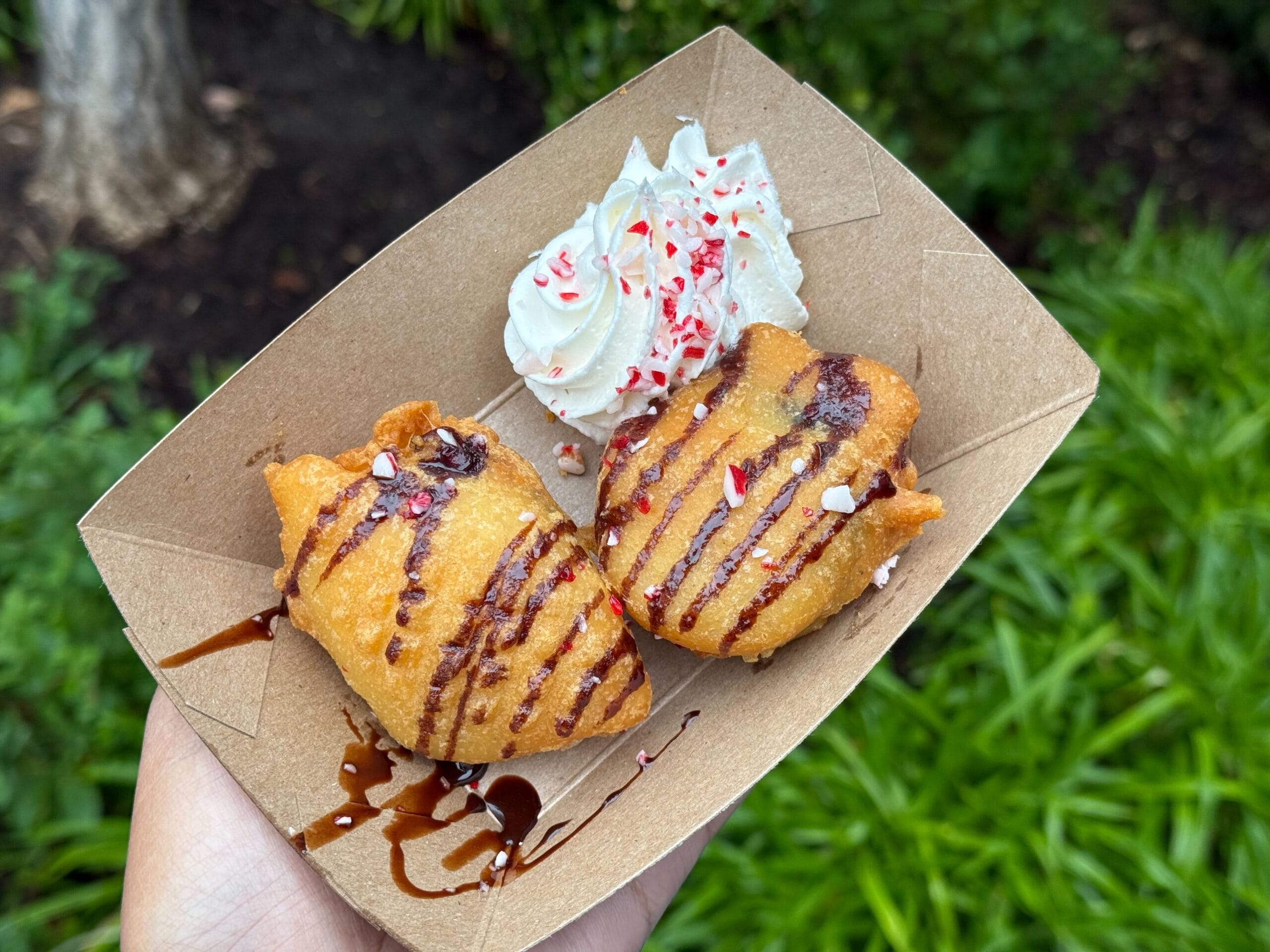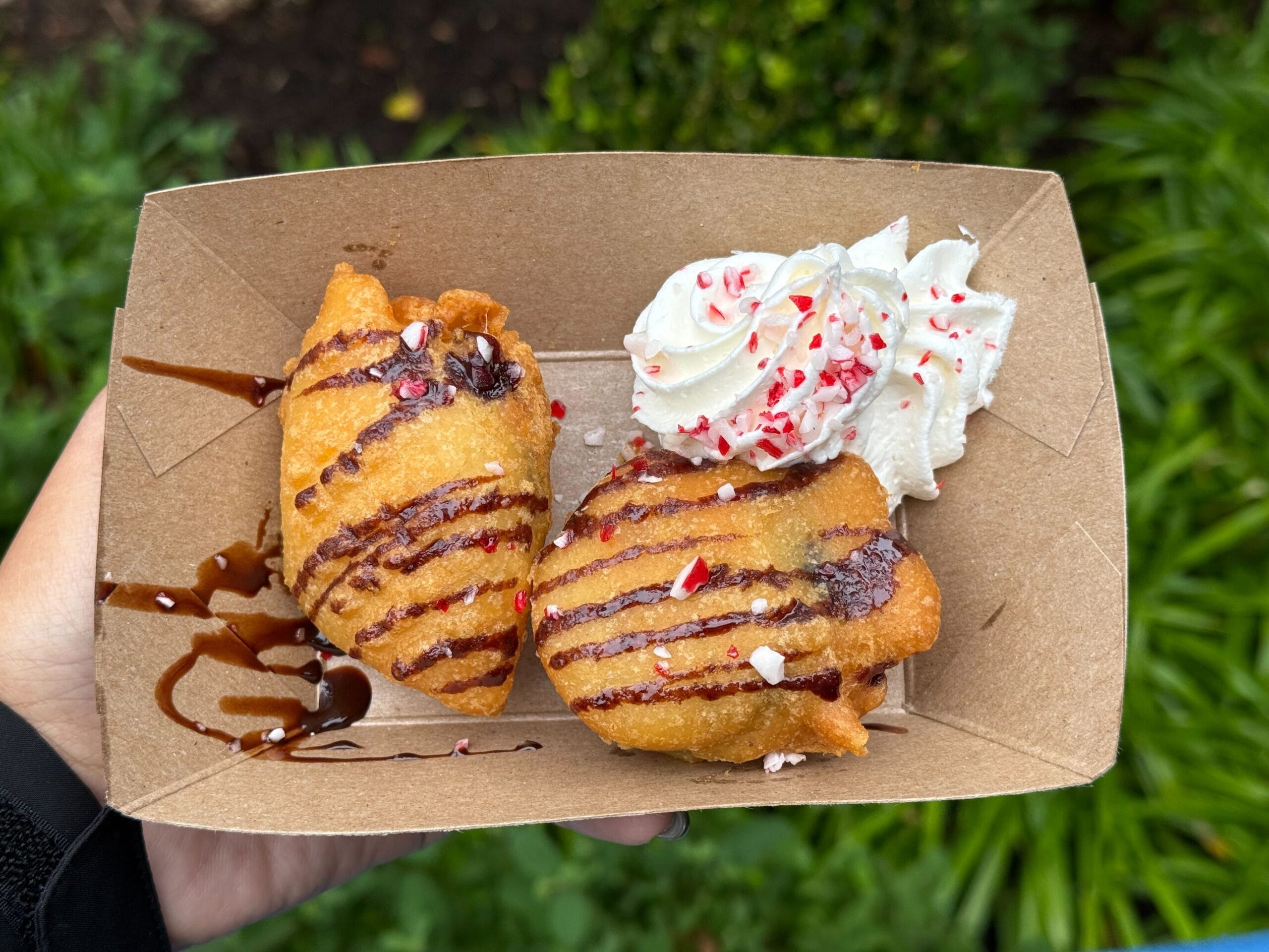 Battered and fried crème-filled cookies with whipped topping, chocolate drizzle, and crushed peppermint candy