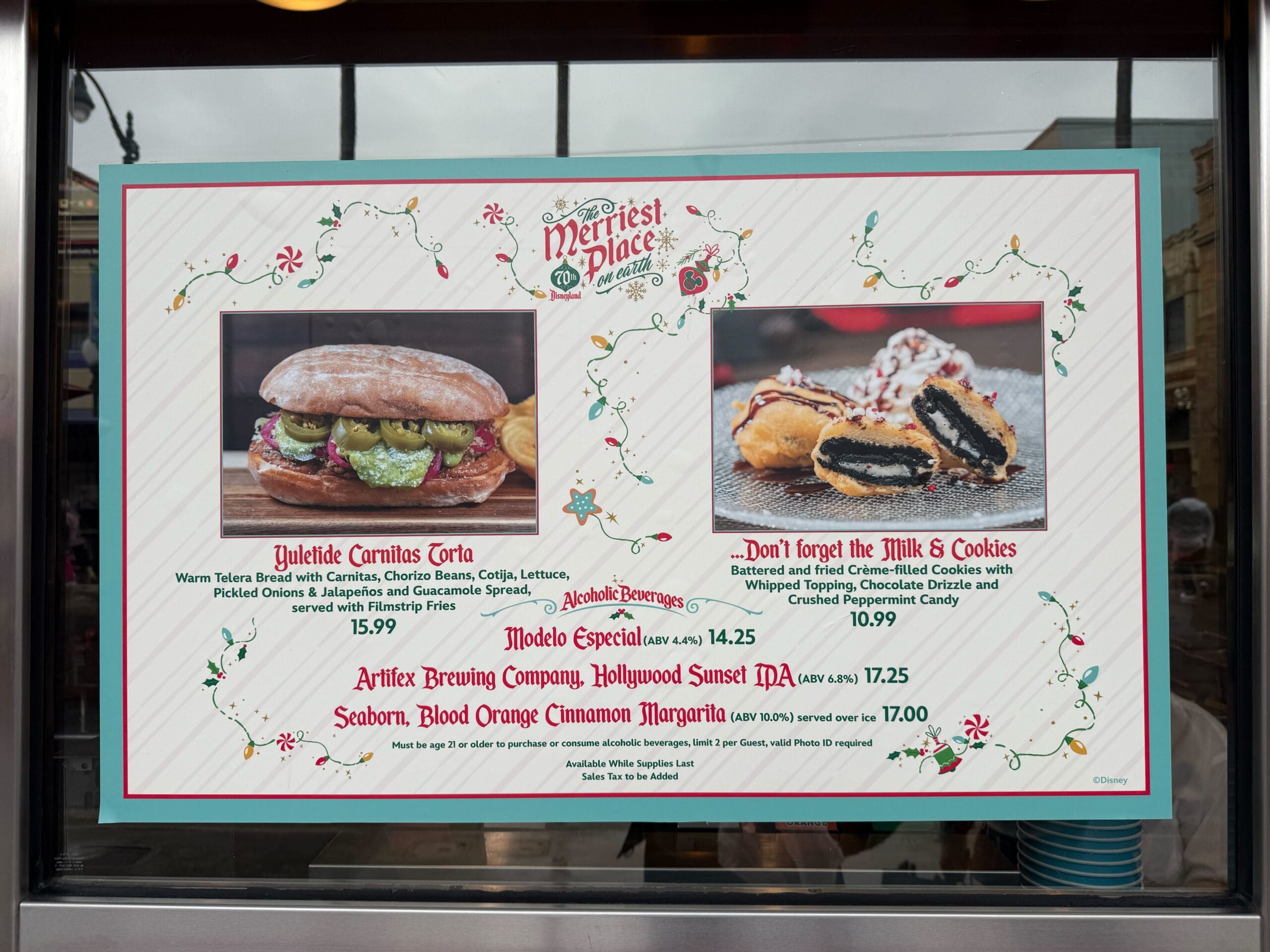 Award Wieners at Disney California Adventure has the new Yuletide Carnitas Torta and “Don’t forget the Milk & Cookies” fried Oreos available for the 2025 holiday season.